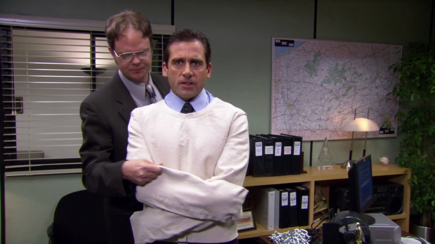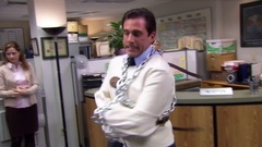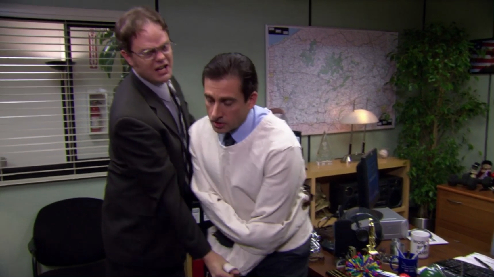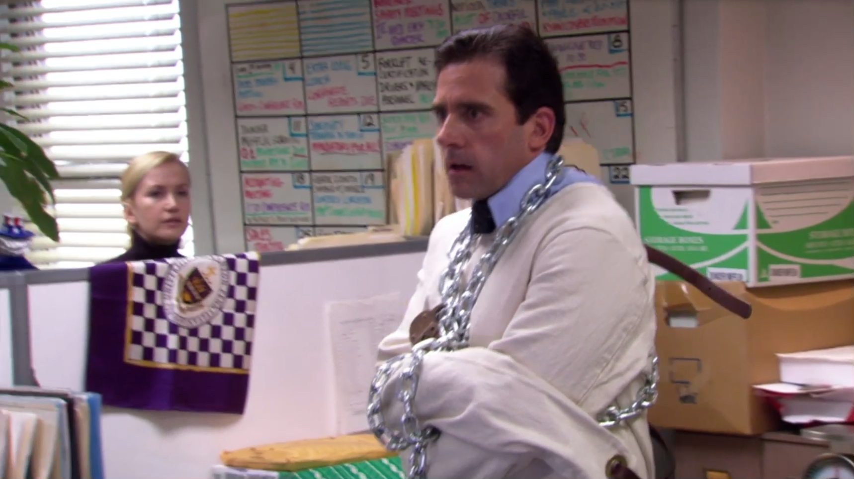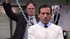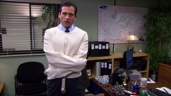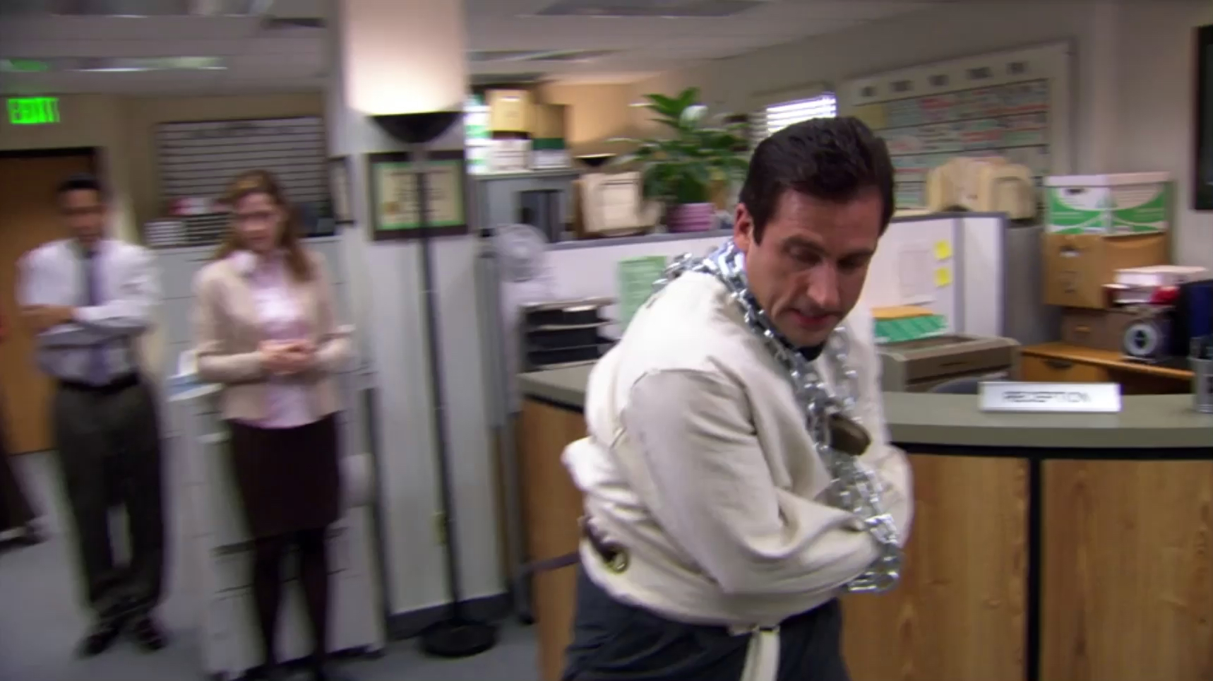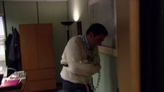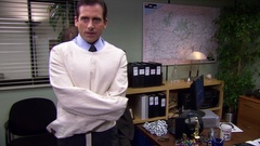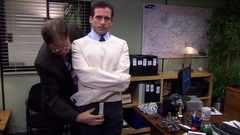 Michael tries to show off his straitjacket escape, but Jim hides the key to the chains.