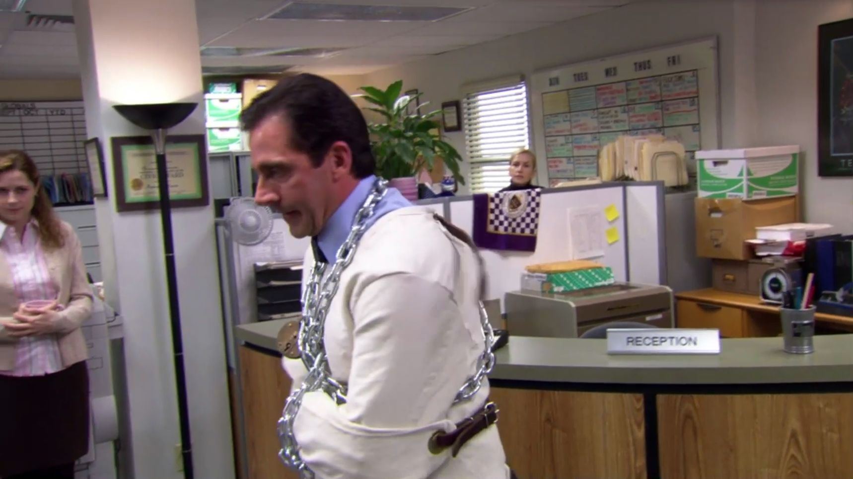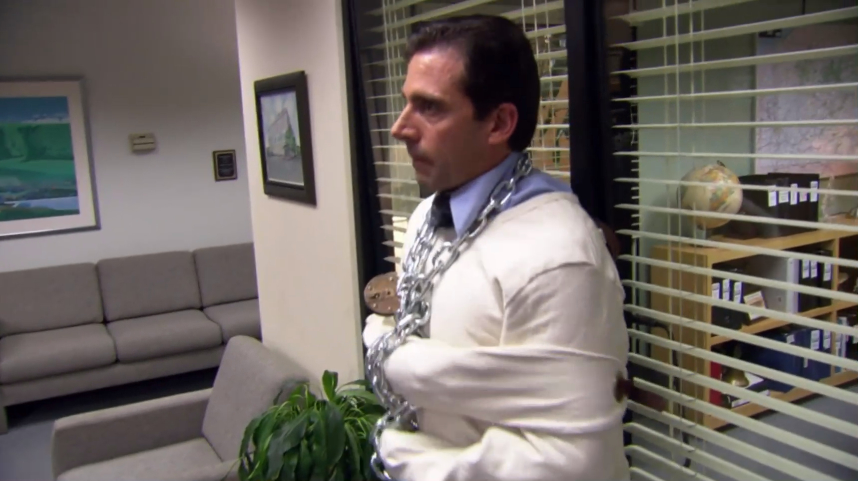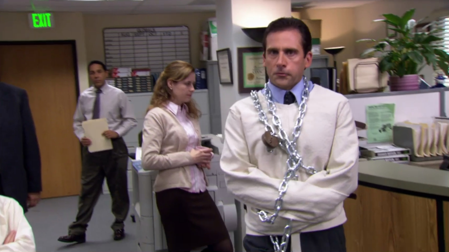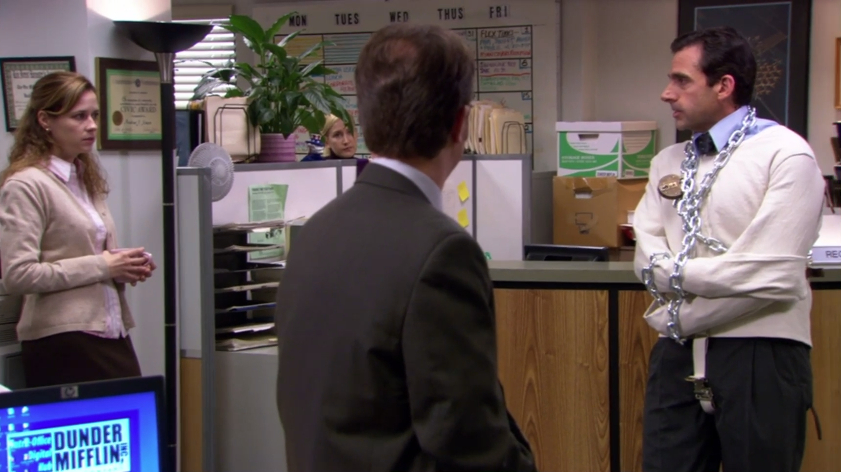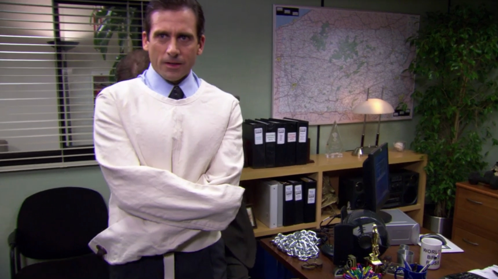 Michael tries to show off his straitjacket escape, but Jim hides the key to the chains.