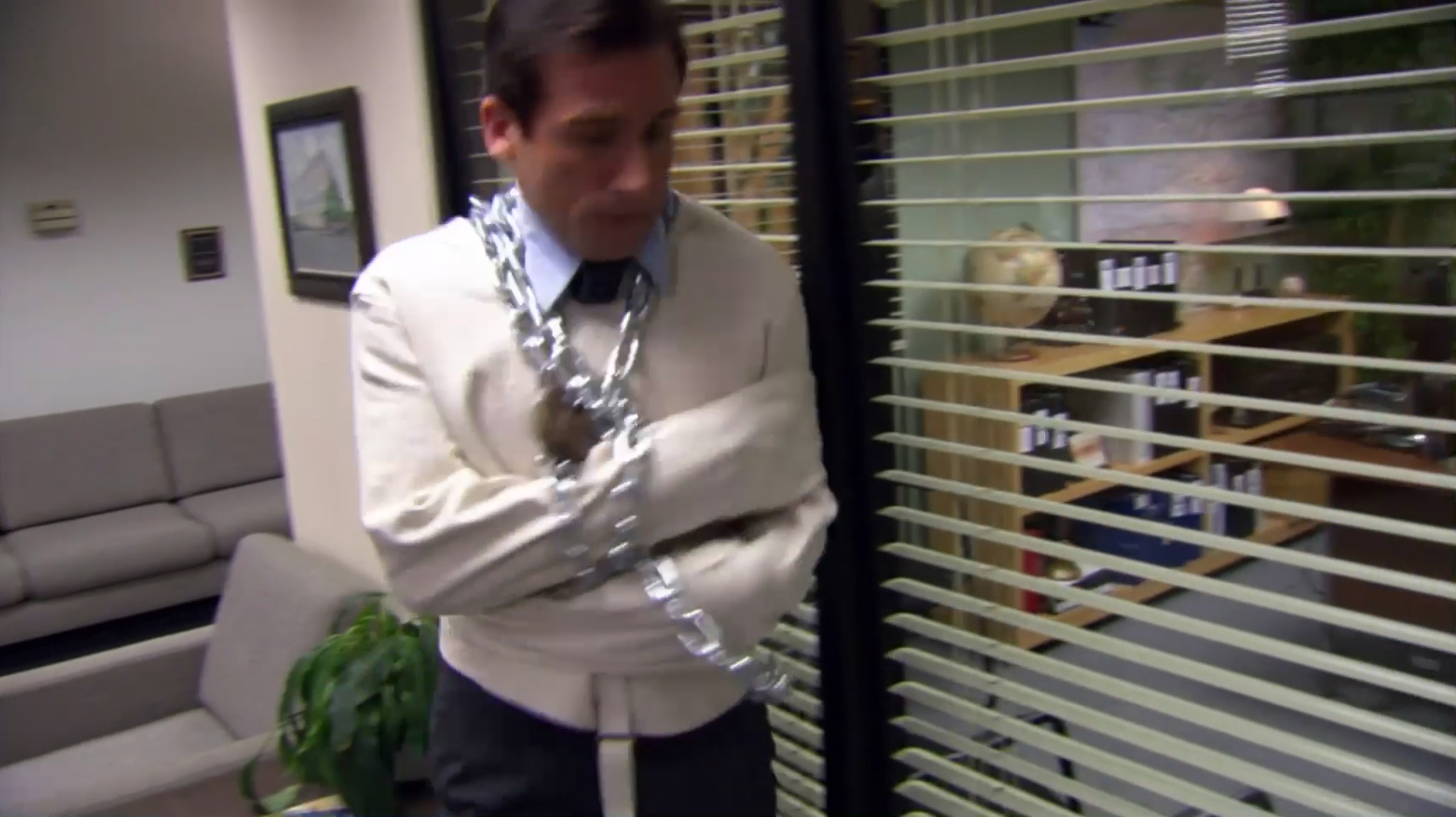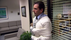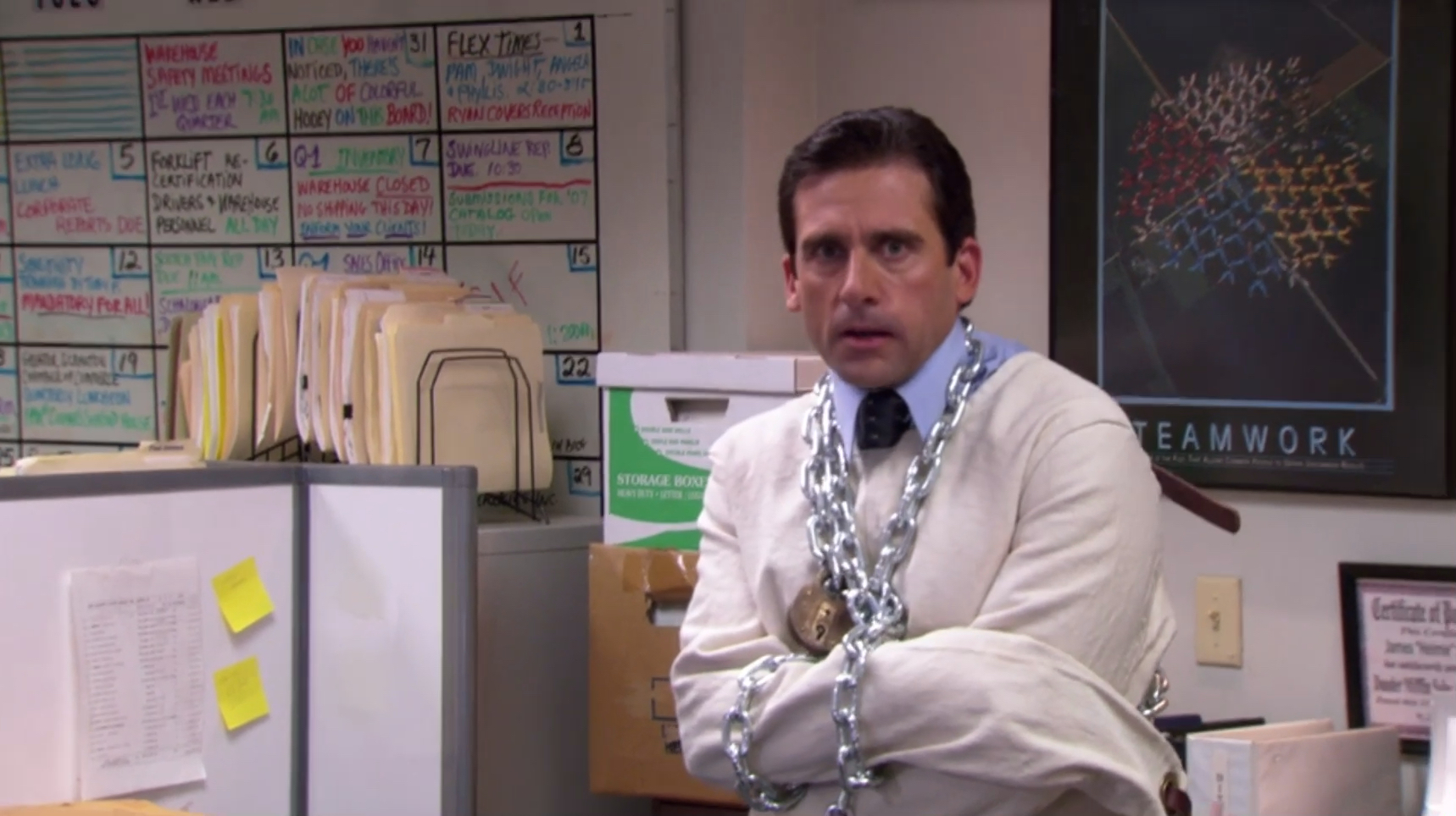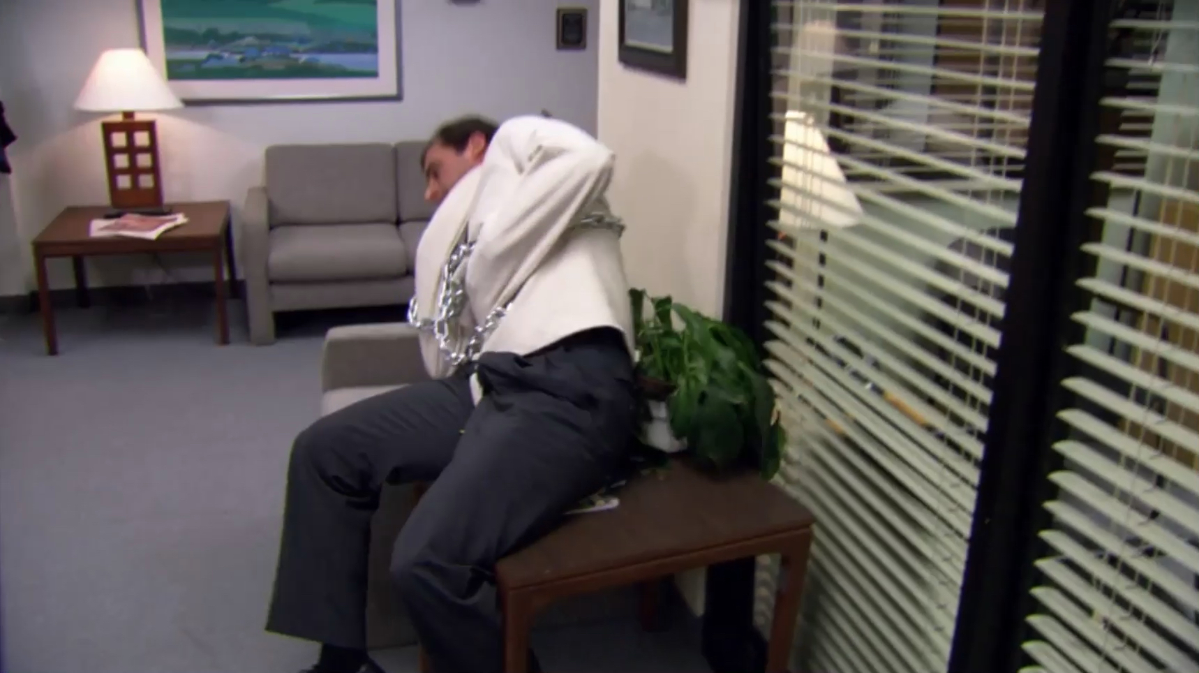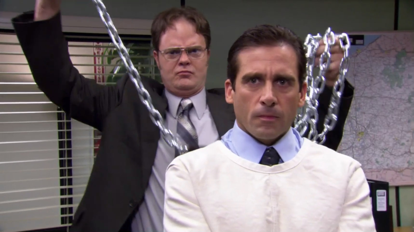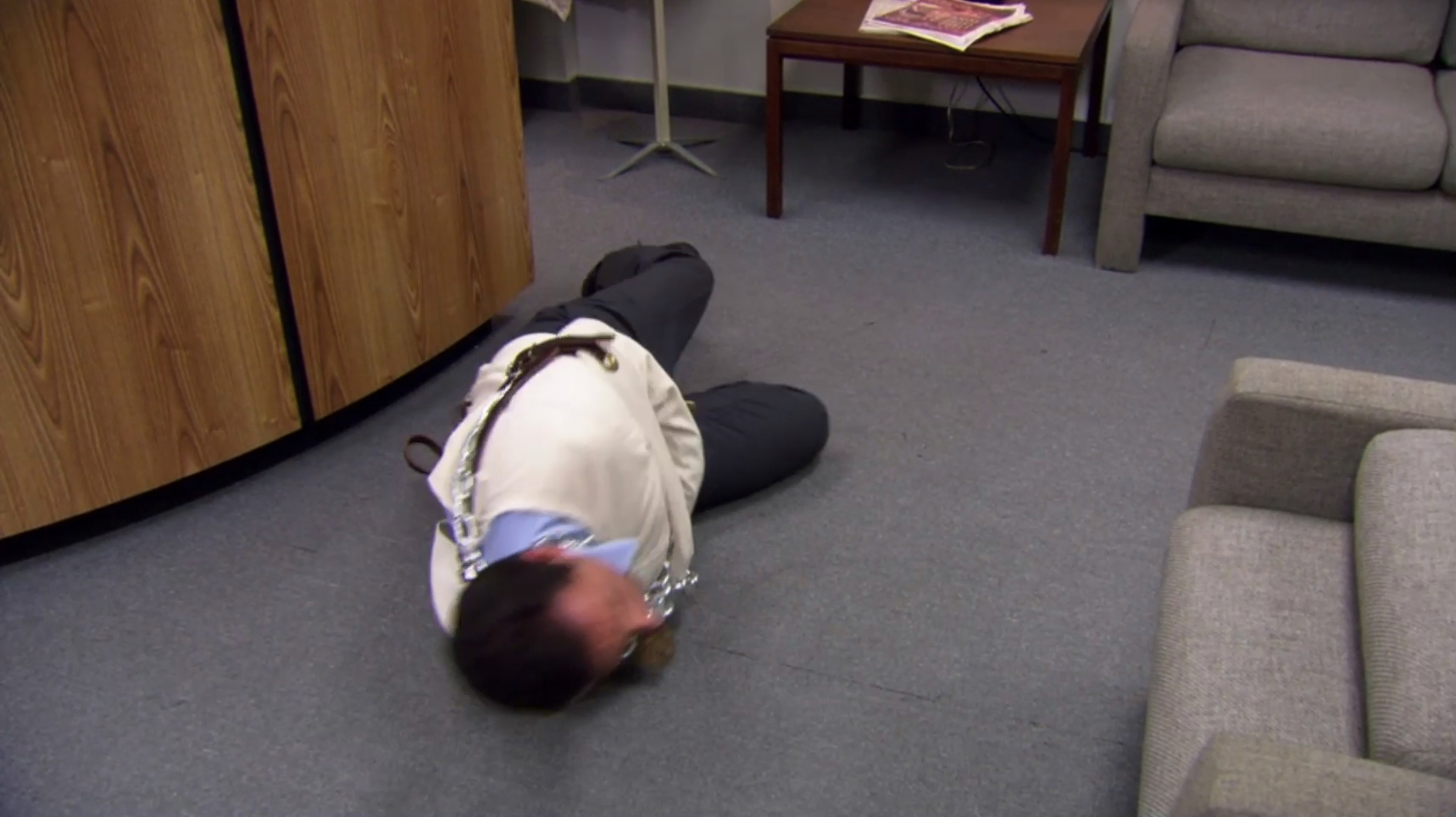 Michael tries to show off his straitjacket escape, but Jim hides the key to the chains.