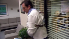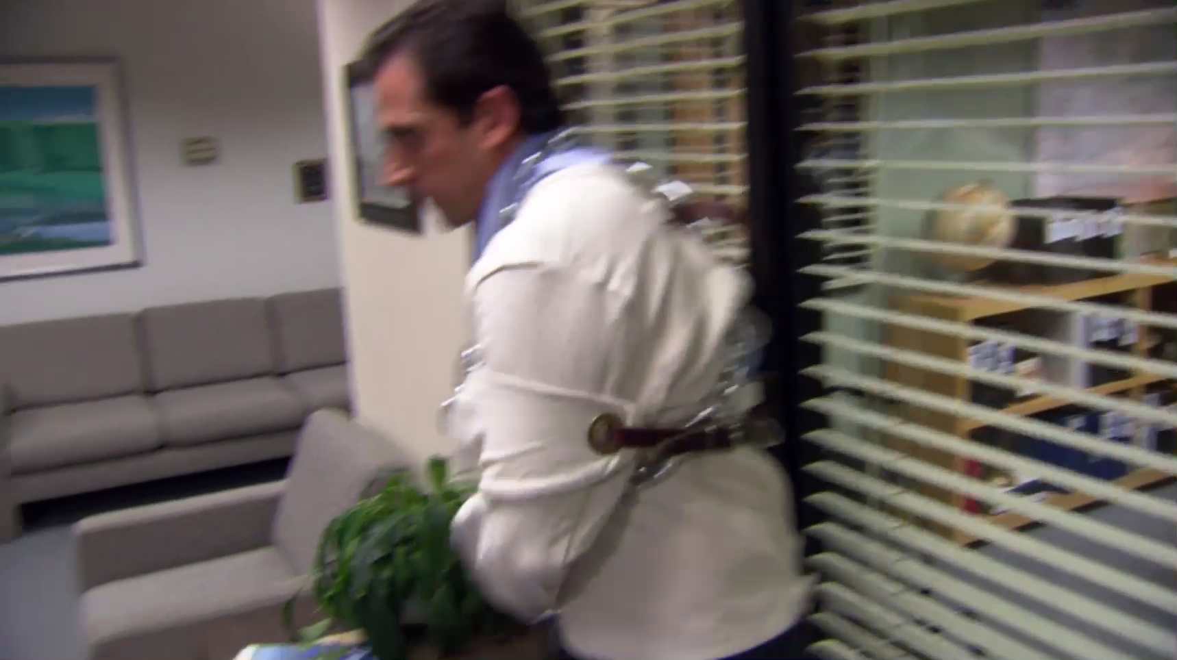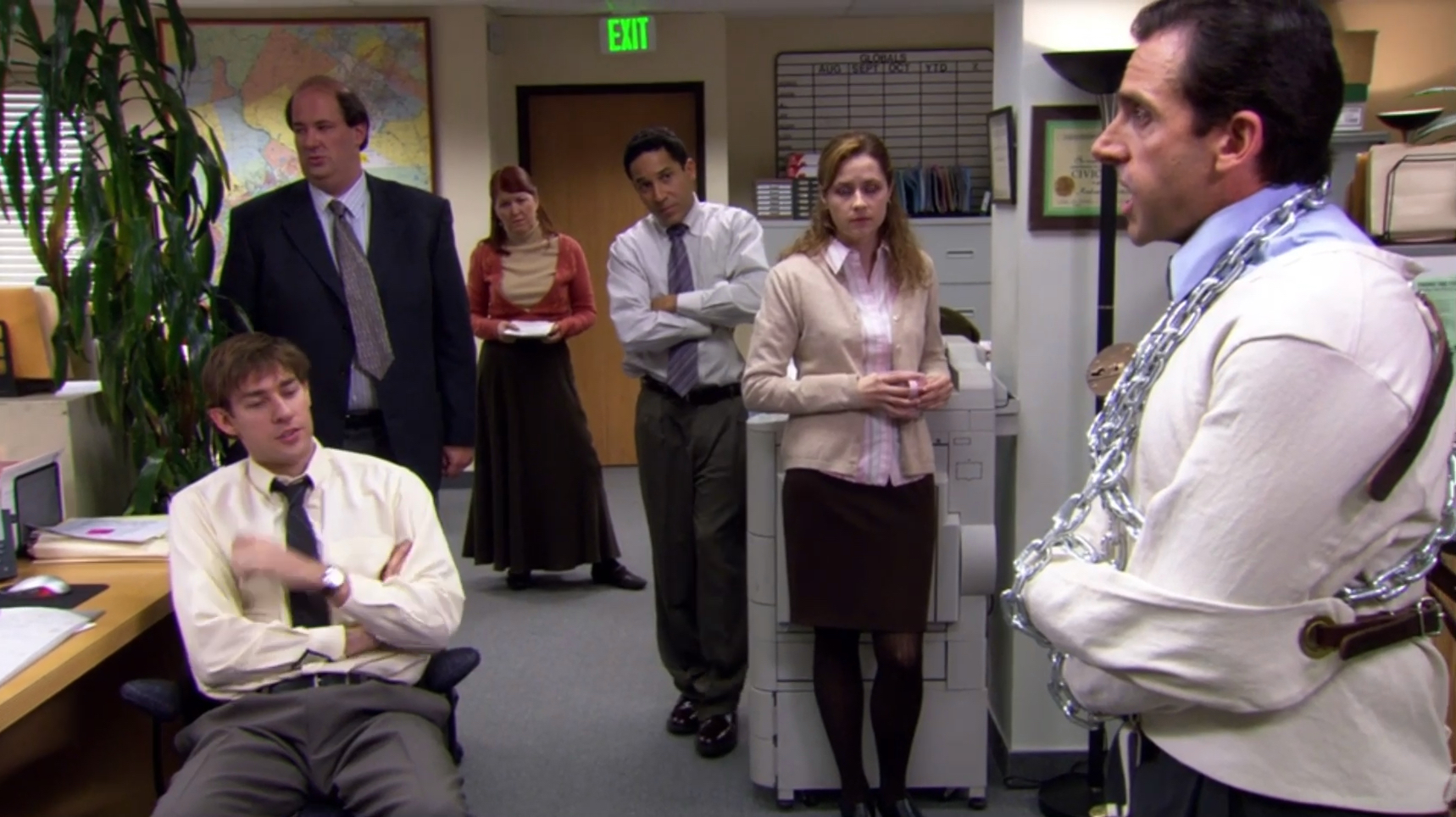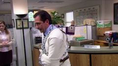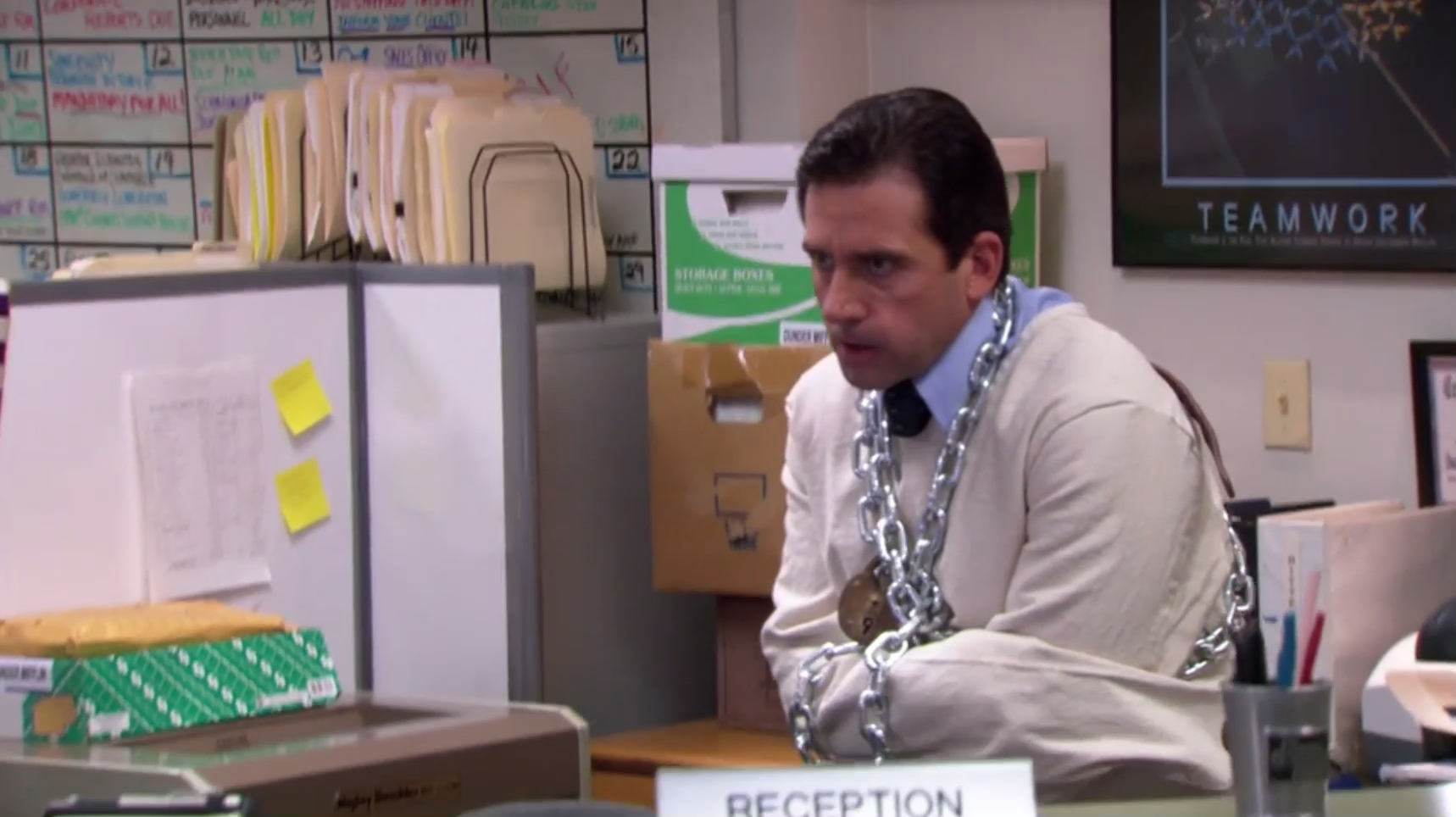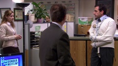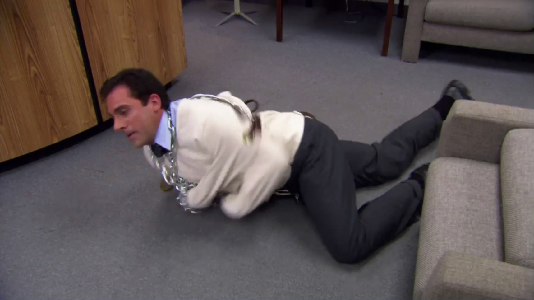 Michael tries to show off his straitjacket escape, but Jim hides the key to the chains.