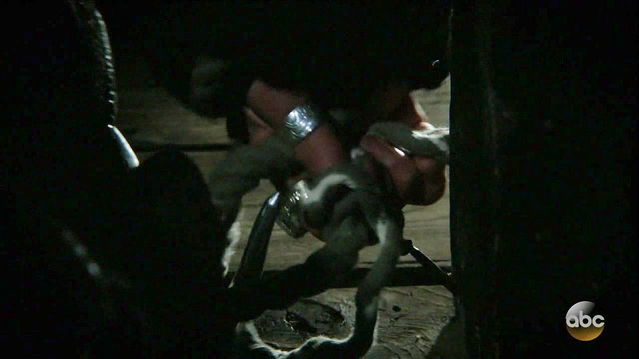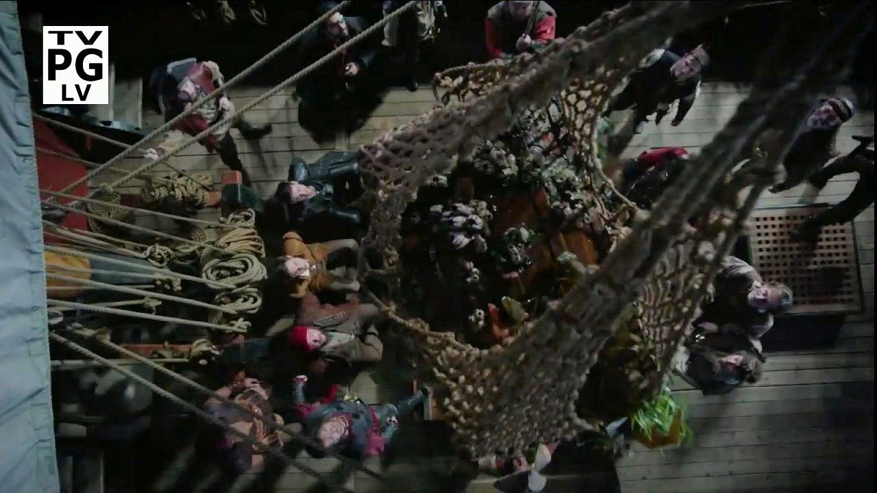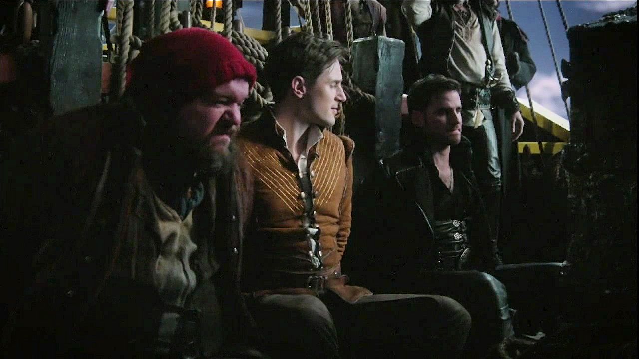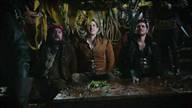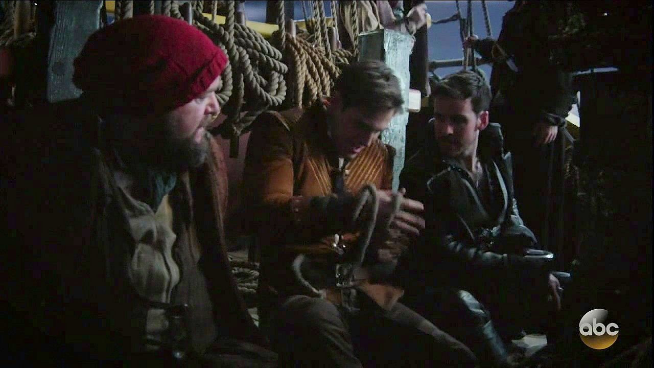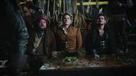 Smee, Henry and Hook are captured and tied up by Blackbeard.