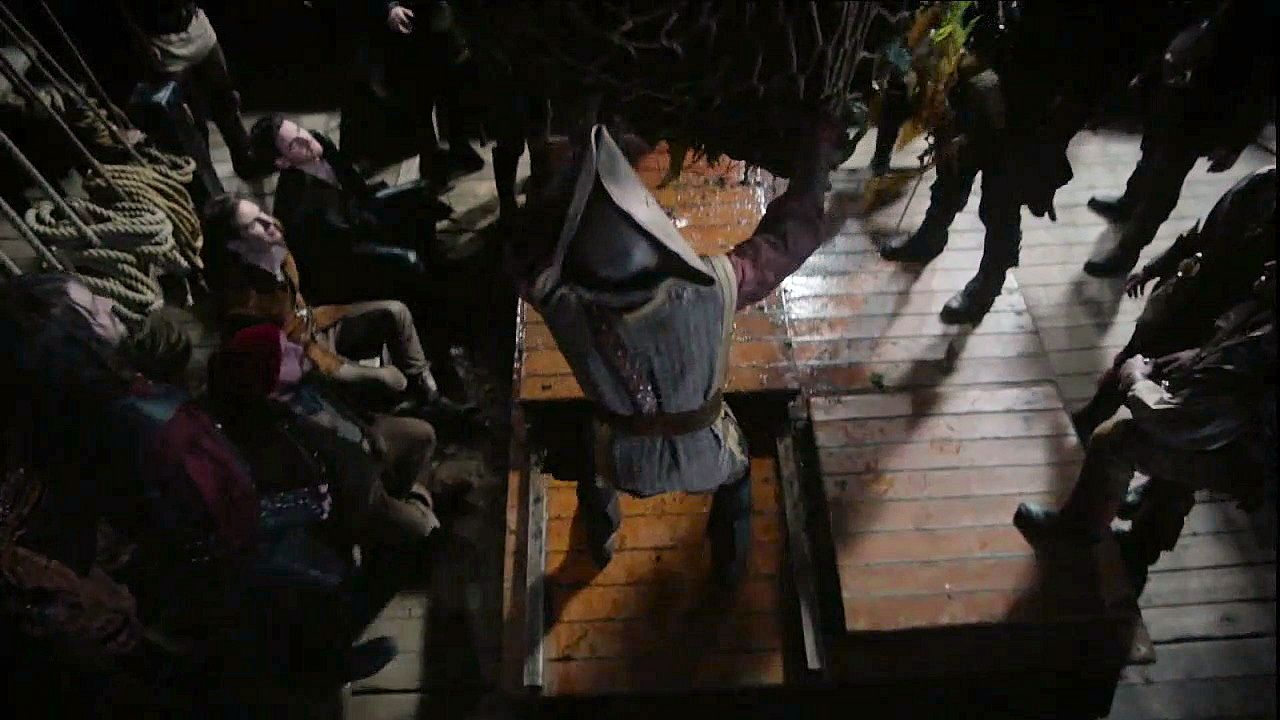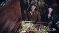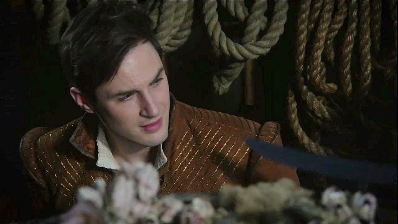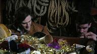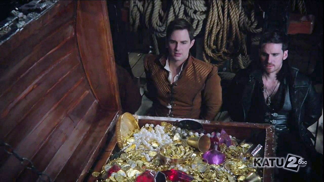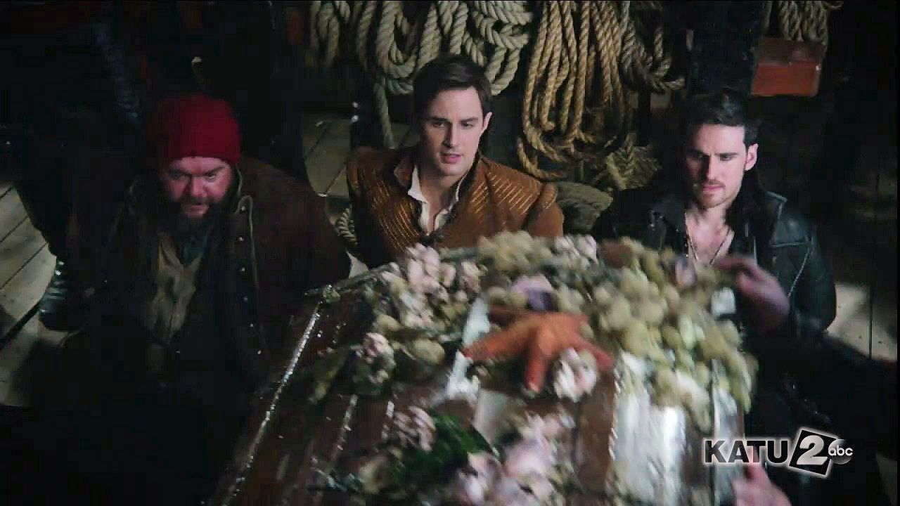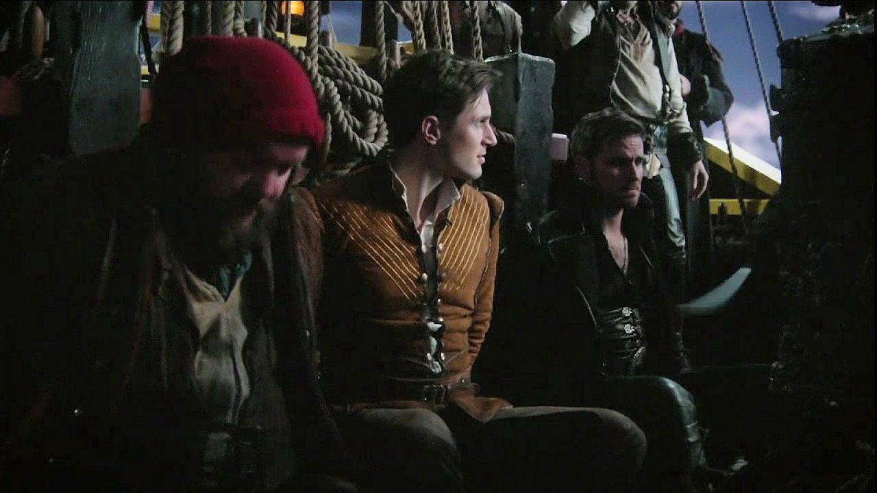 Smee, Henry and Hook are captured and tied up by Blackbeard.
