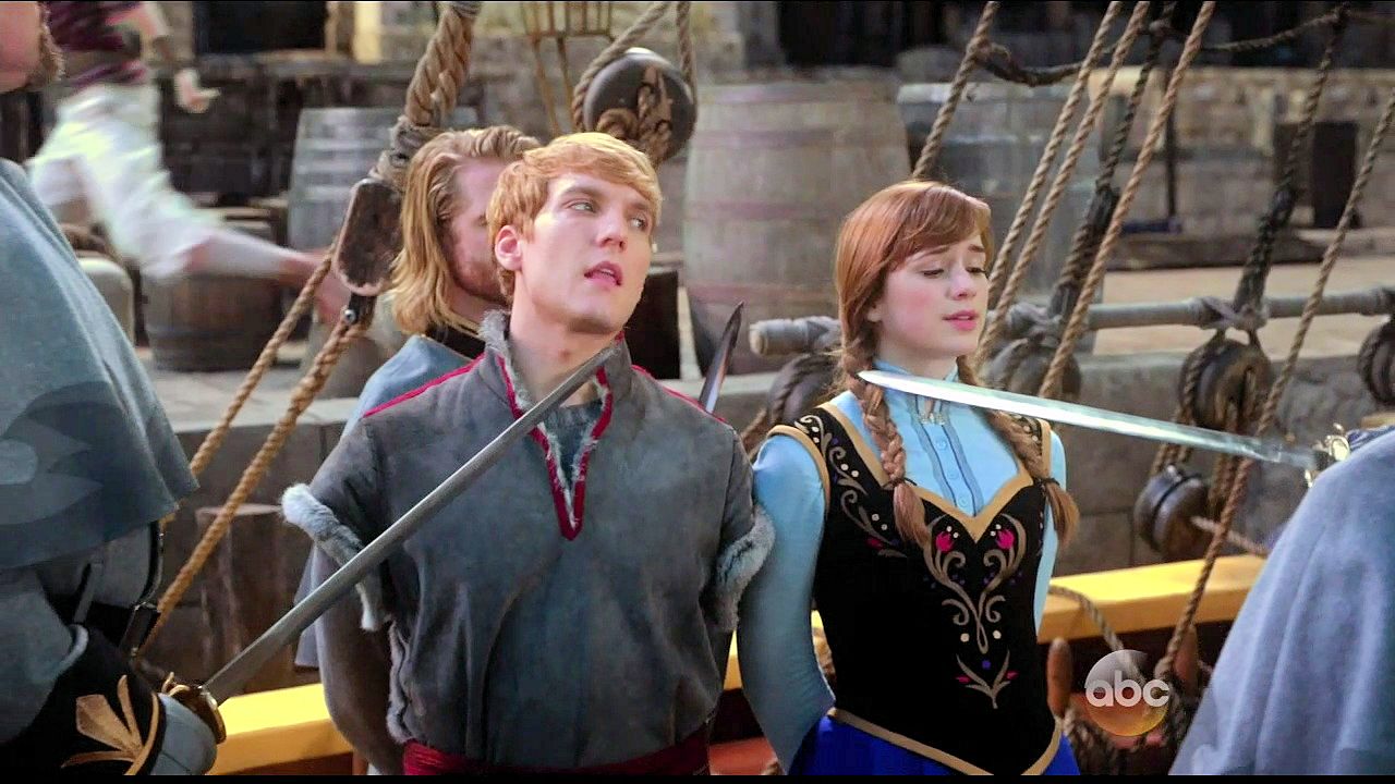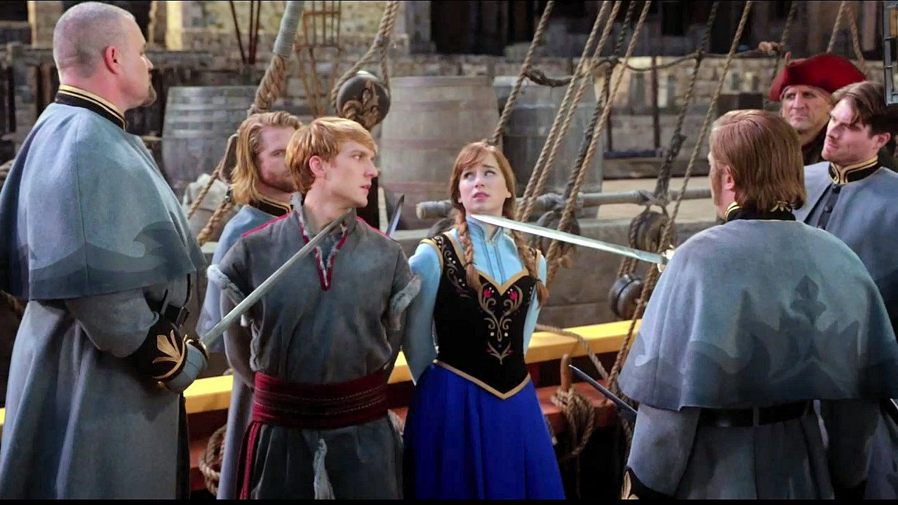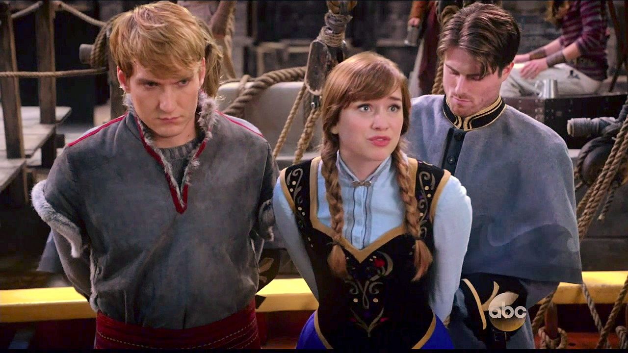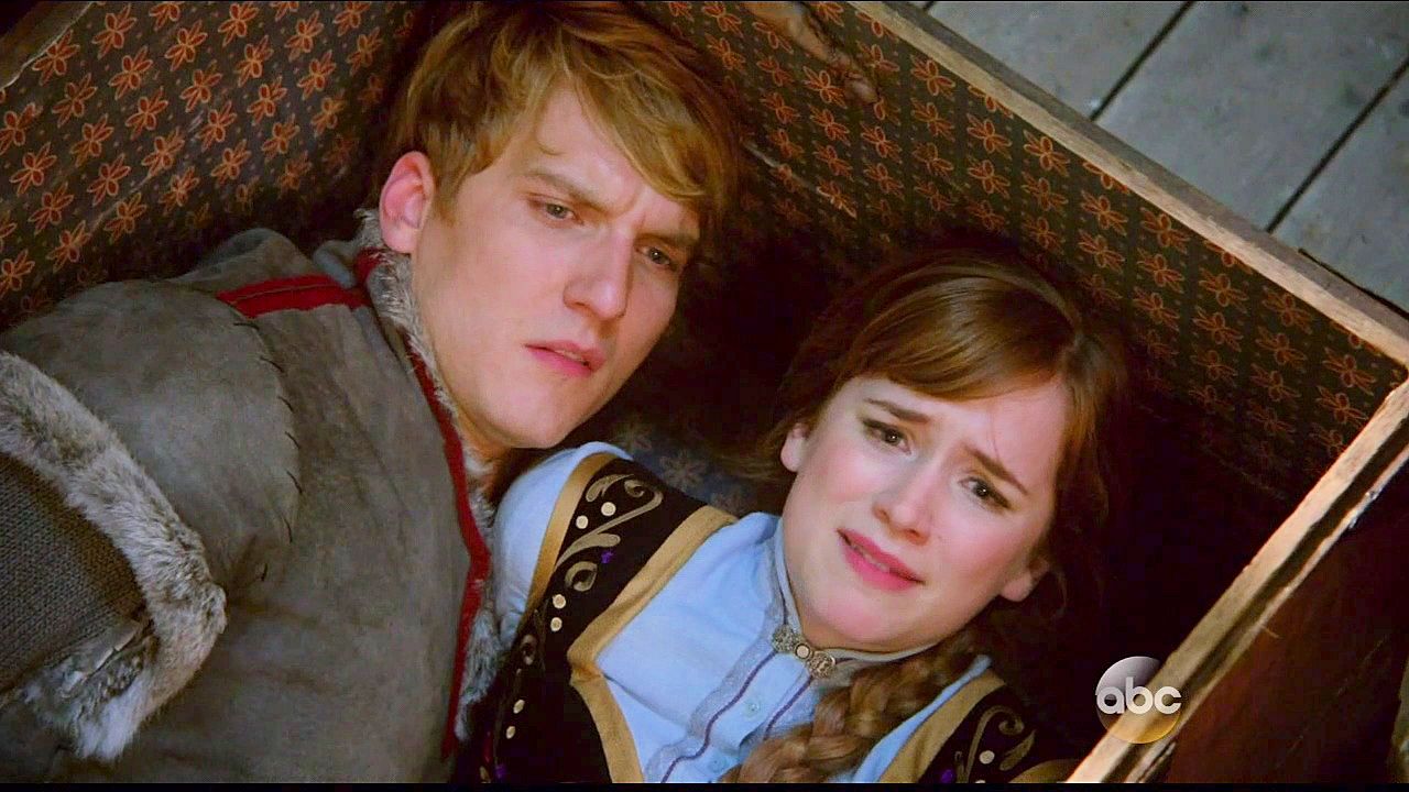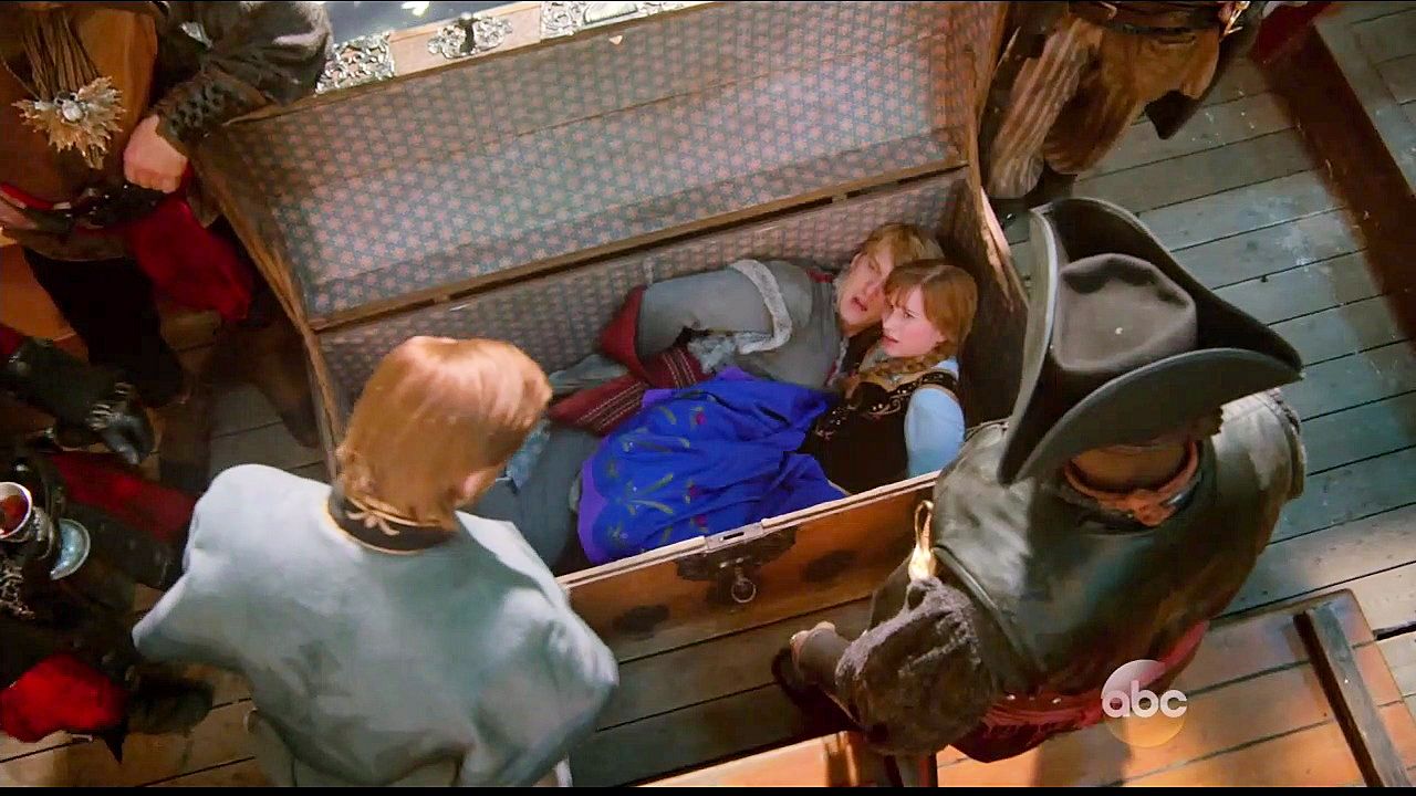 Kristoff and Anna are tied up in a trunk and dumped into the sea by Hans and Blackbeard.