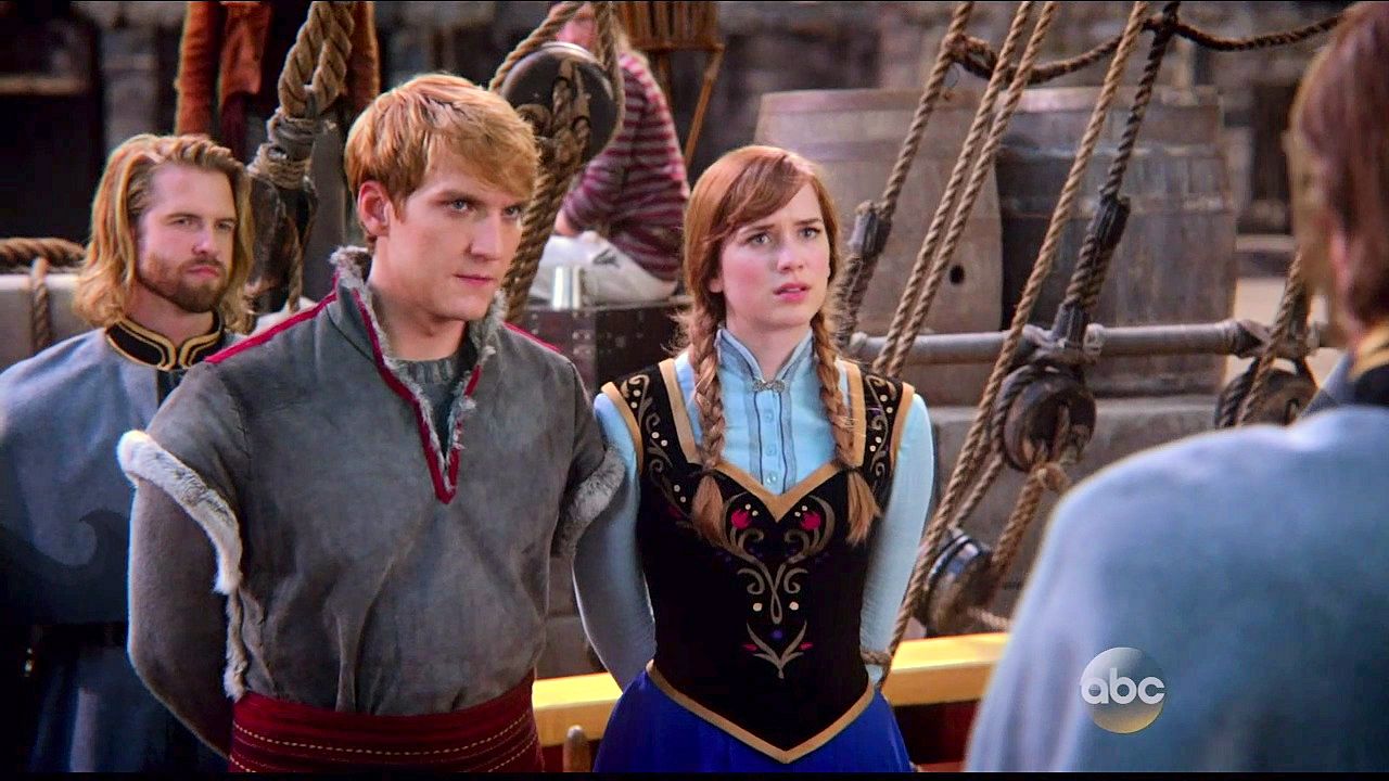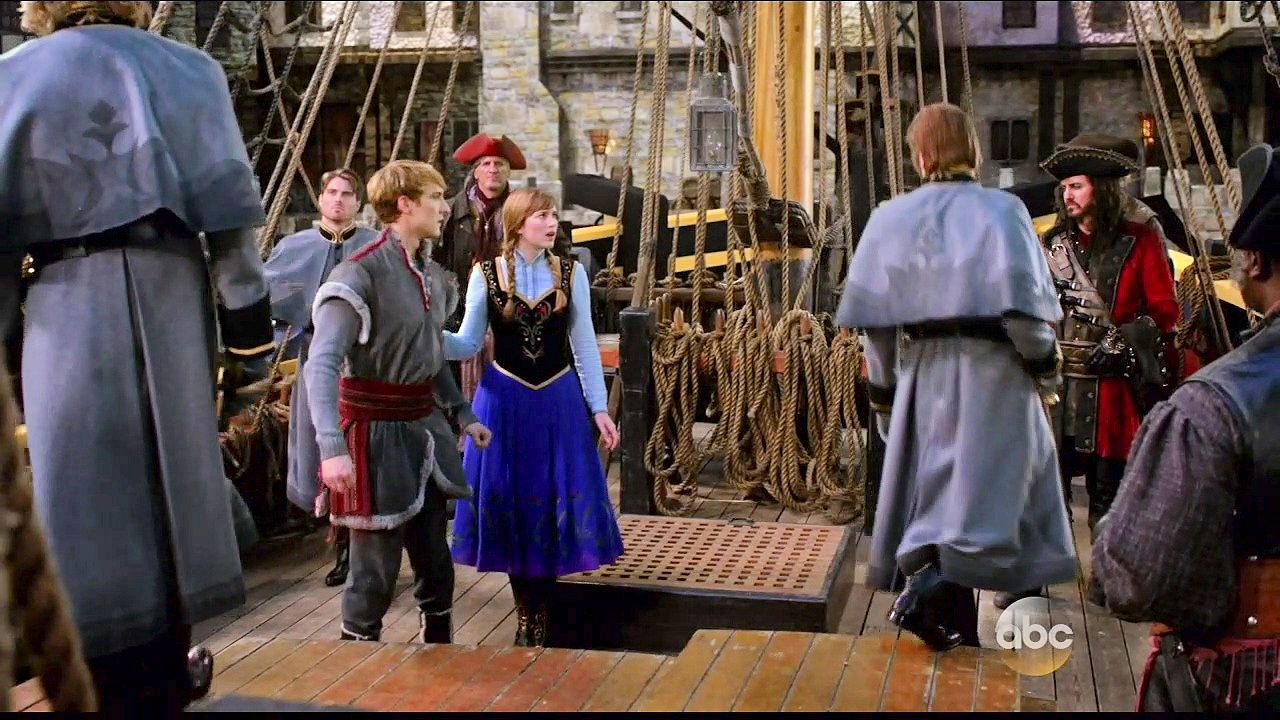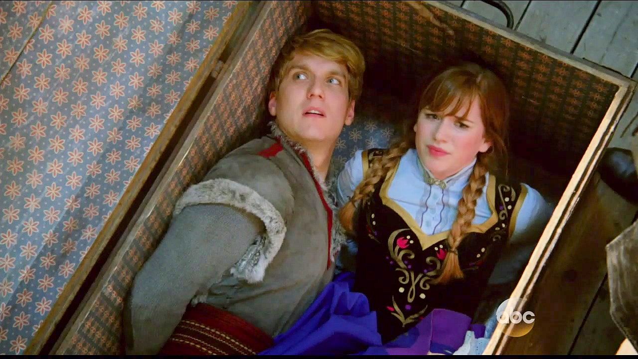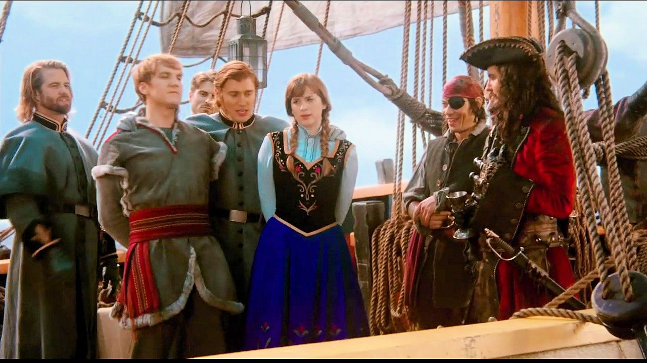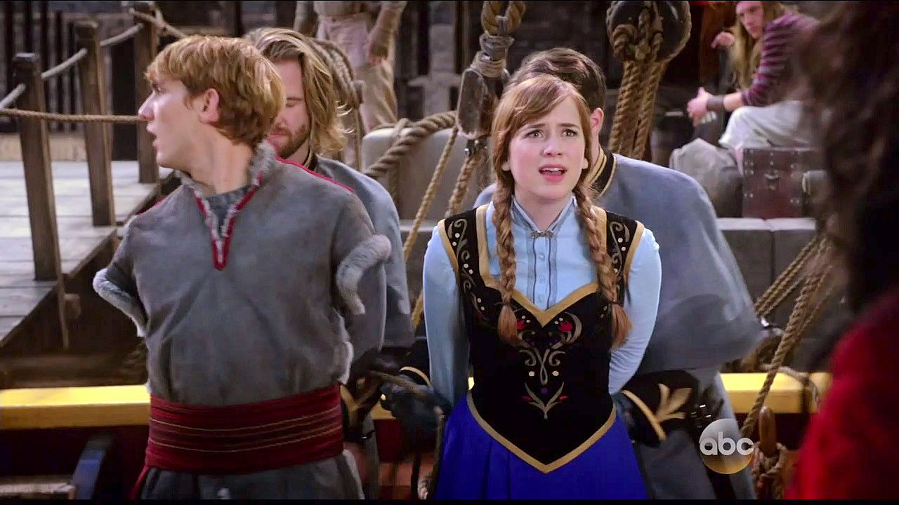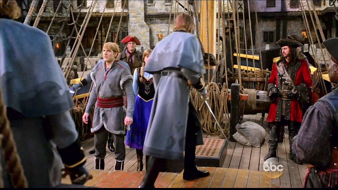 Kristoff and Anna are tied up in a trunk and dumped into the sea by Hans and Blackbeard.