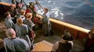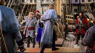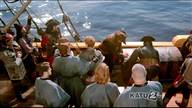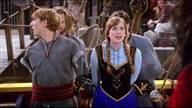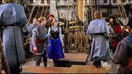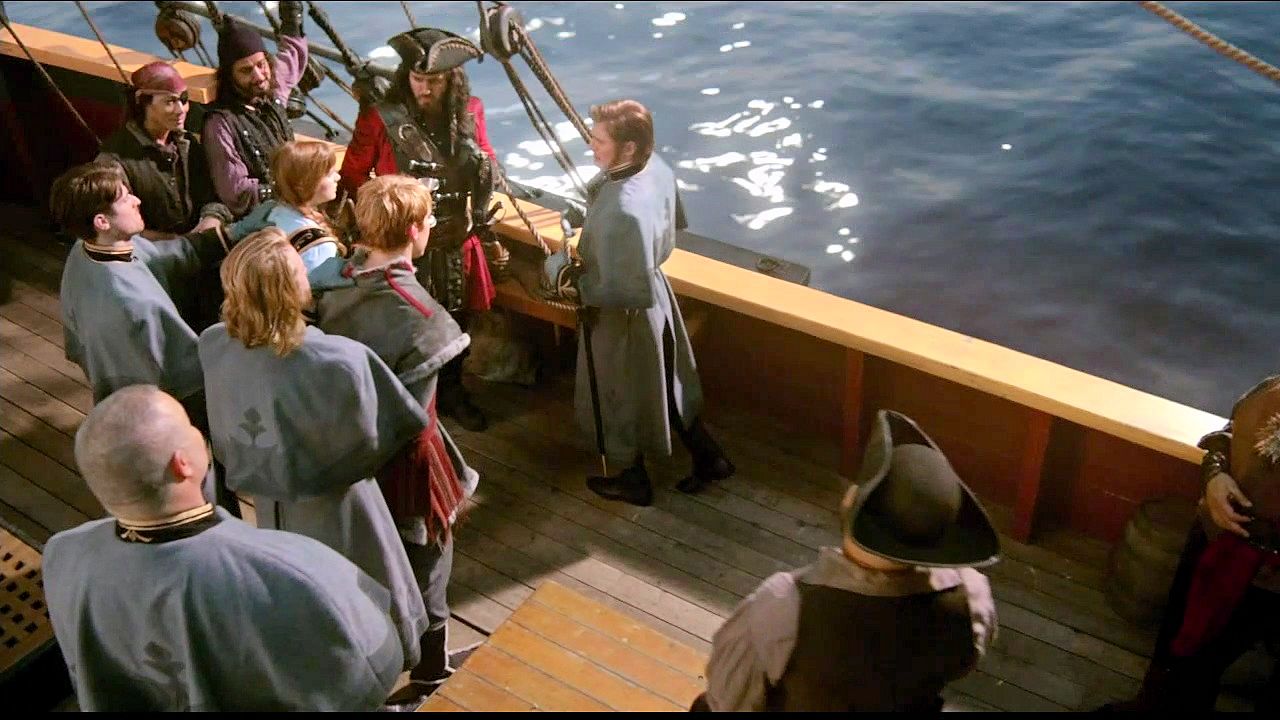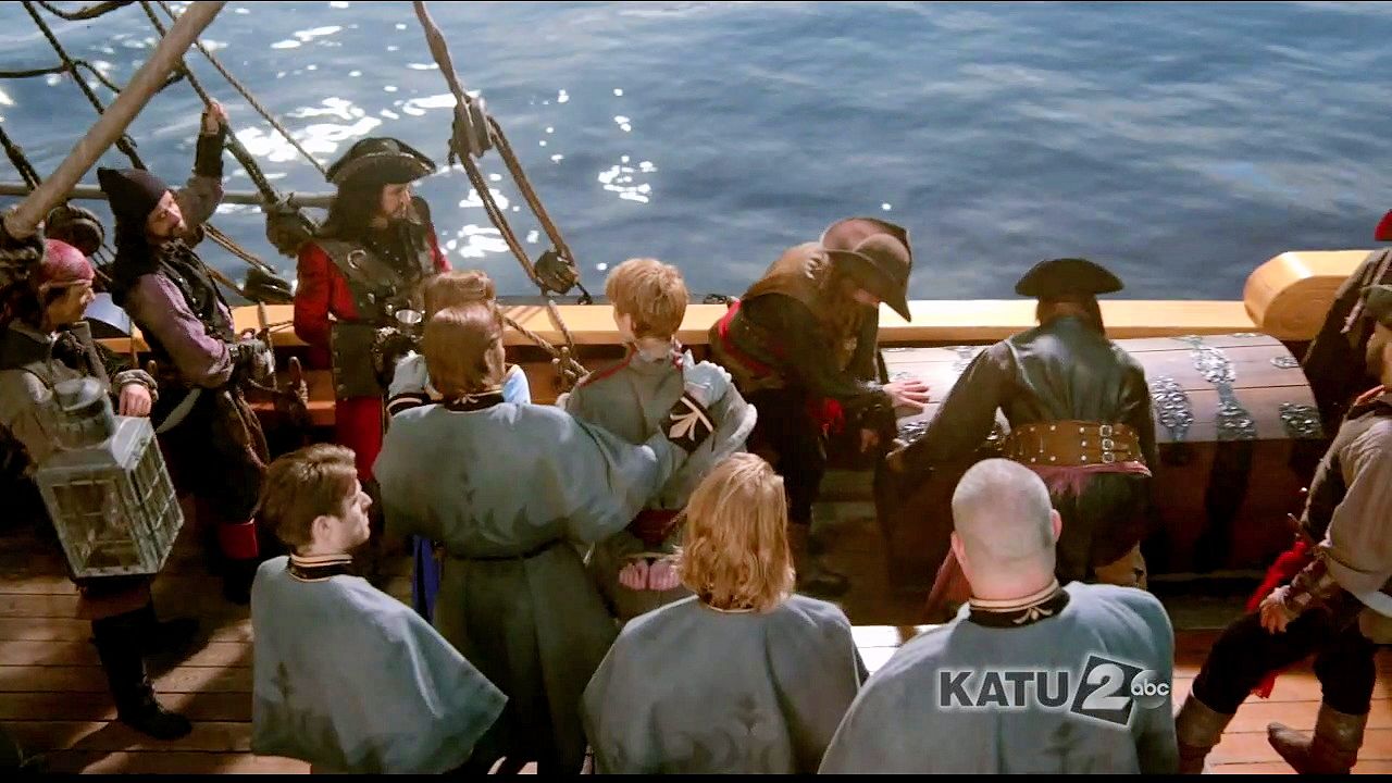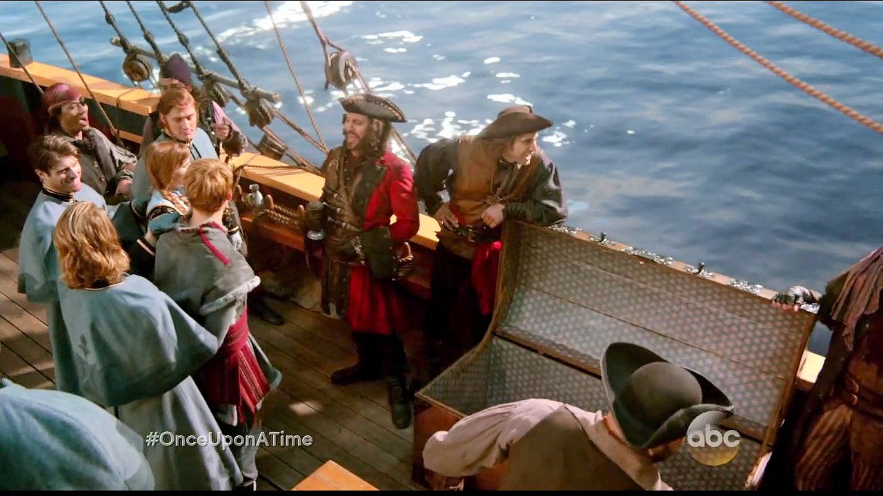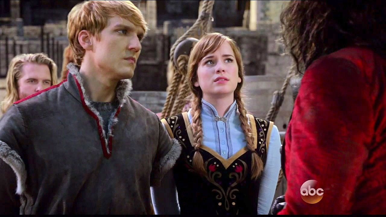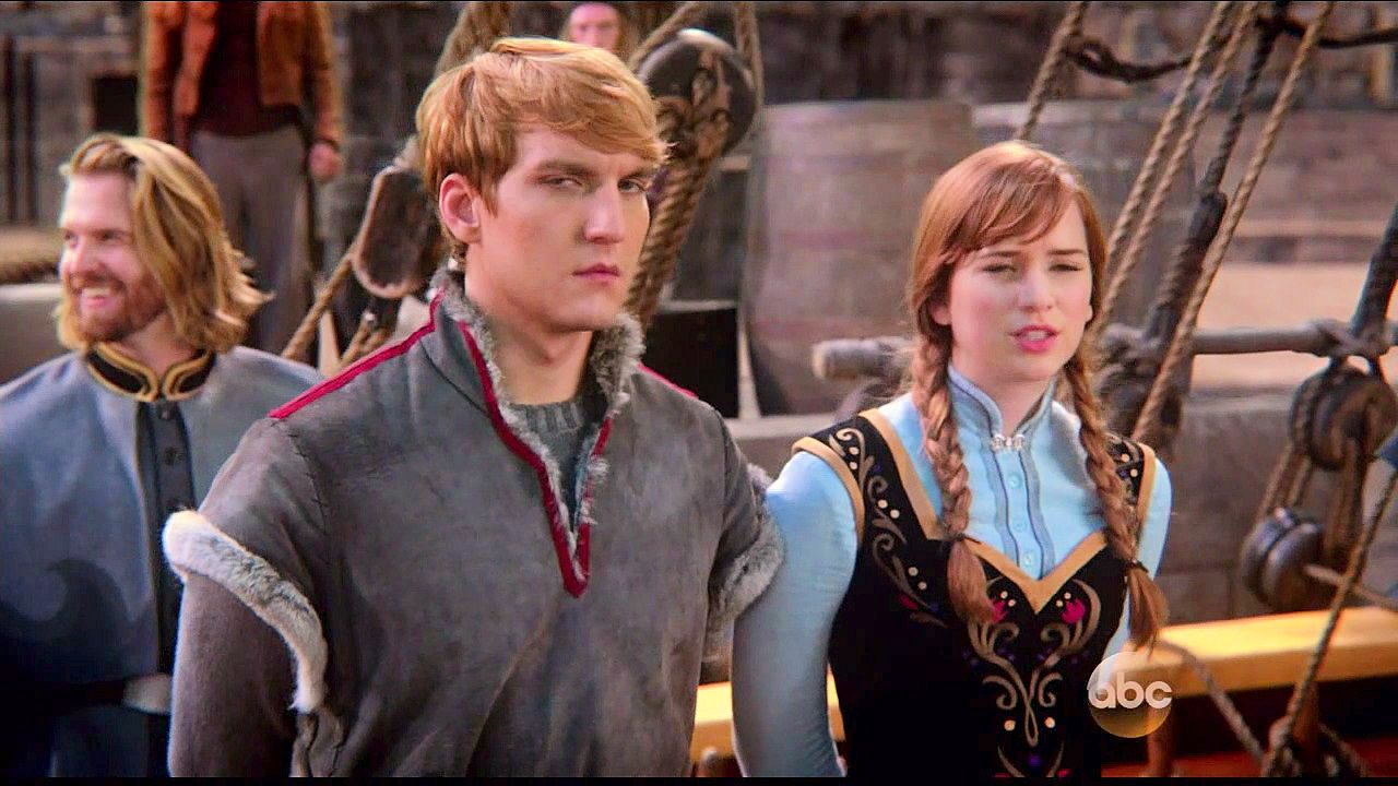 Kristoff and Anna are tied up in a trunk and dumped into the sea by Hans and Blackbeard.
