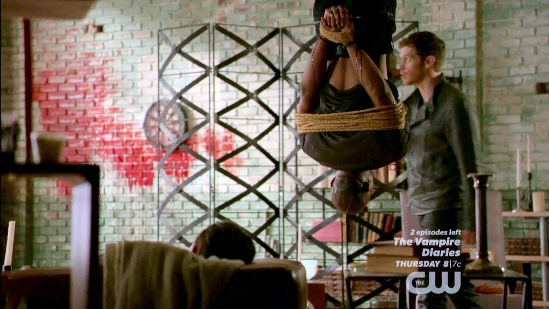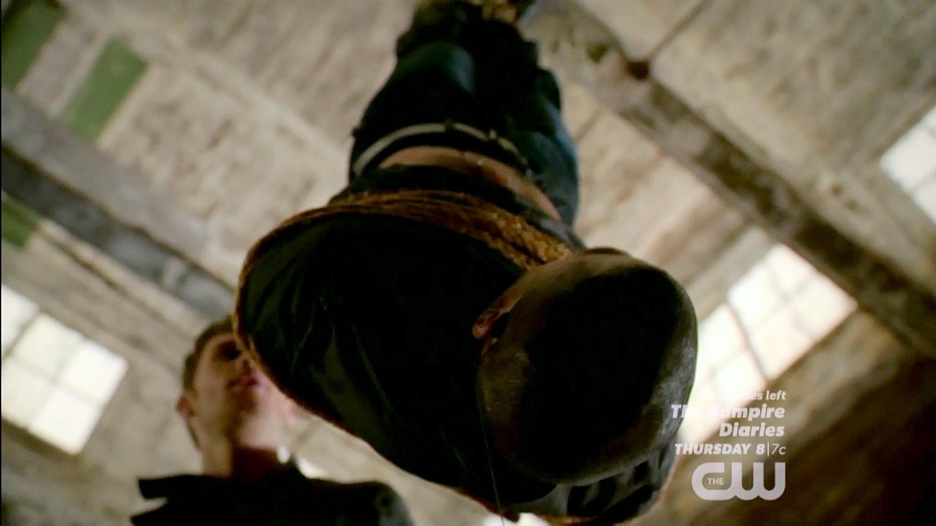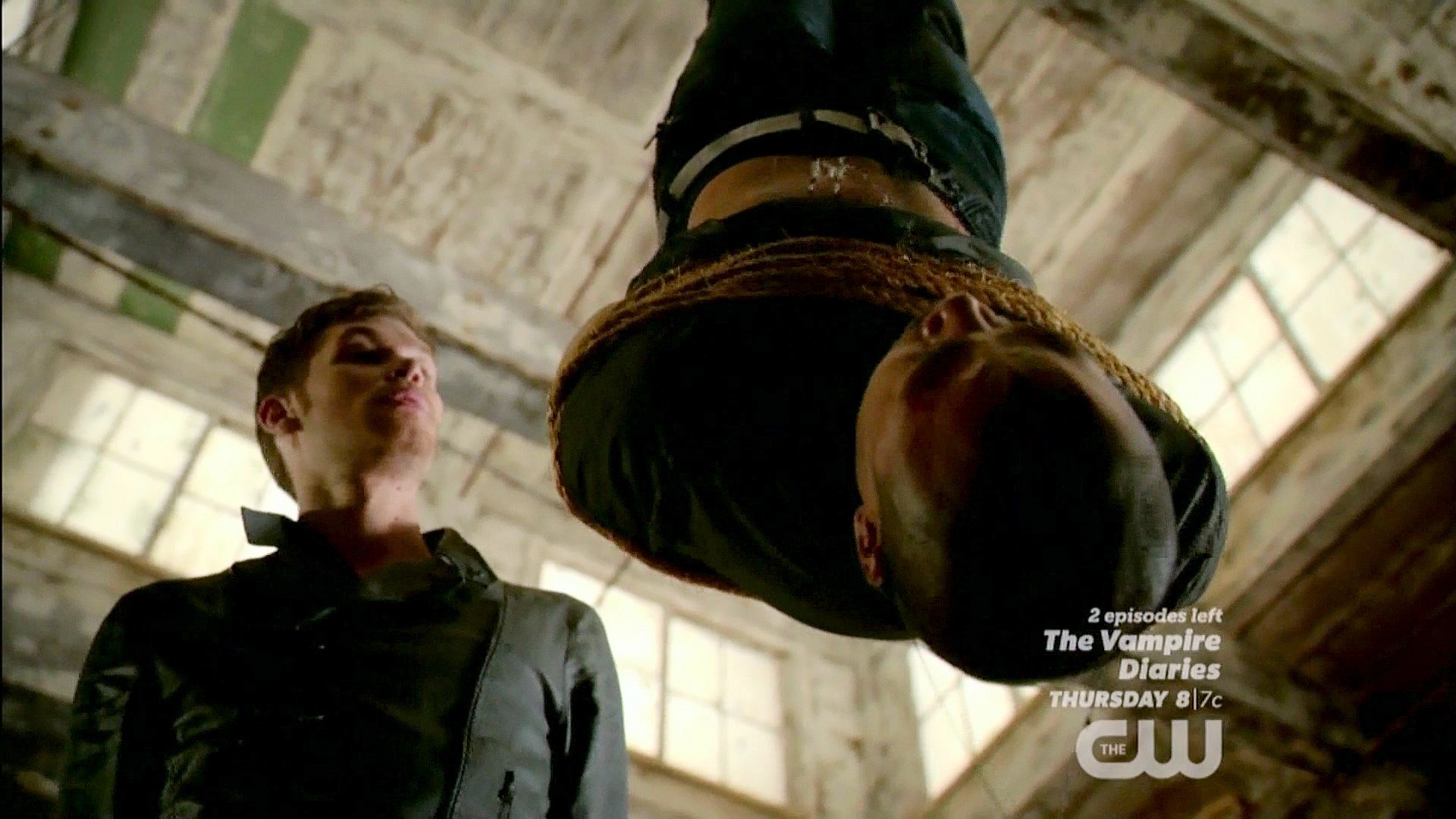 Klaus makes his way to Marcel’s, where he hangs him upside down and drains the vervain out of his system.