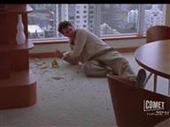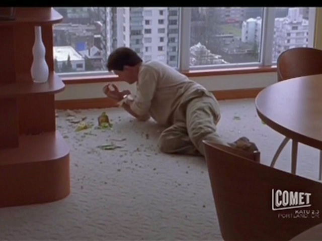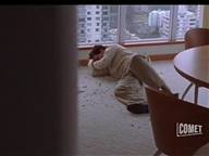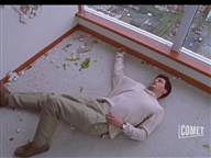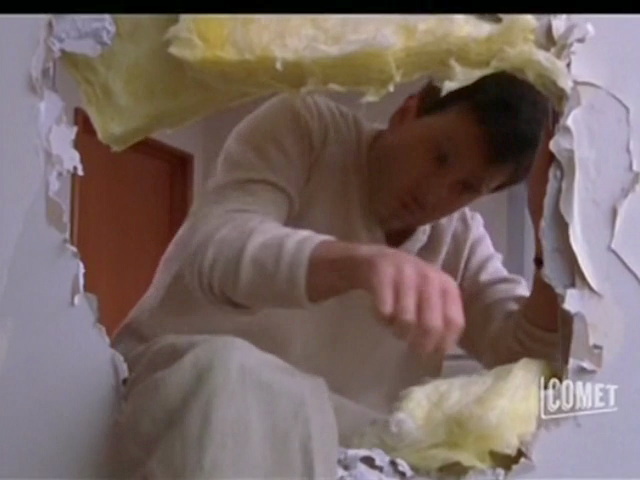 because of a malfunction. The neighbor knocks him out and ties him up.