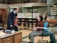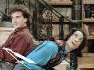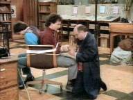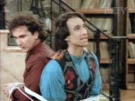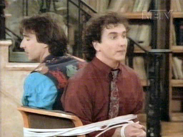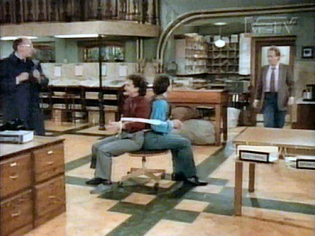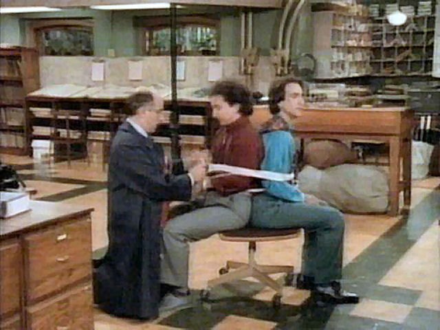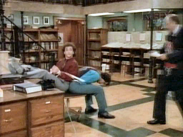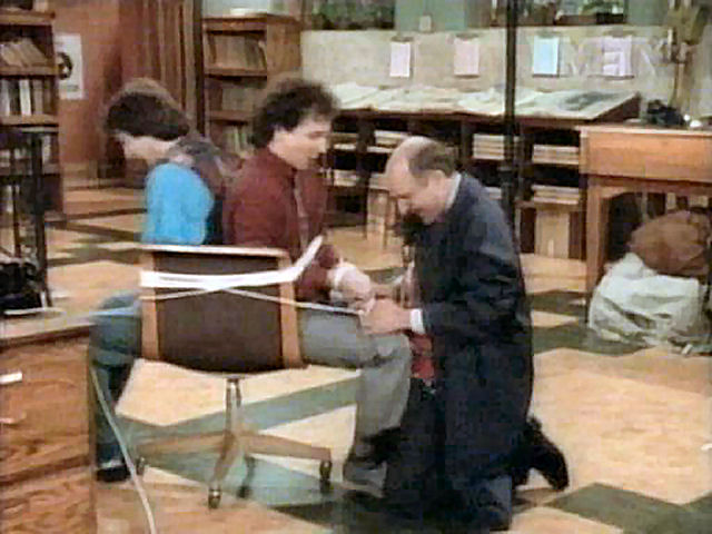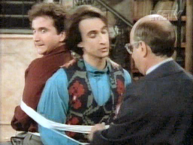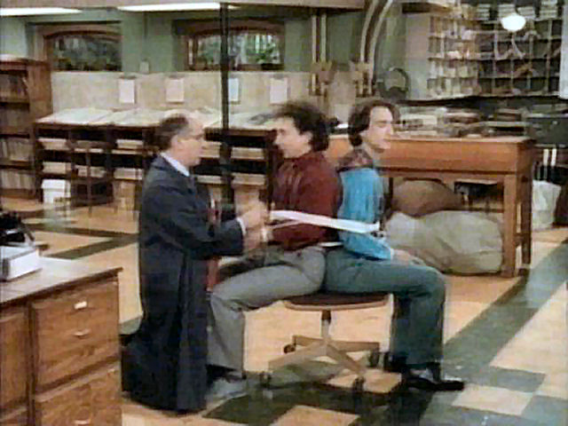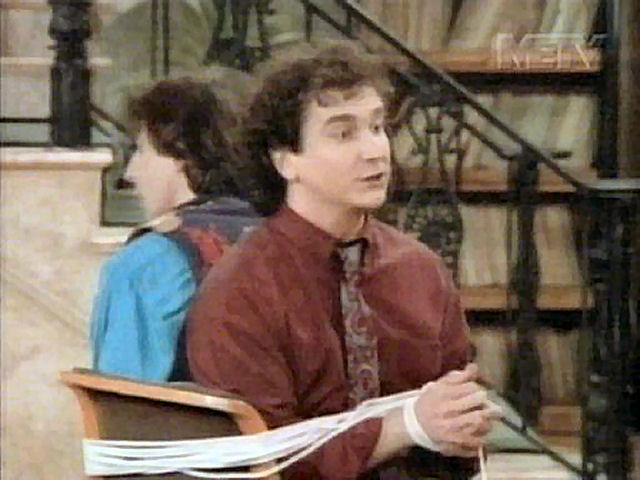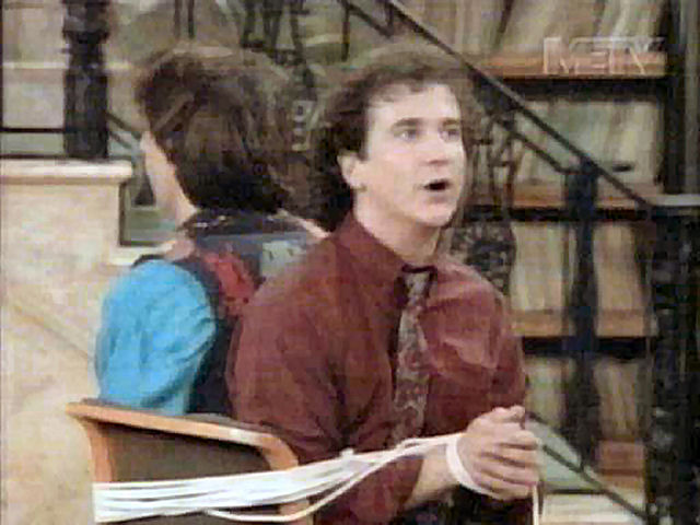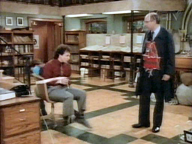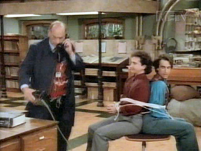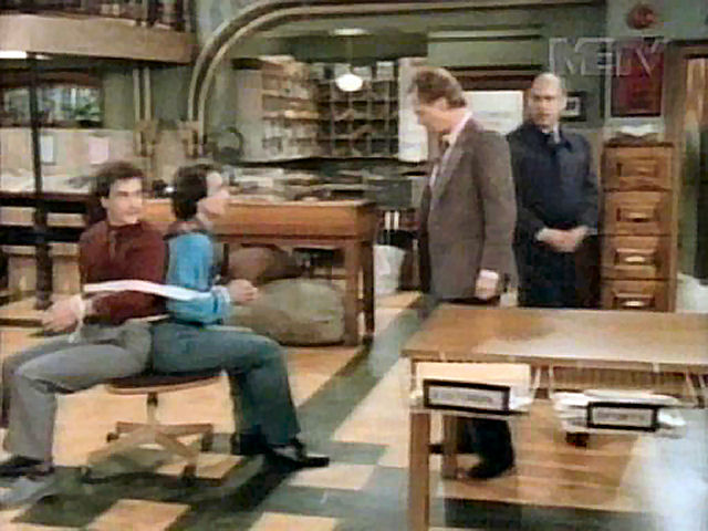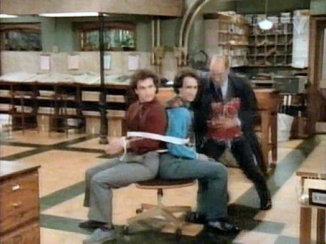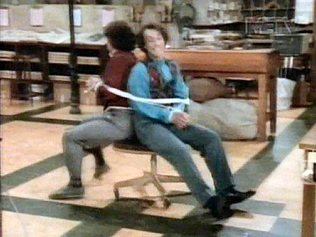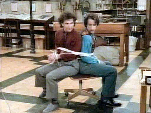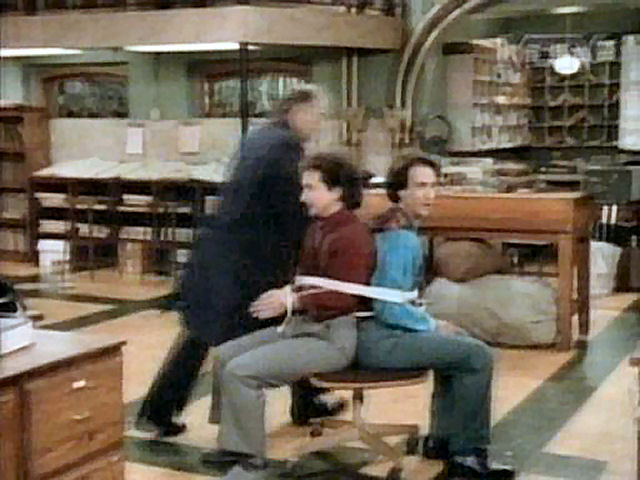 When Larry writes a story about a criminal, the real criminal comes to the office with a bomb and ties up Larry and Balki.
