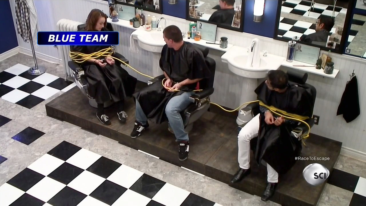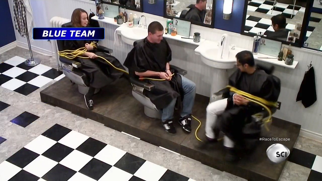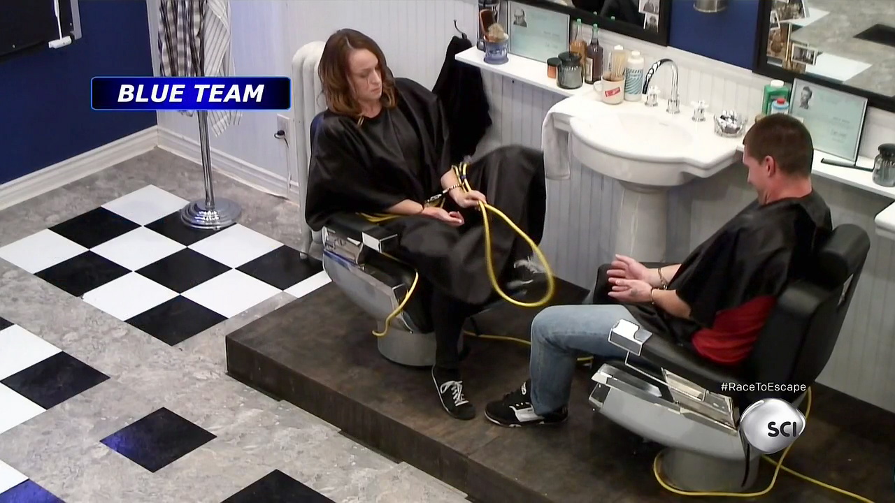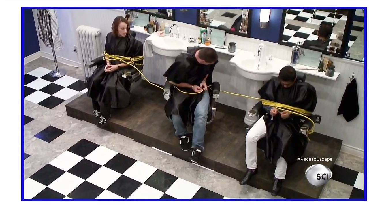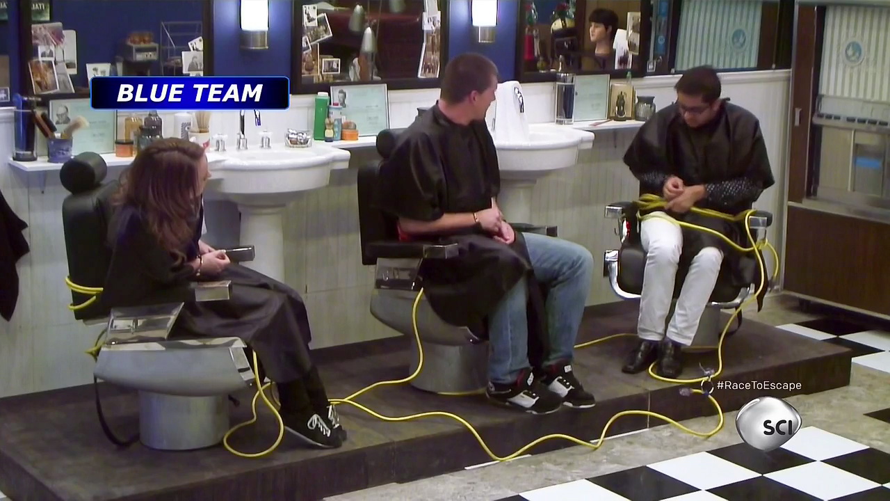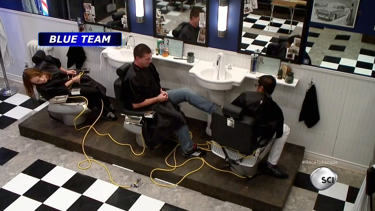 Contestants are handcuffed and tied to barber chairs, and must escape.