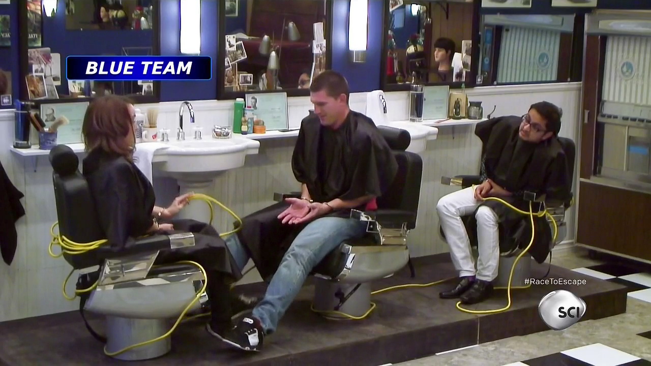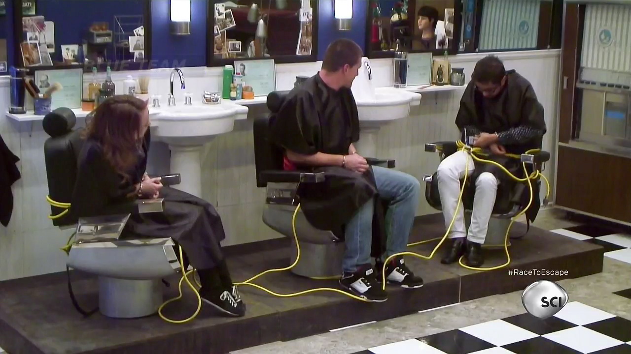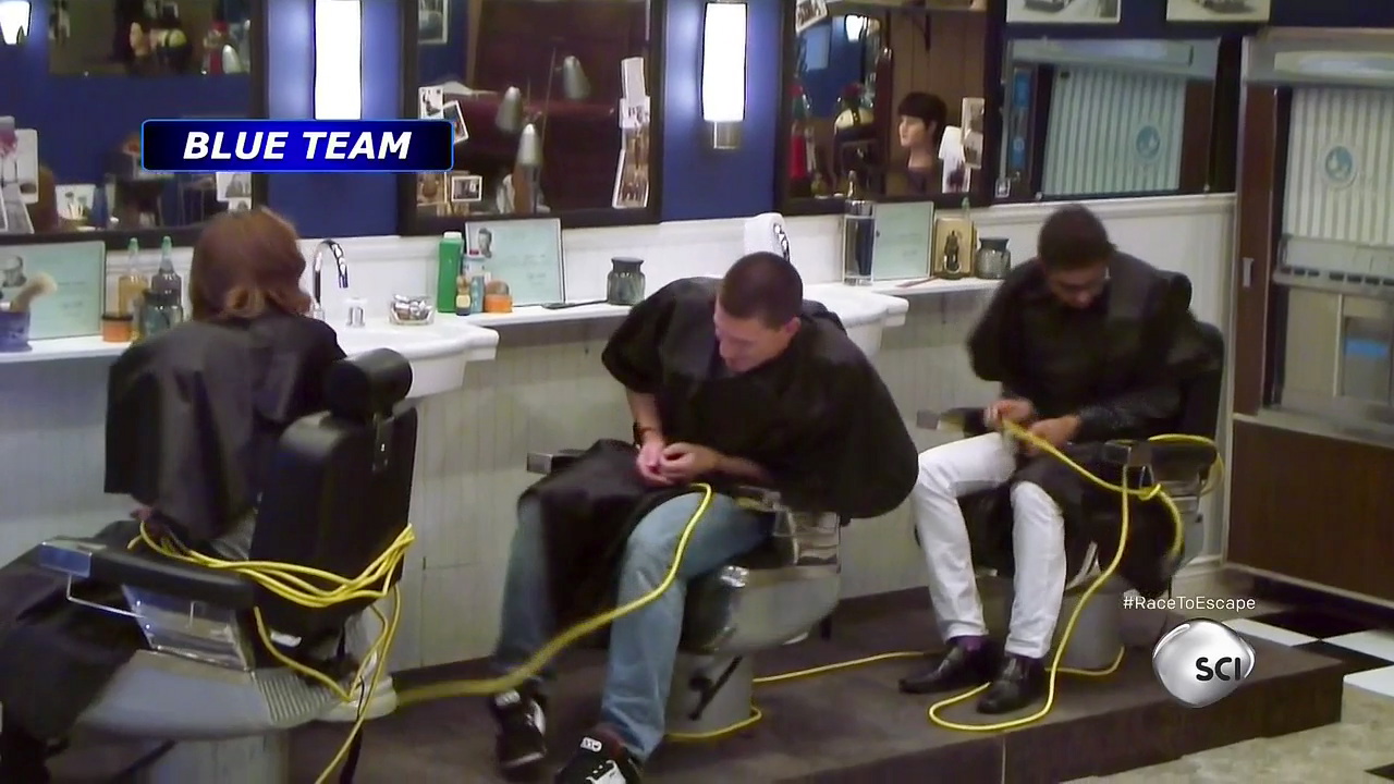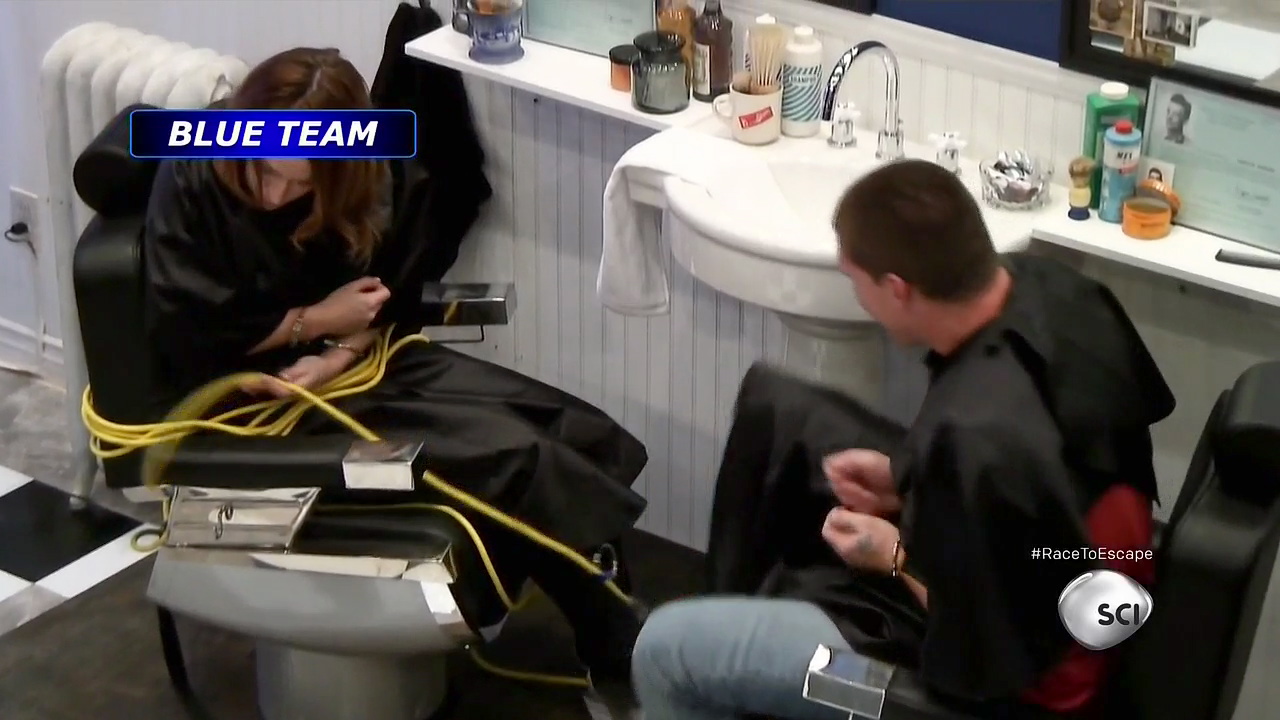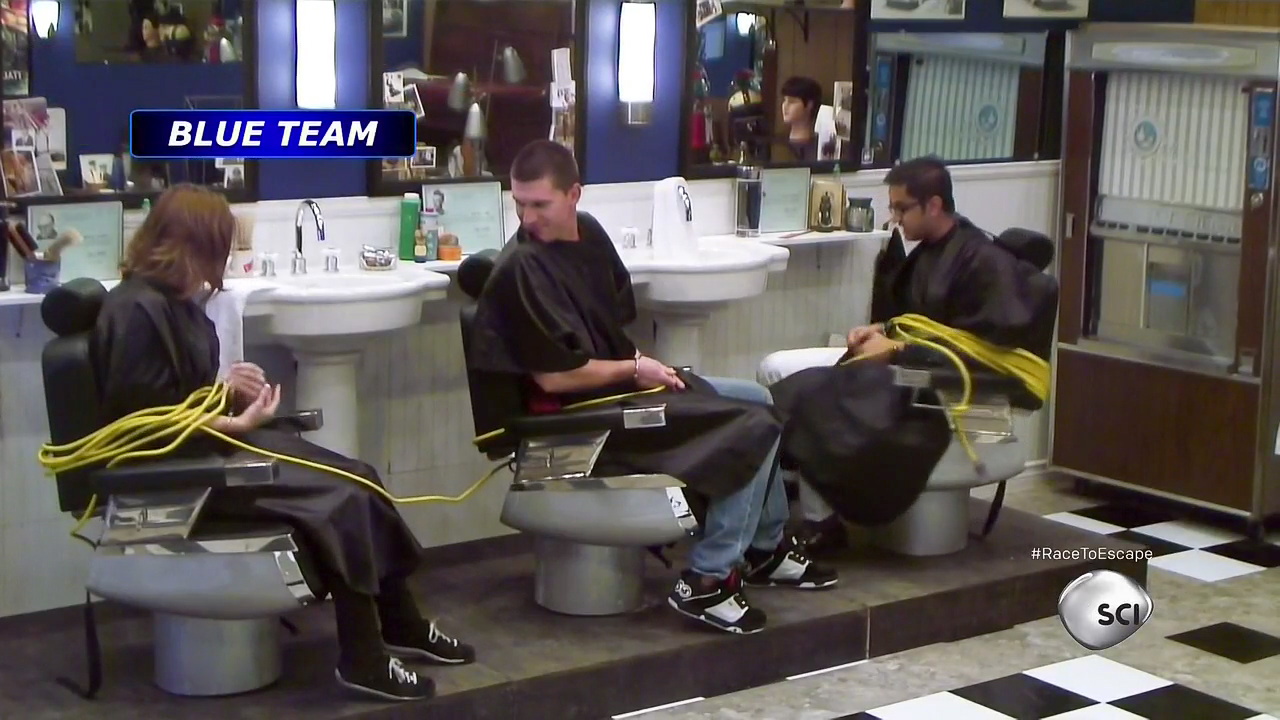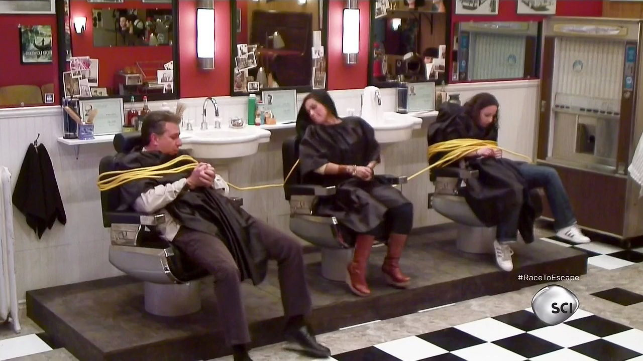 Contestants are handcuffed and tied to barber chairs, and must escape.