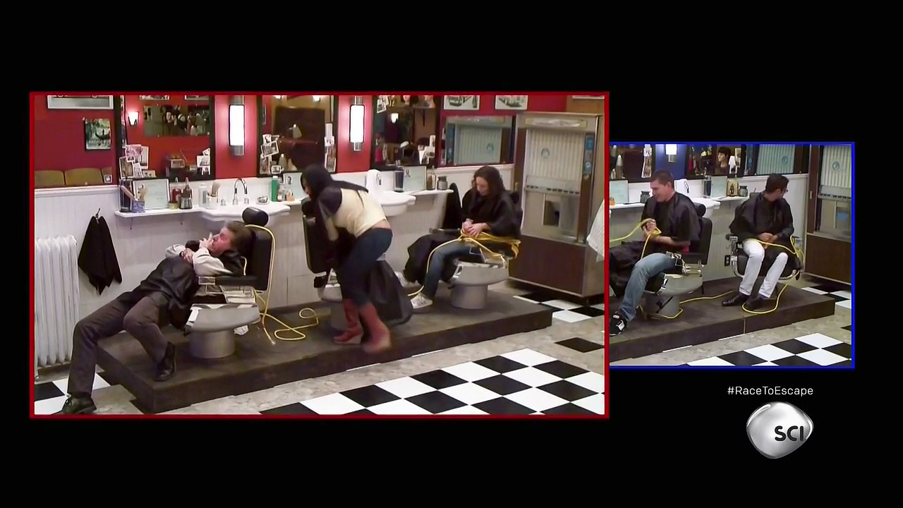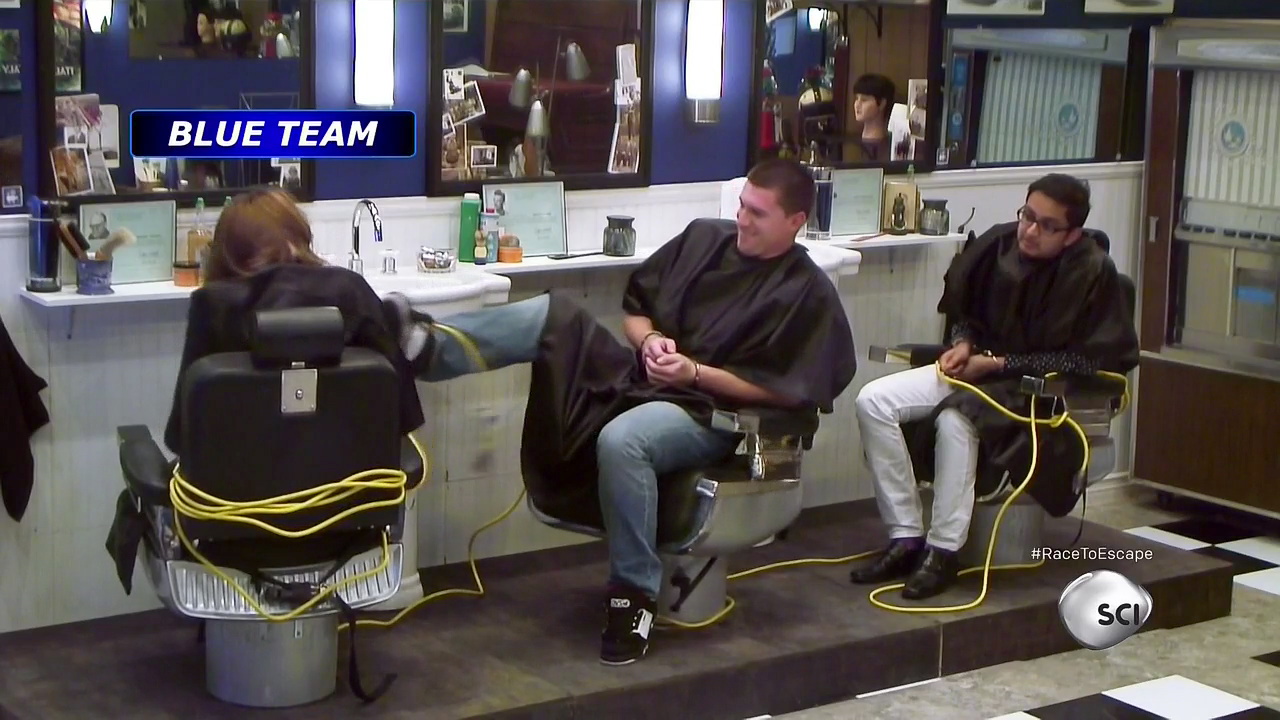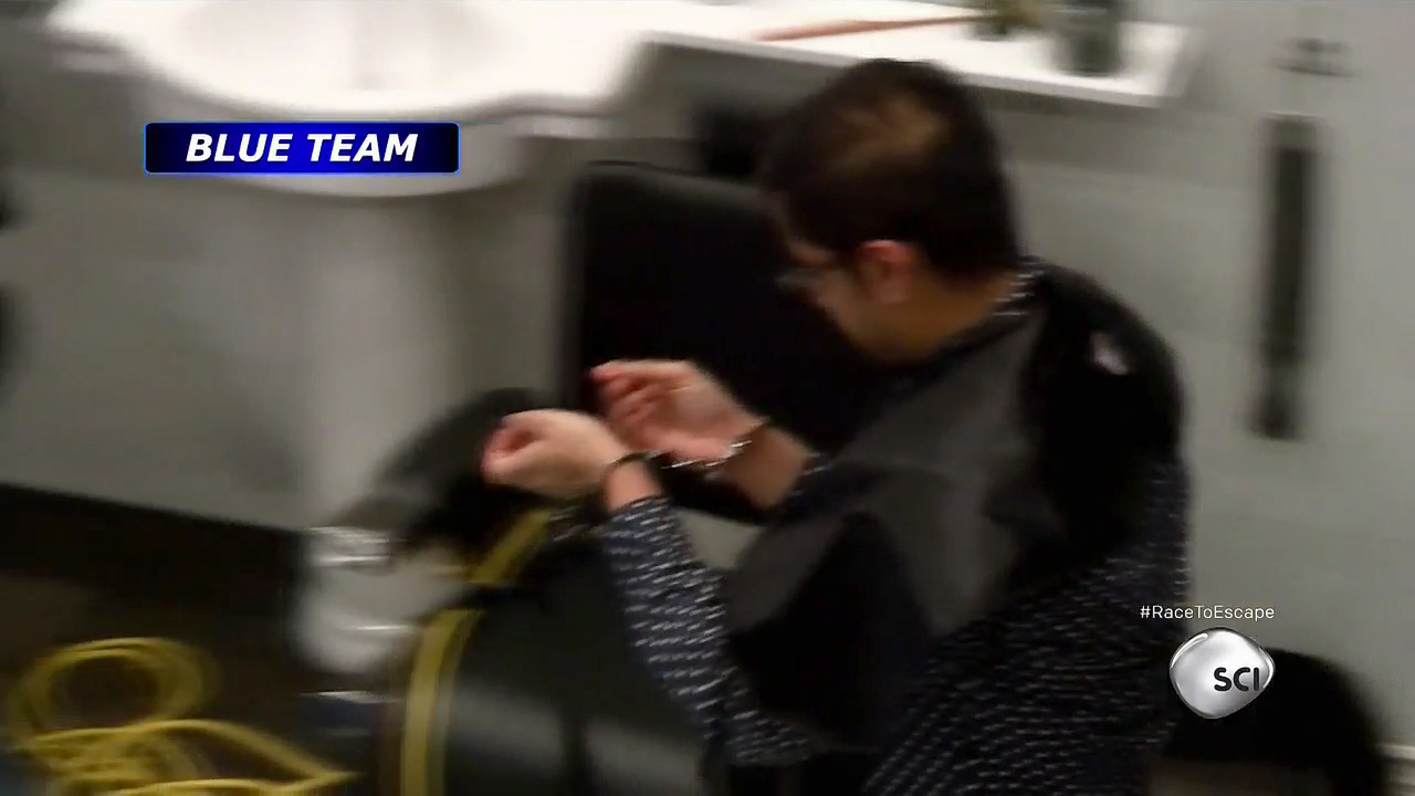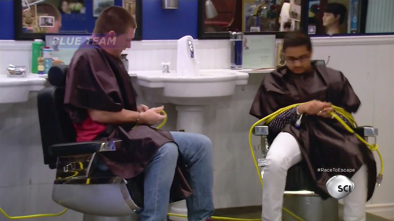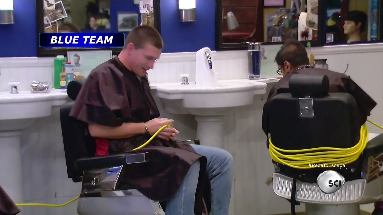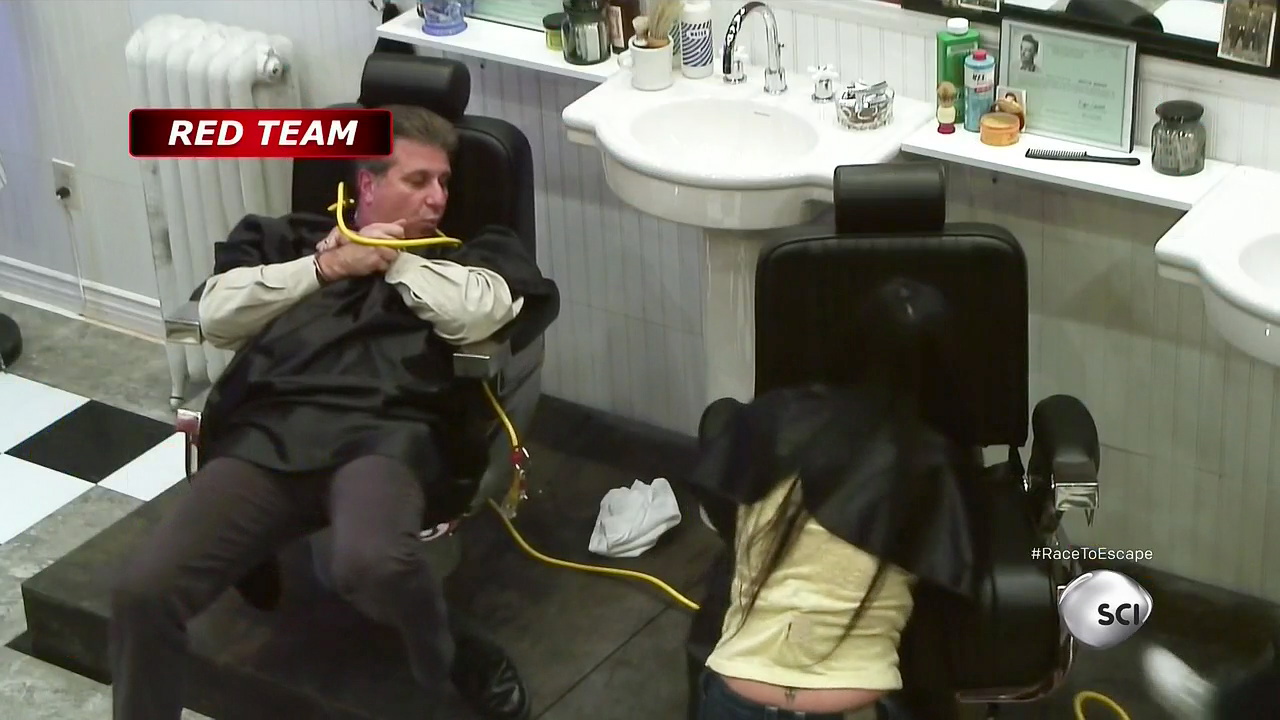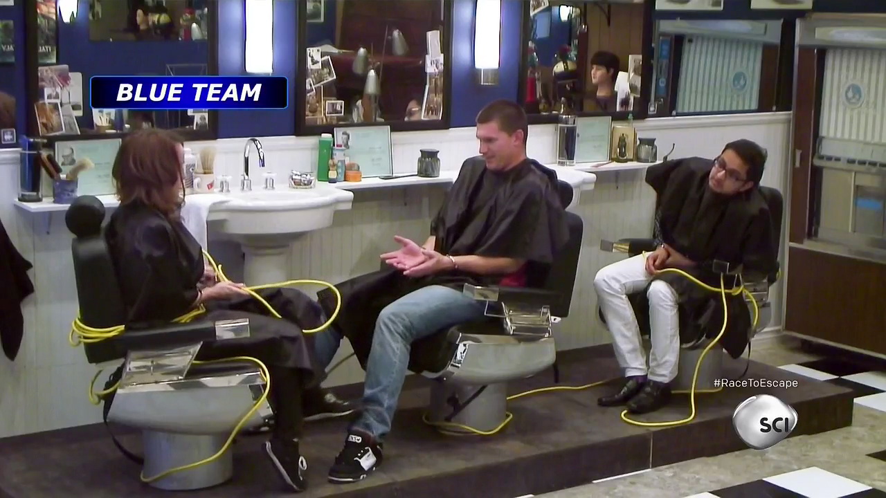 Contestants are handcuffed and tied to barber chairs, and must escape.