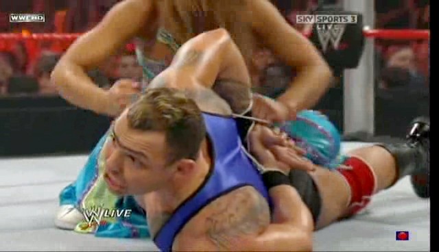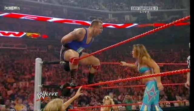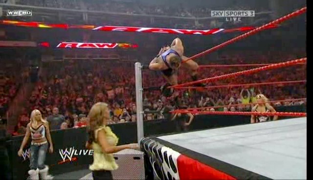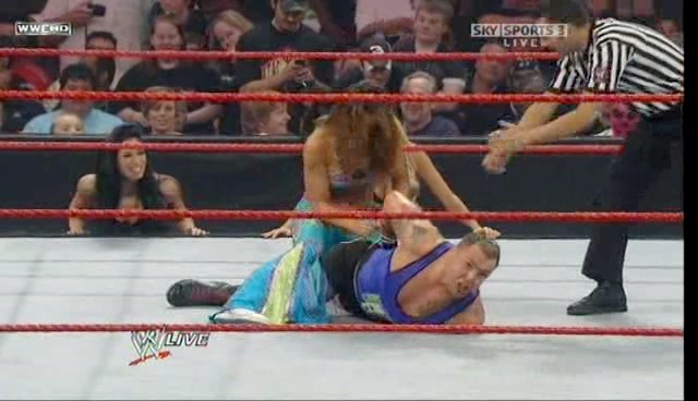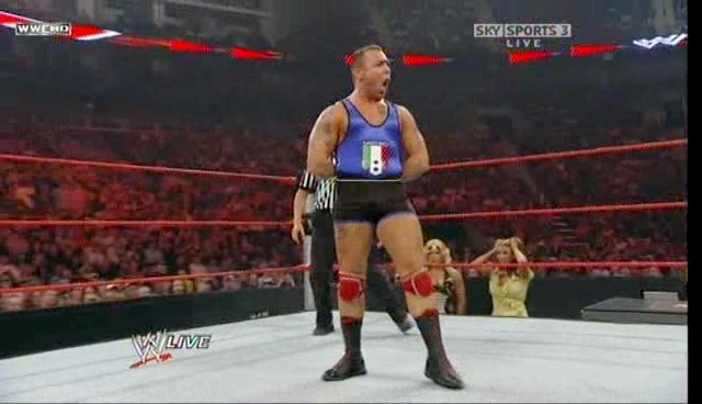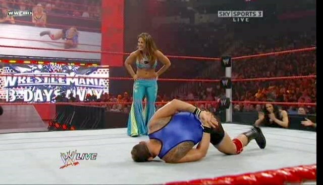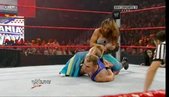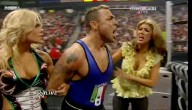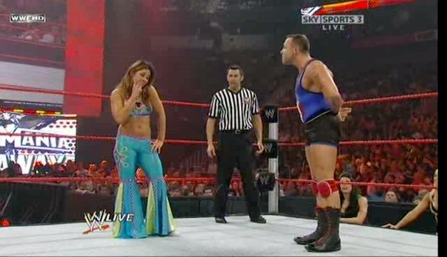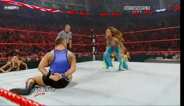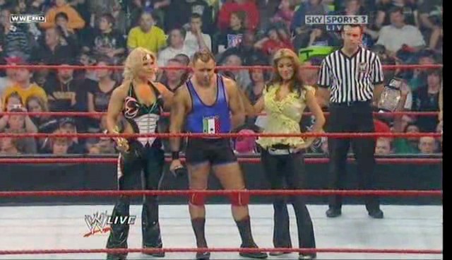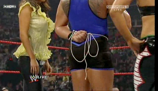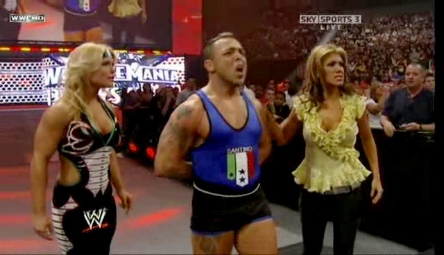 In an attempt to qualify for the Diva Battle Royal, Santino wrestles Mickie James with one hand tied behind him. She trips him and ties the other one, too.