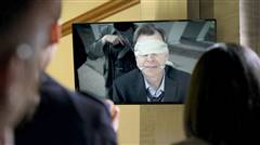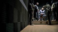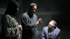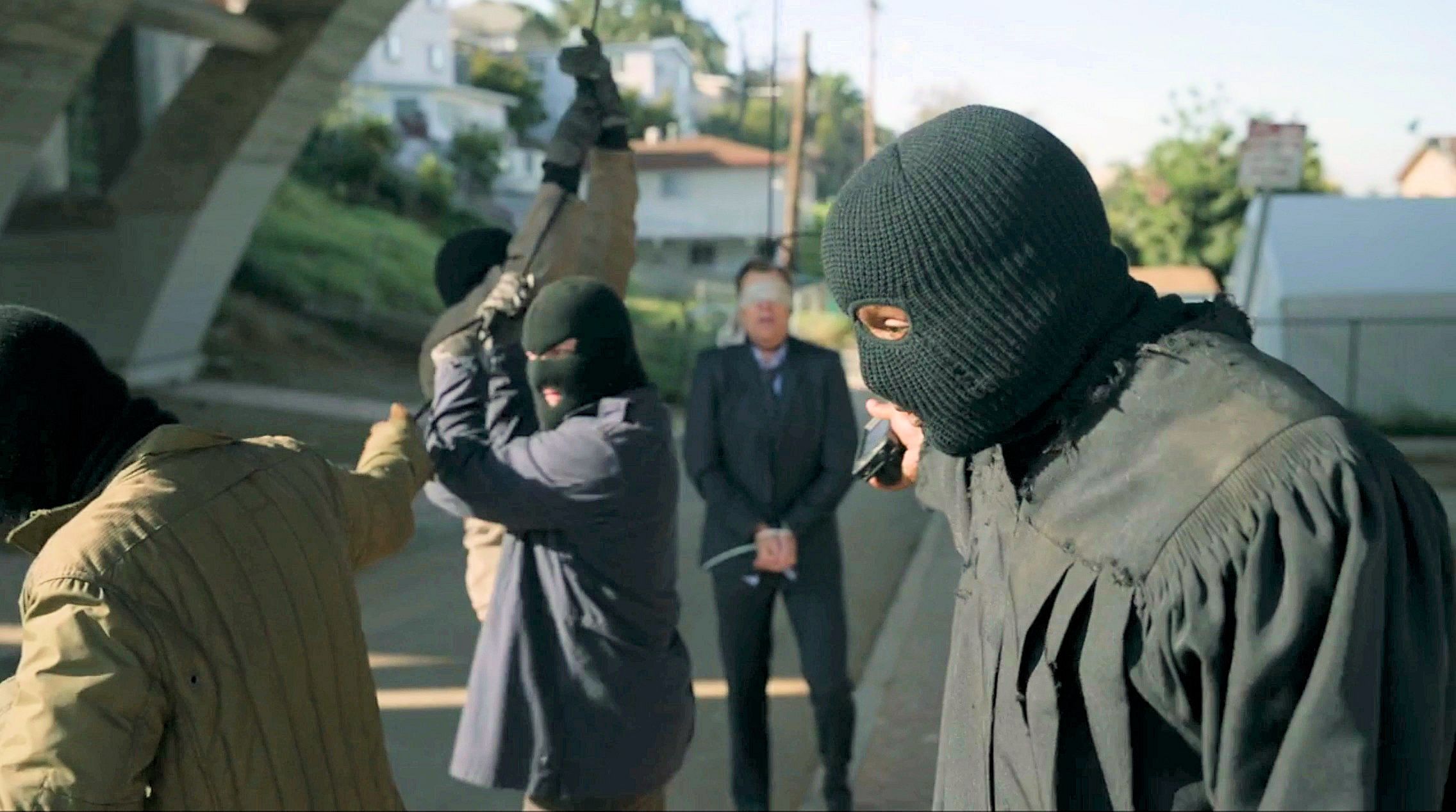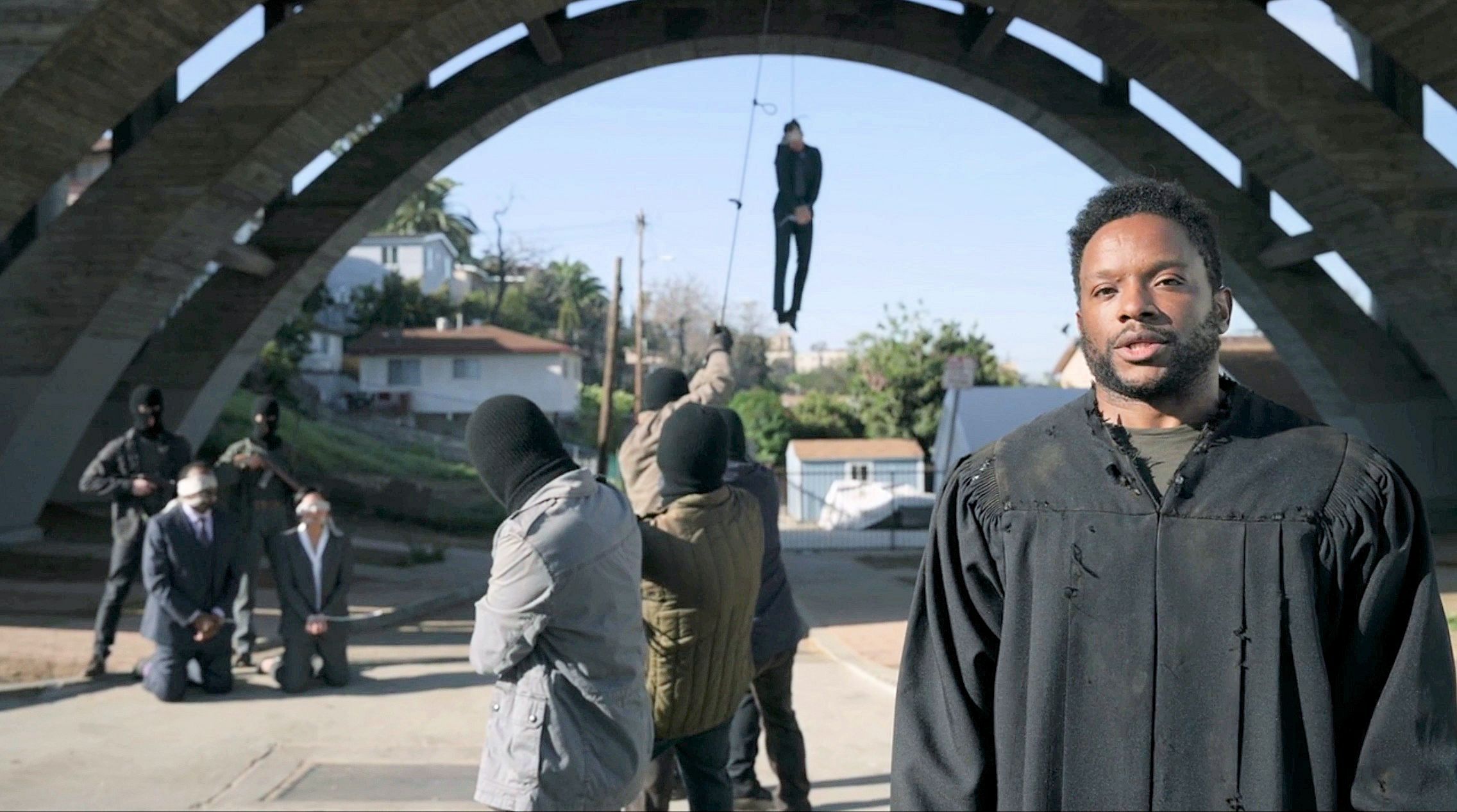 Police watch as city council members are threatened by revolutionaries.