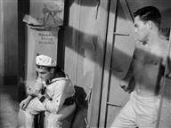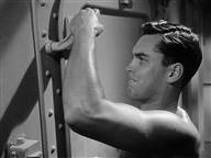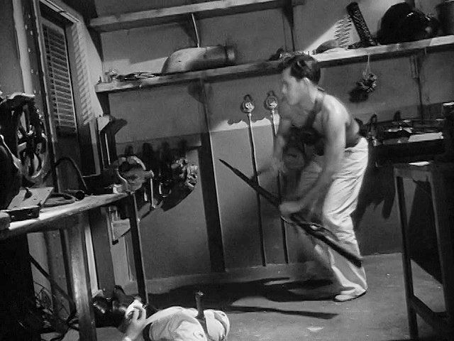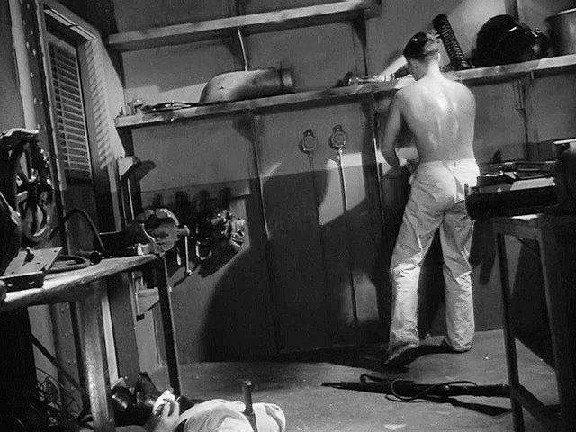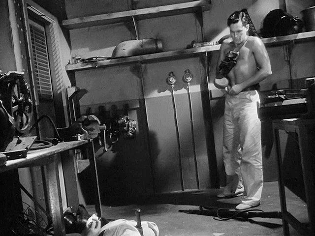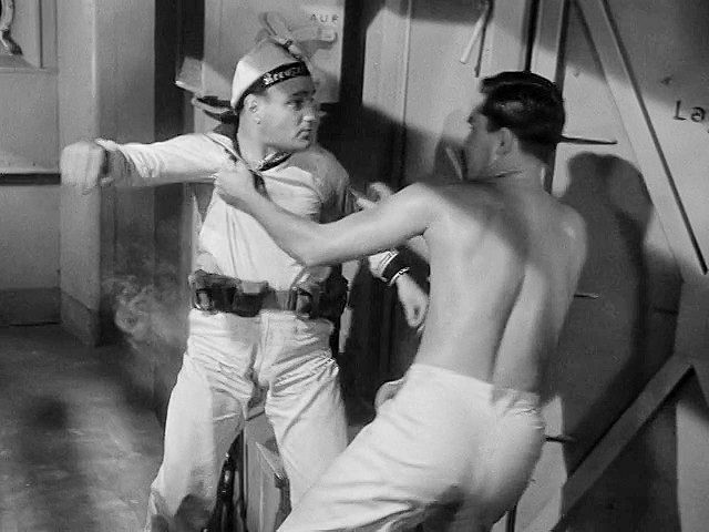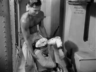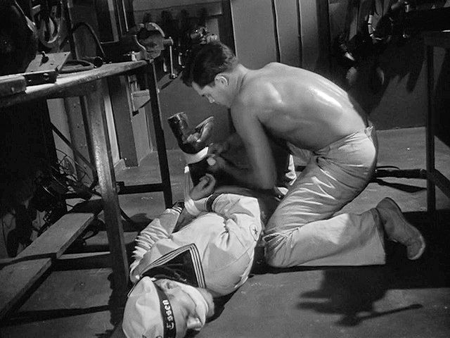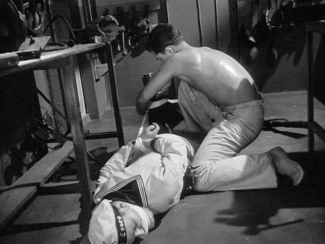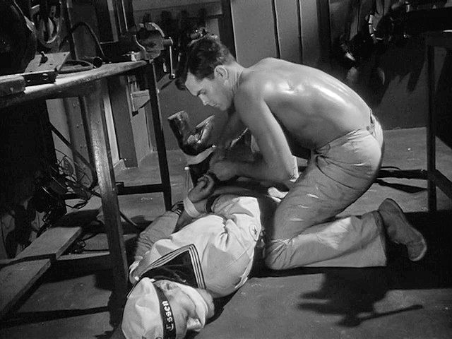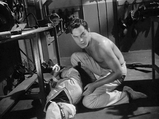 A young Jeff Hunter plays a prisoner on a German ship in WWII. He escapes by overpowering and hog-tying a guard,