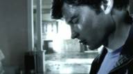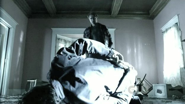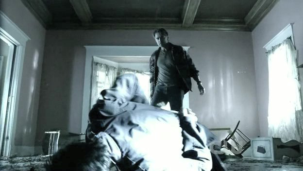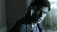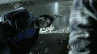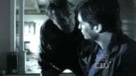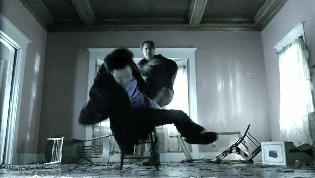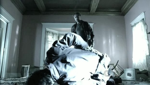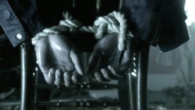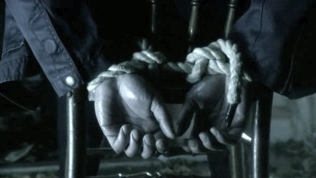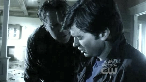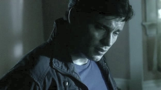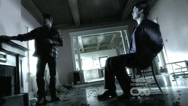 Clark is tied to a chair by his father's kryptonite-carrying doppelganger.