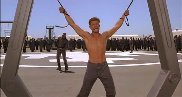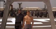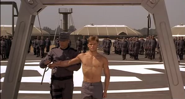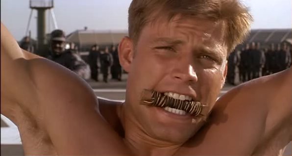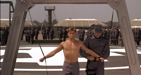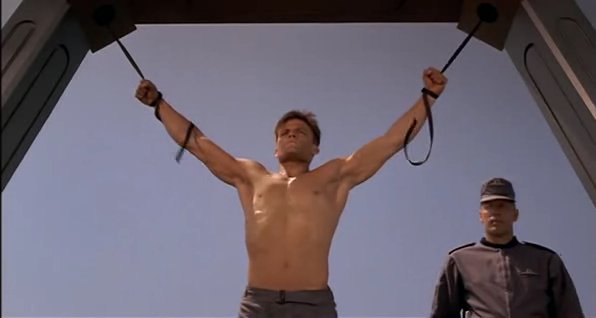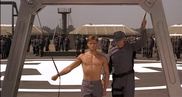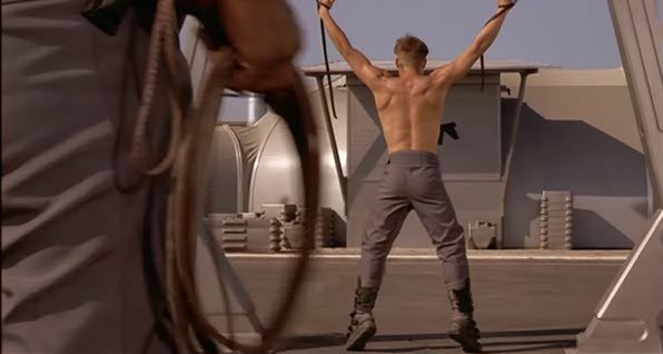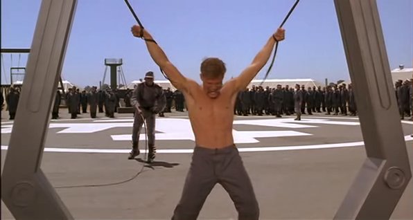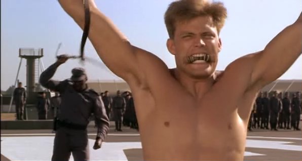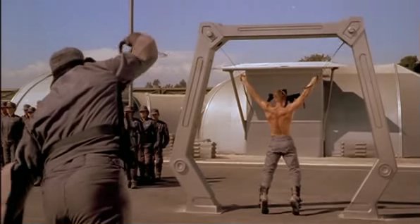 In a fascist future society, a recruit in the Mobile Infantry faces a traditional military punishment.