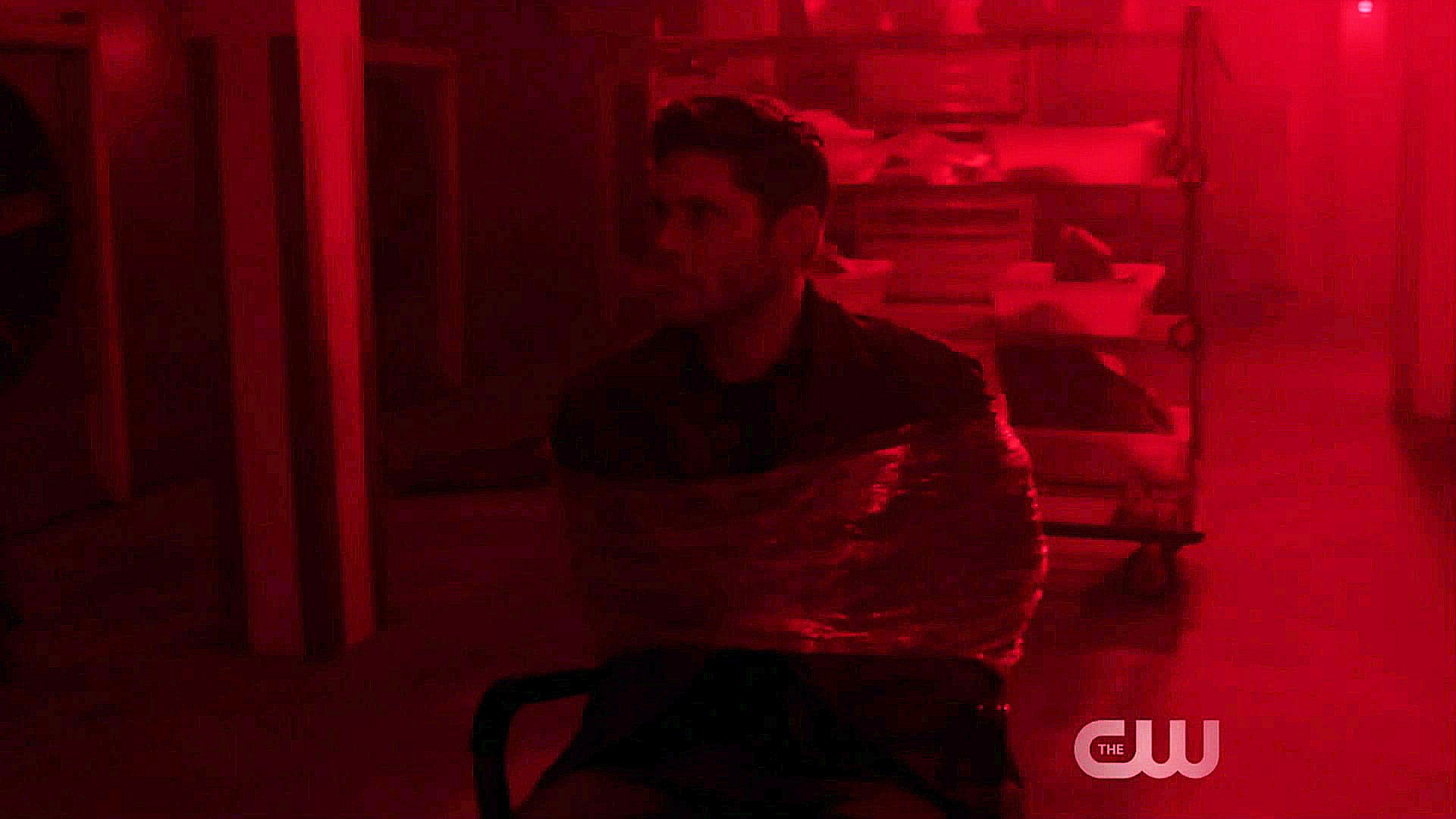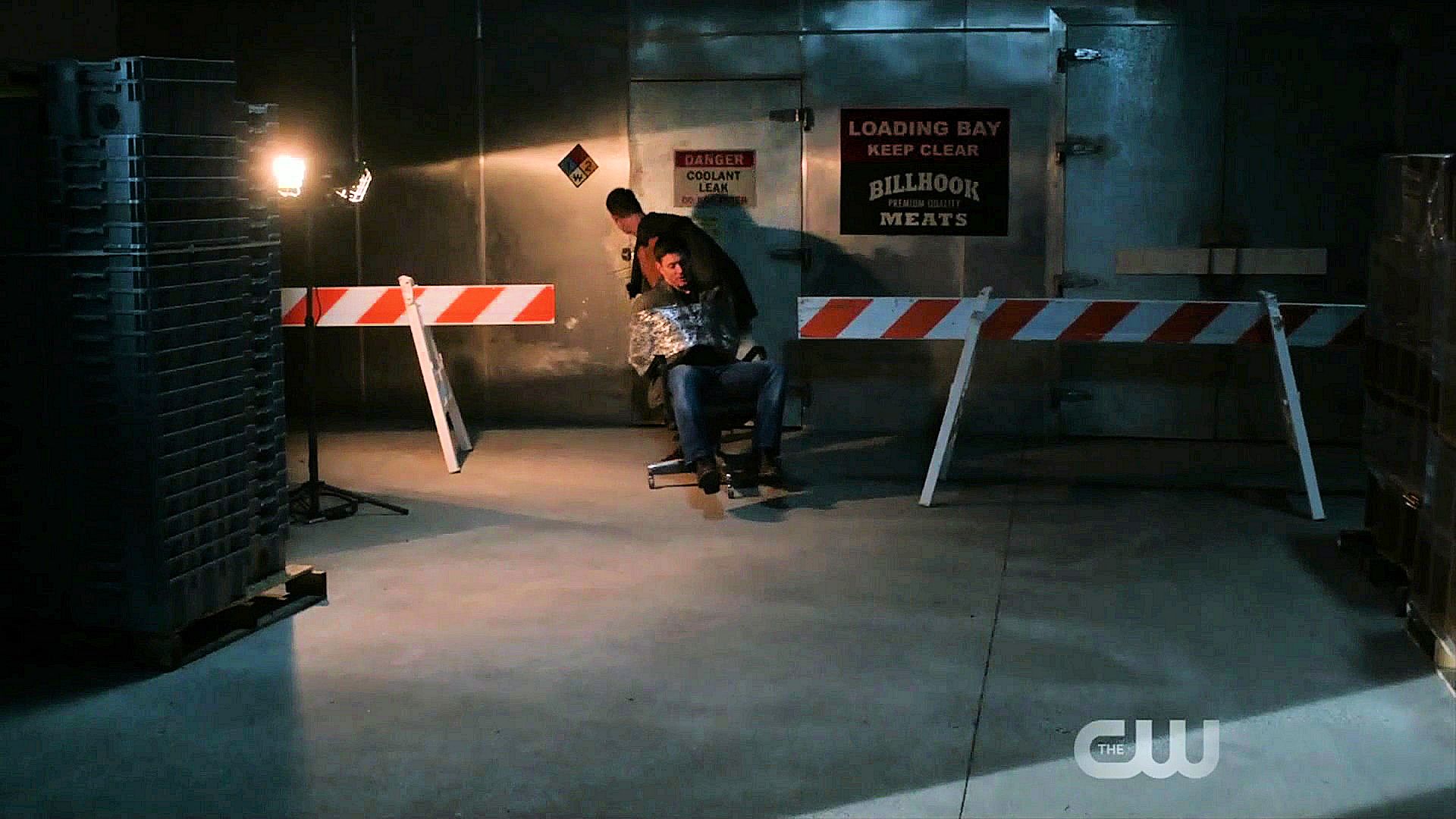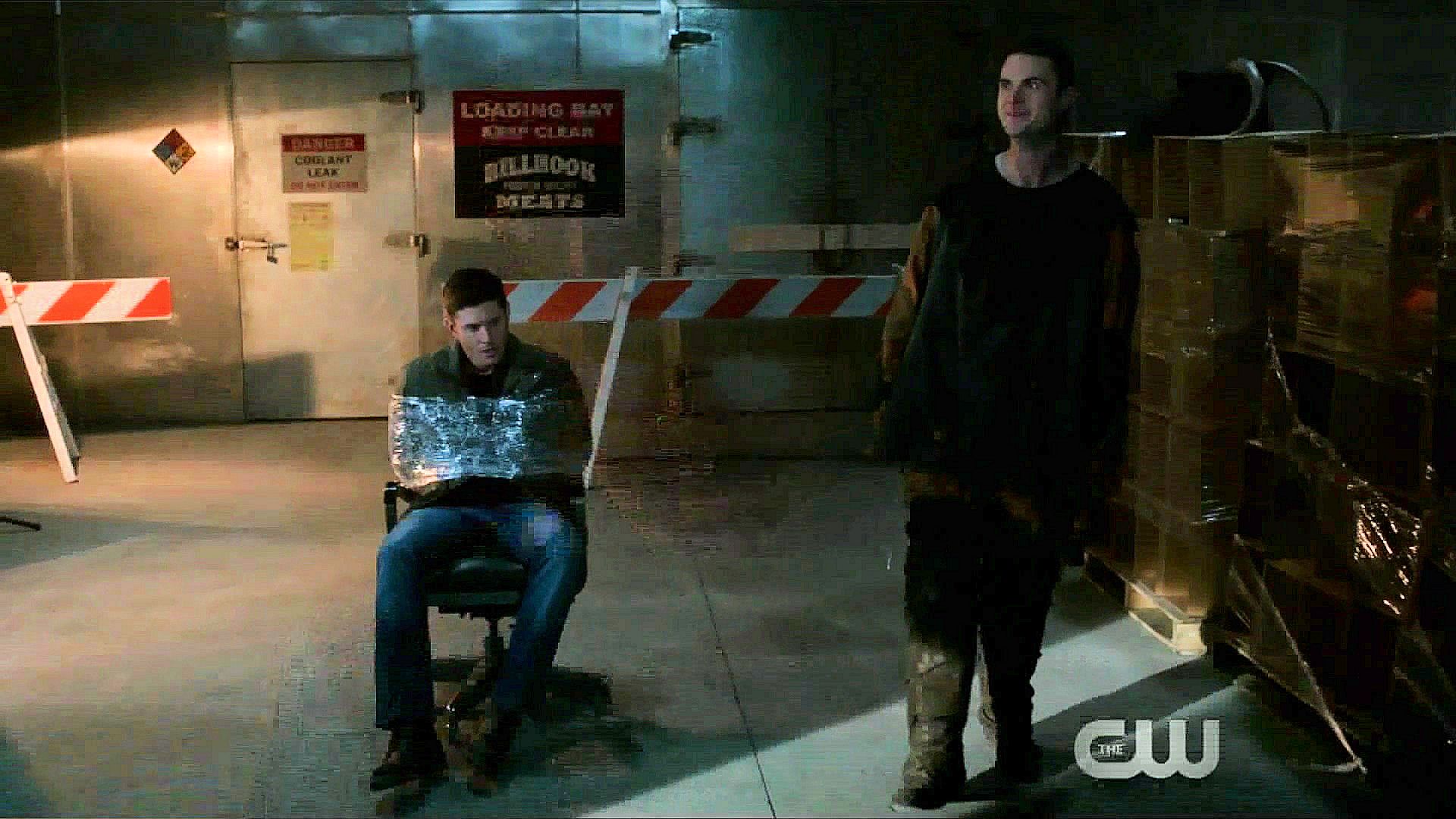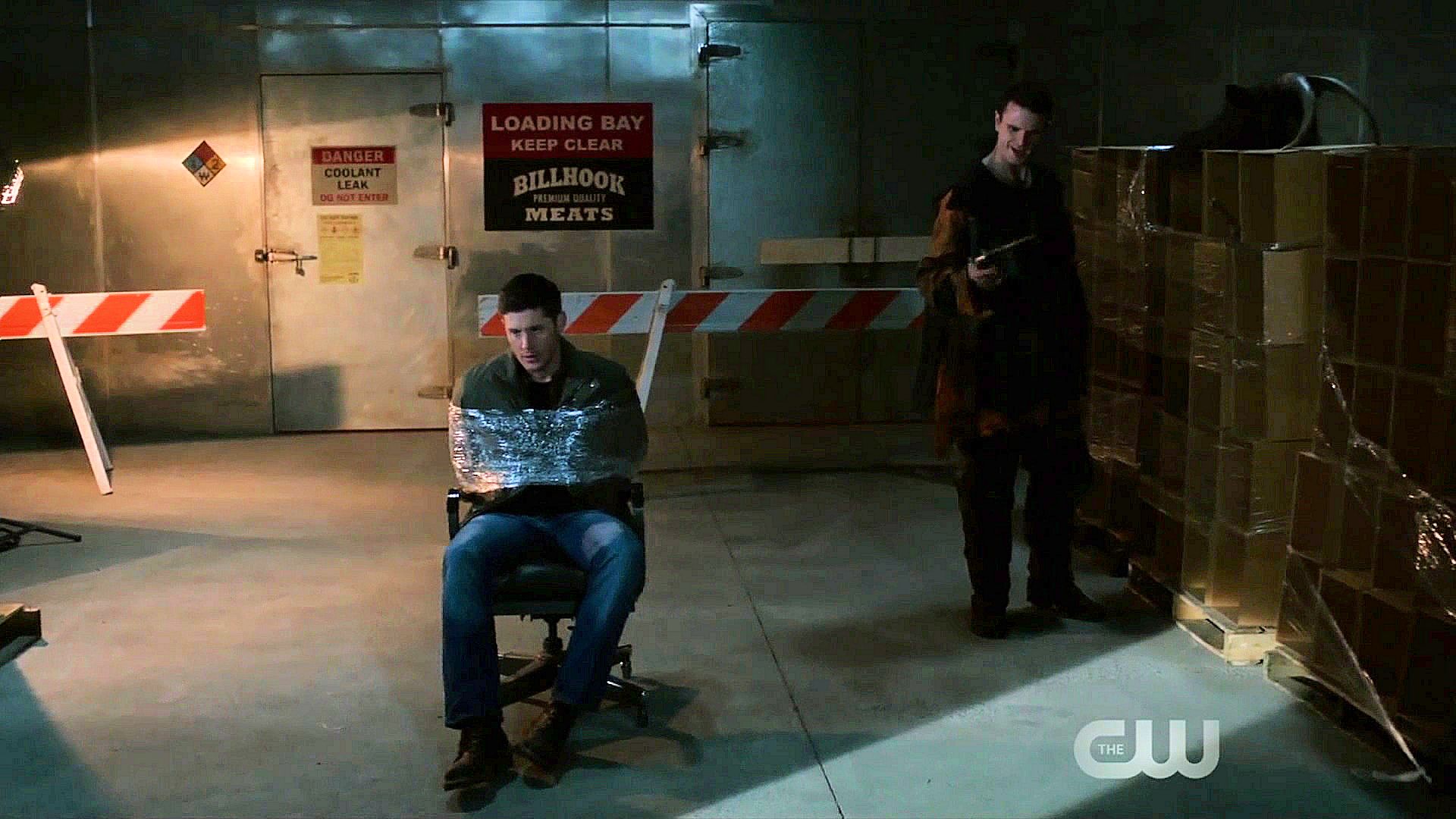 Dean is shrink-wrapped to a chair and left in a freezer.