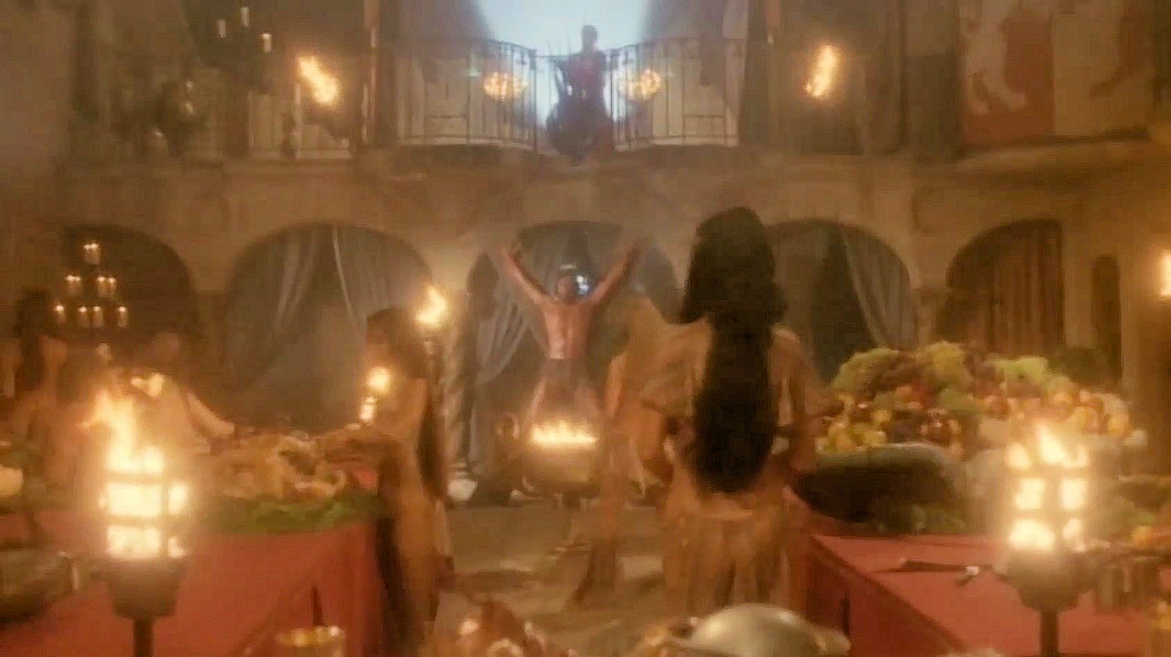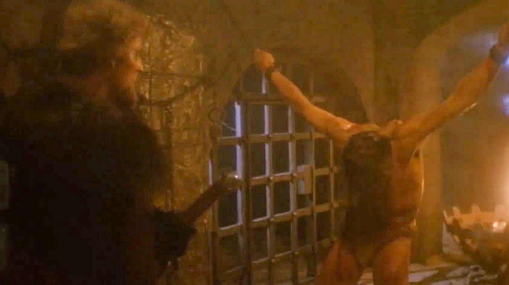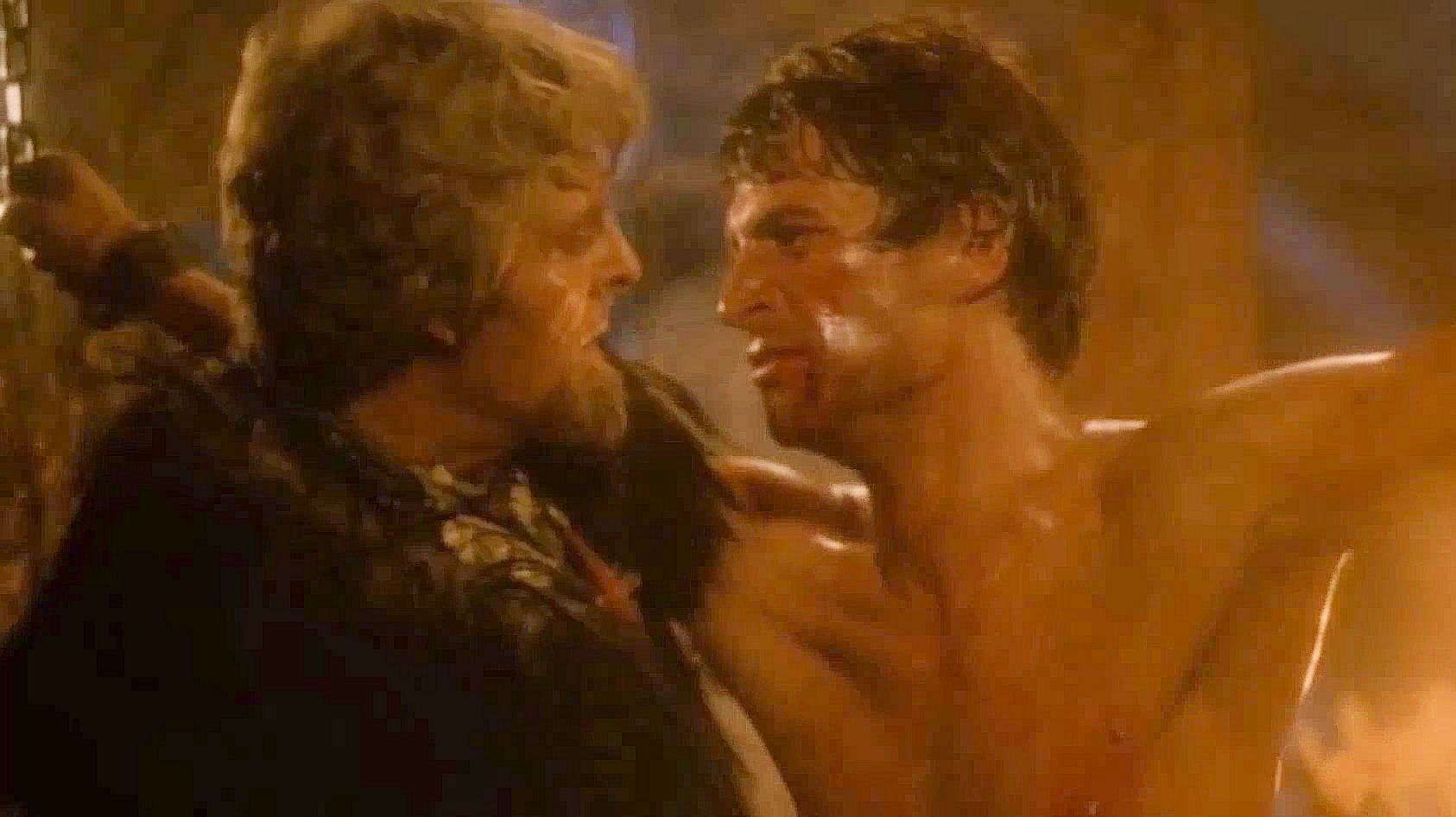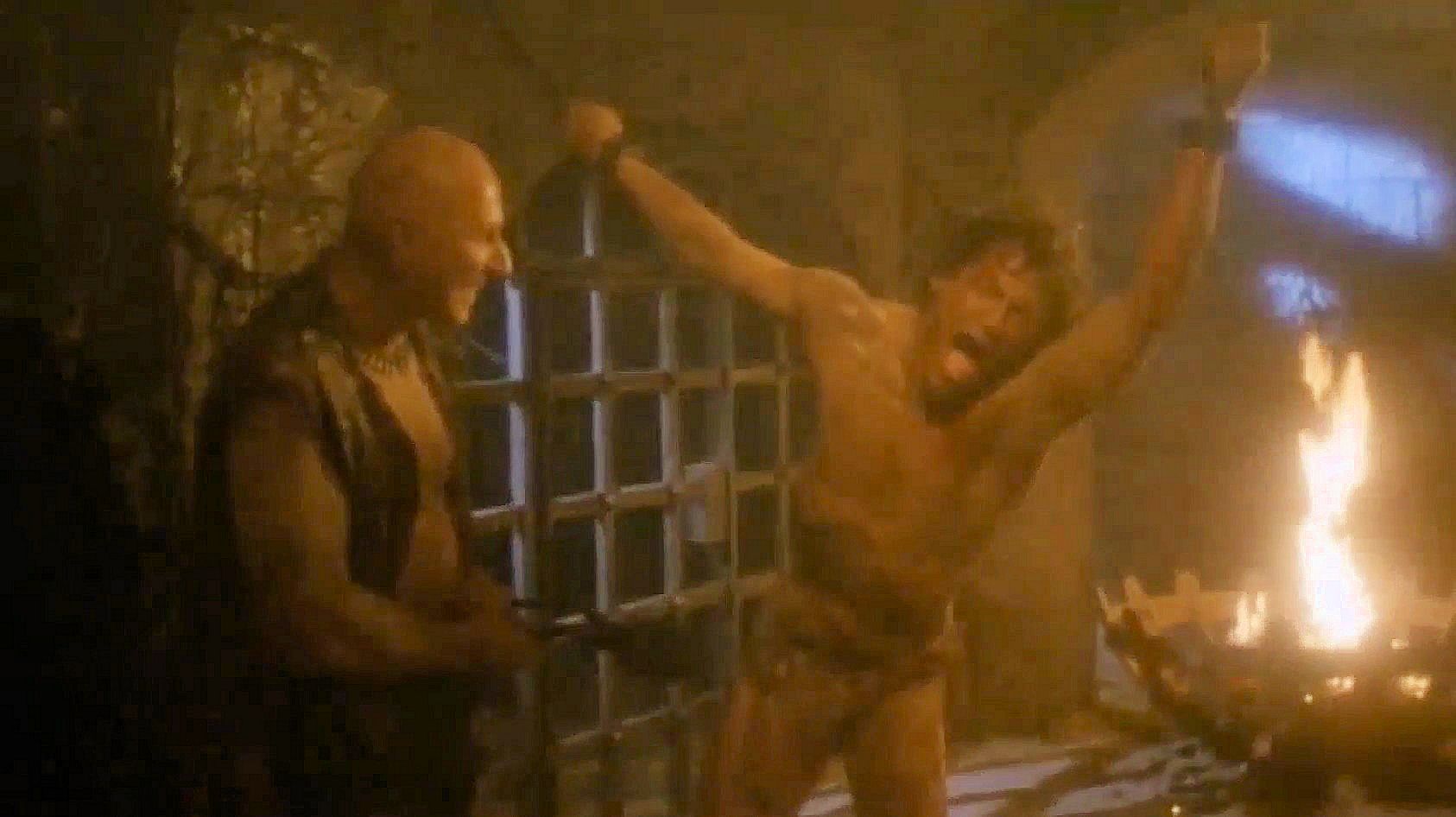 Prince Mikah (MacCorkindale) is imprisoned in a dungeon; the hero, Talon (Horsley), is staked to the wall at a wedding.