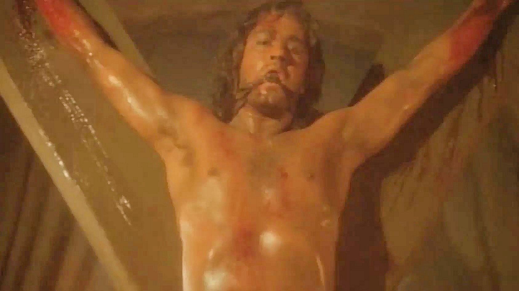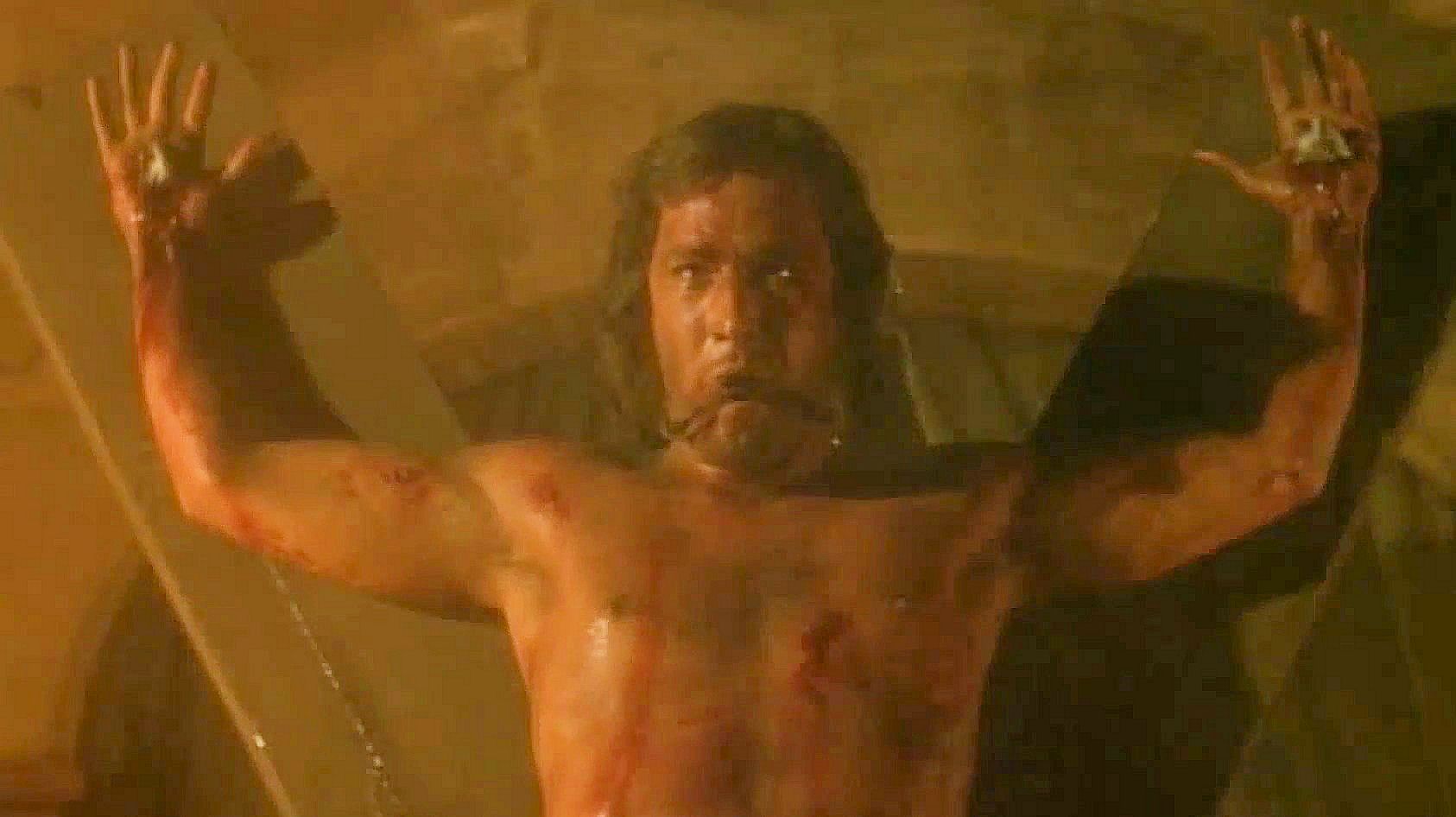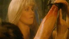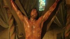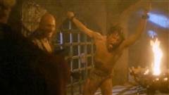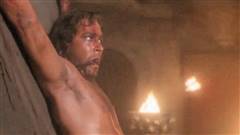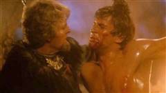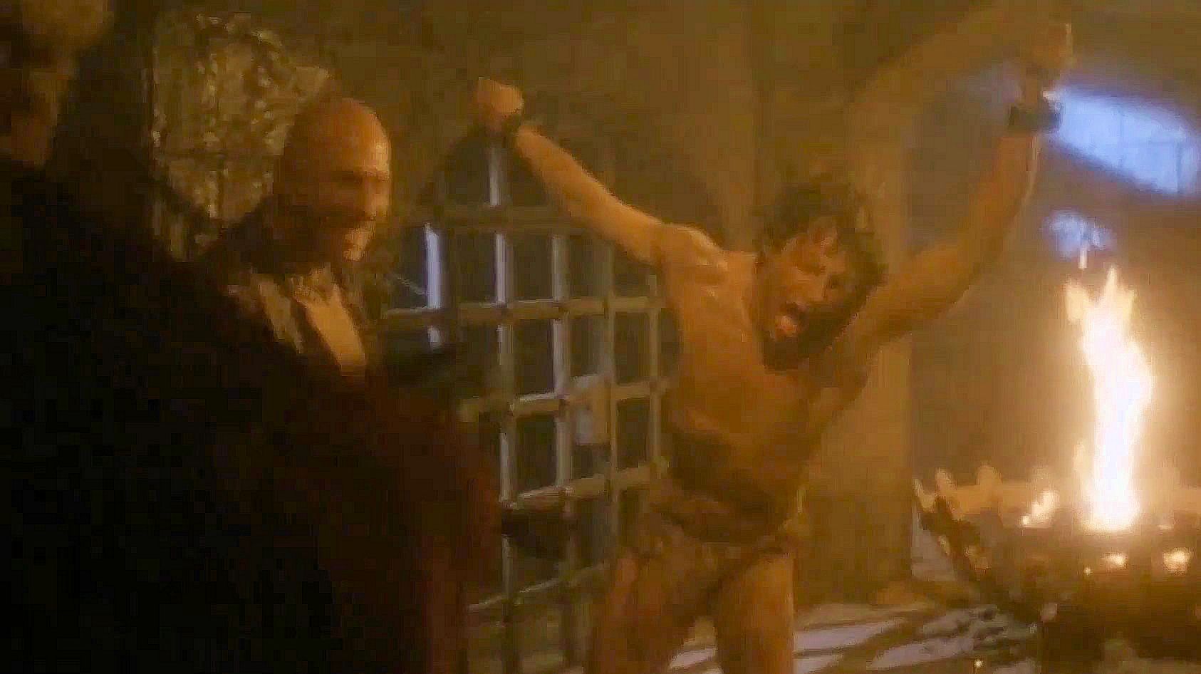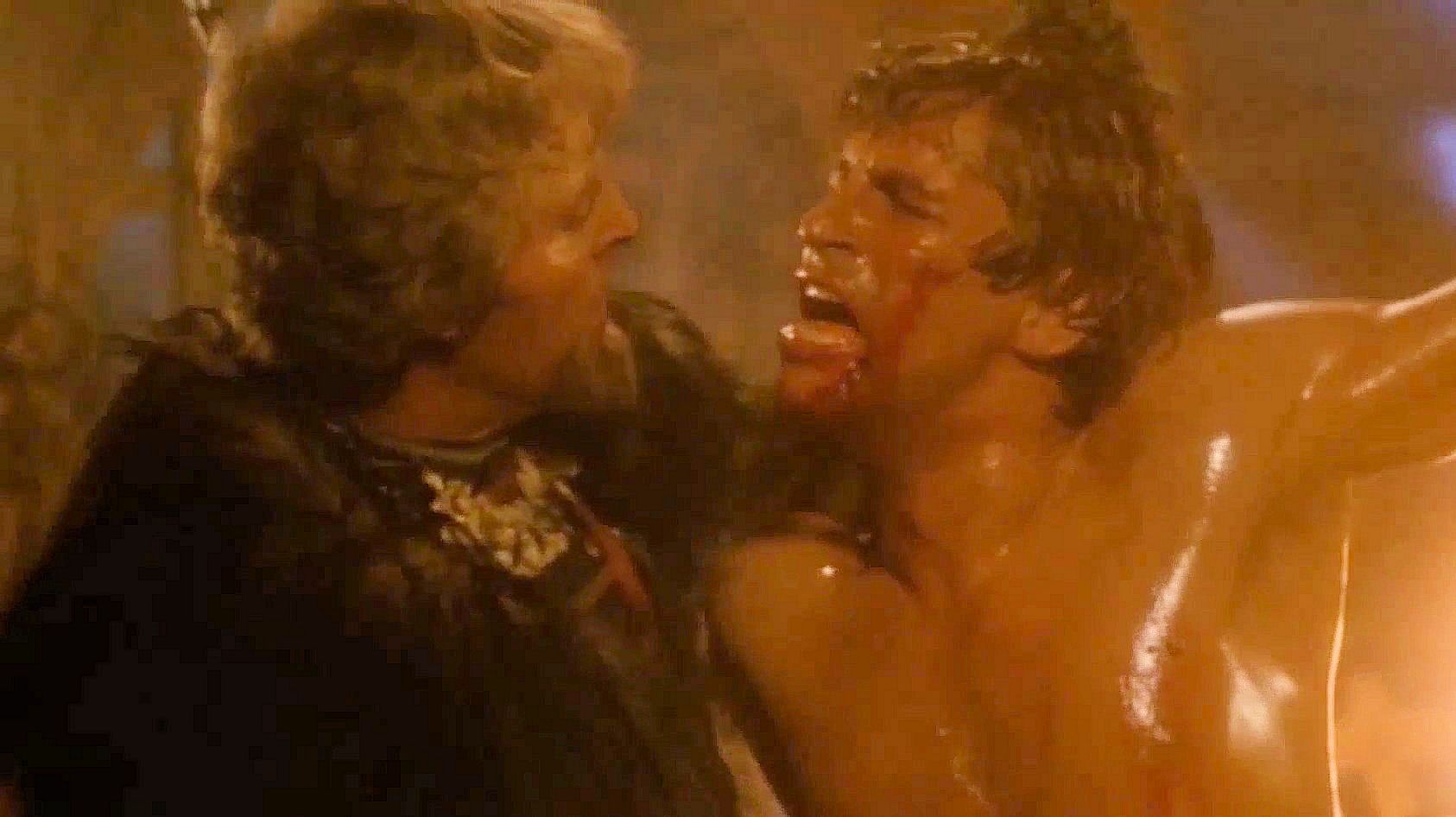 Prince Mikah (MacCorkindale) is imprisoned in a dungeon; the hero, Talon (Horsley), is staked to the wall at a wedding.