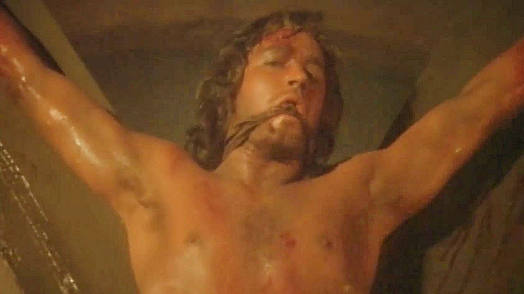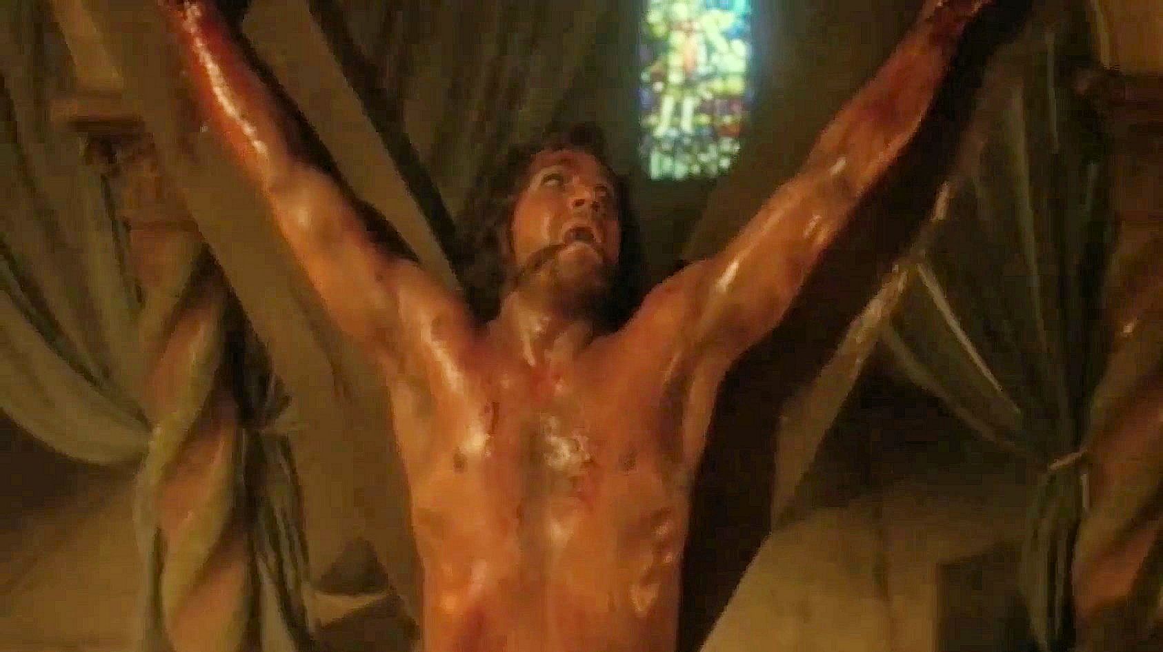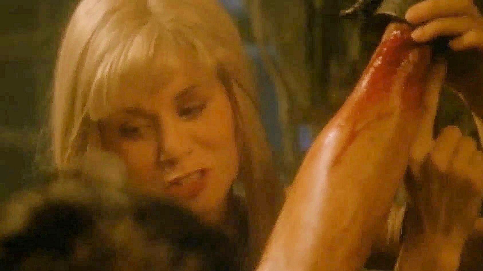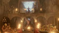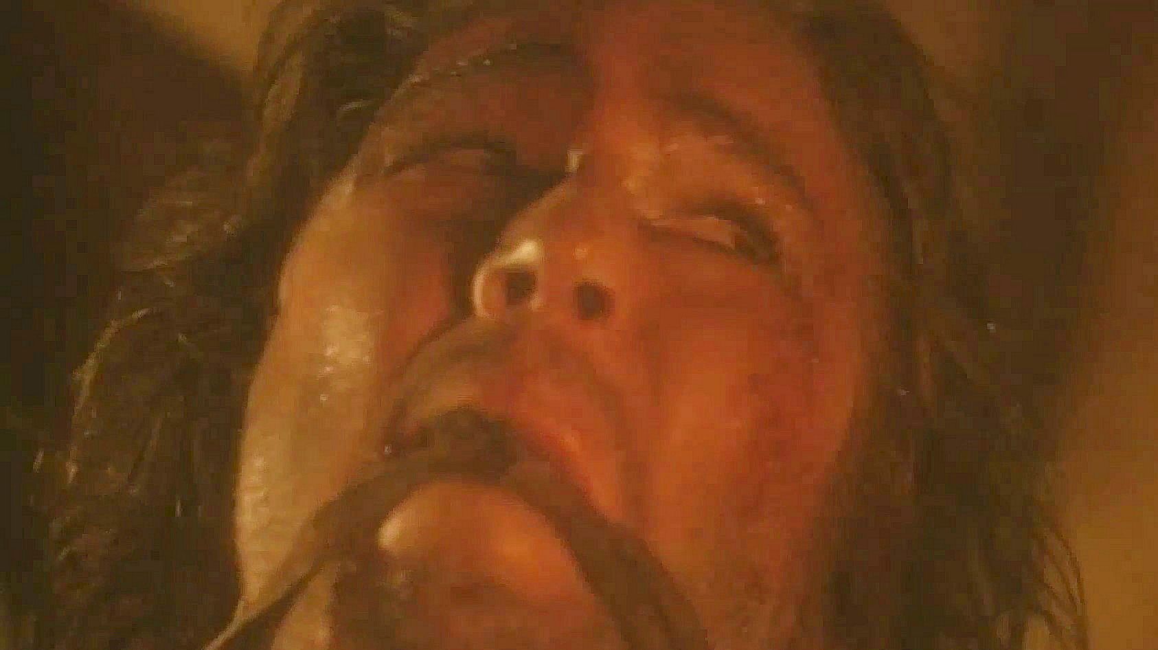 Prince Mikah (MacCorkindale) is imprisoned in a dungeon; the hero, Talon (Horsley), is staked to the wall at a wedding.