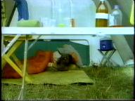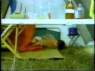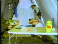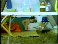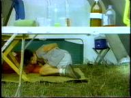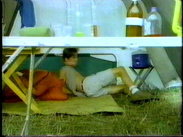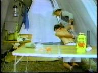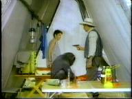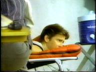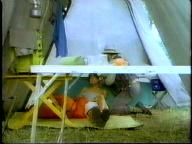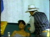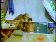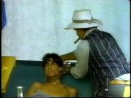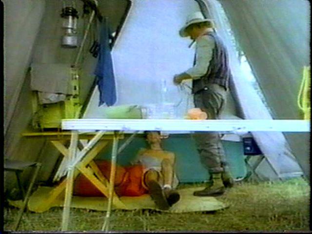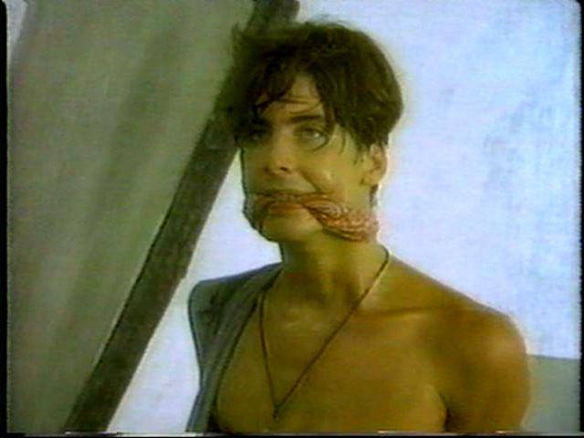Sean is cornered by the bad guy and tied up on a cot. He struggles mightily, but the bad guy returns and ties him by his neck to the cot. Of course, Tarzan eventually shows up to rescue him.