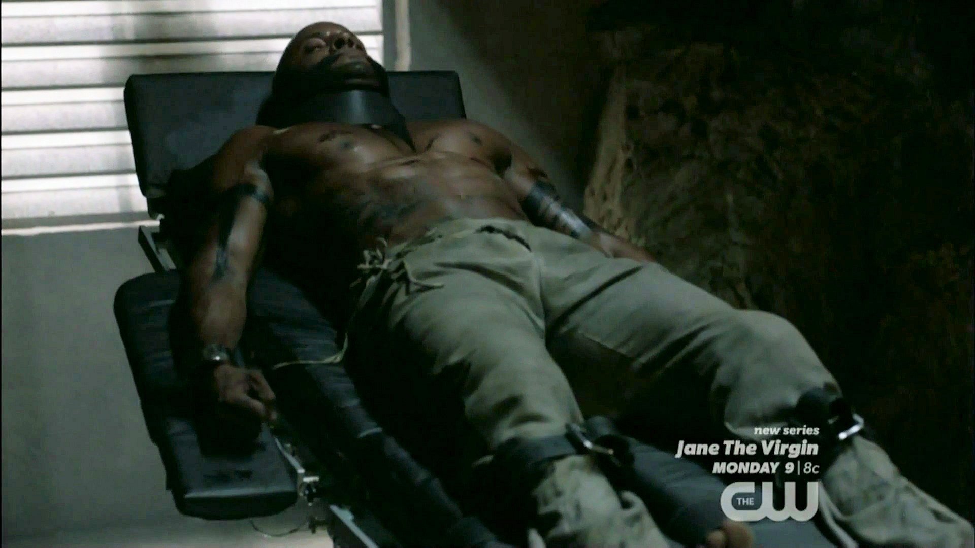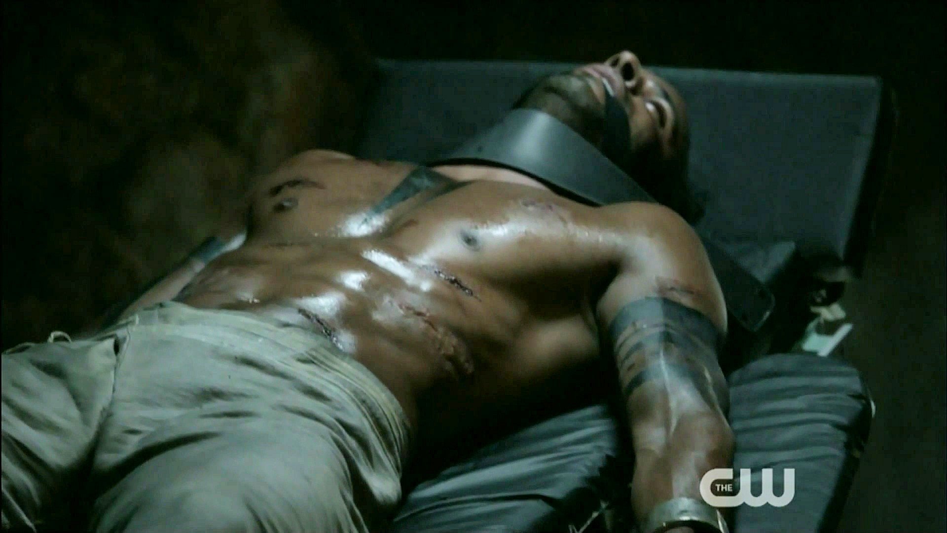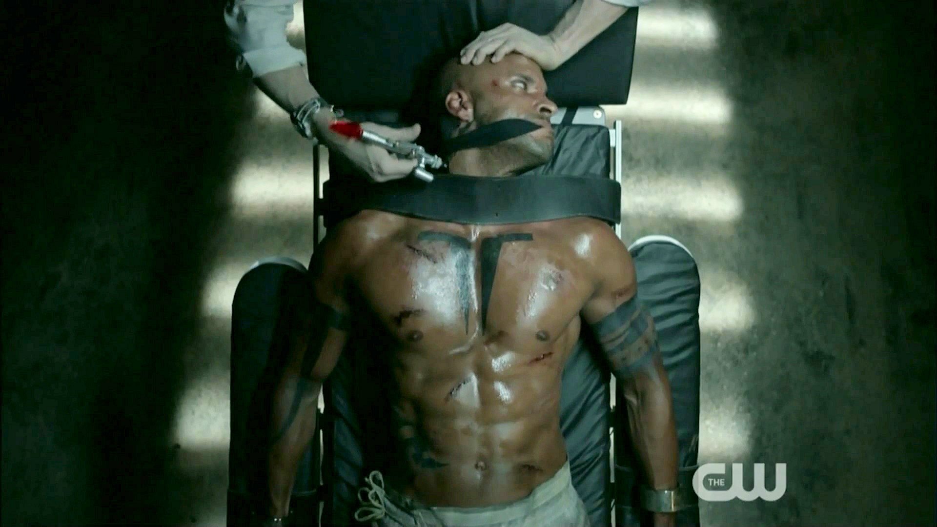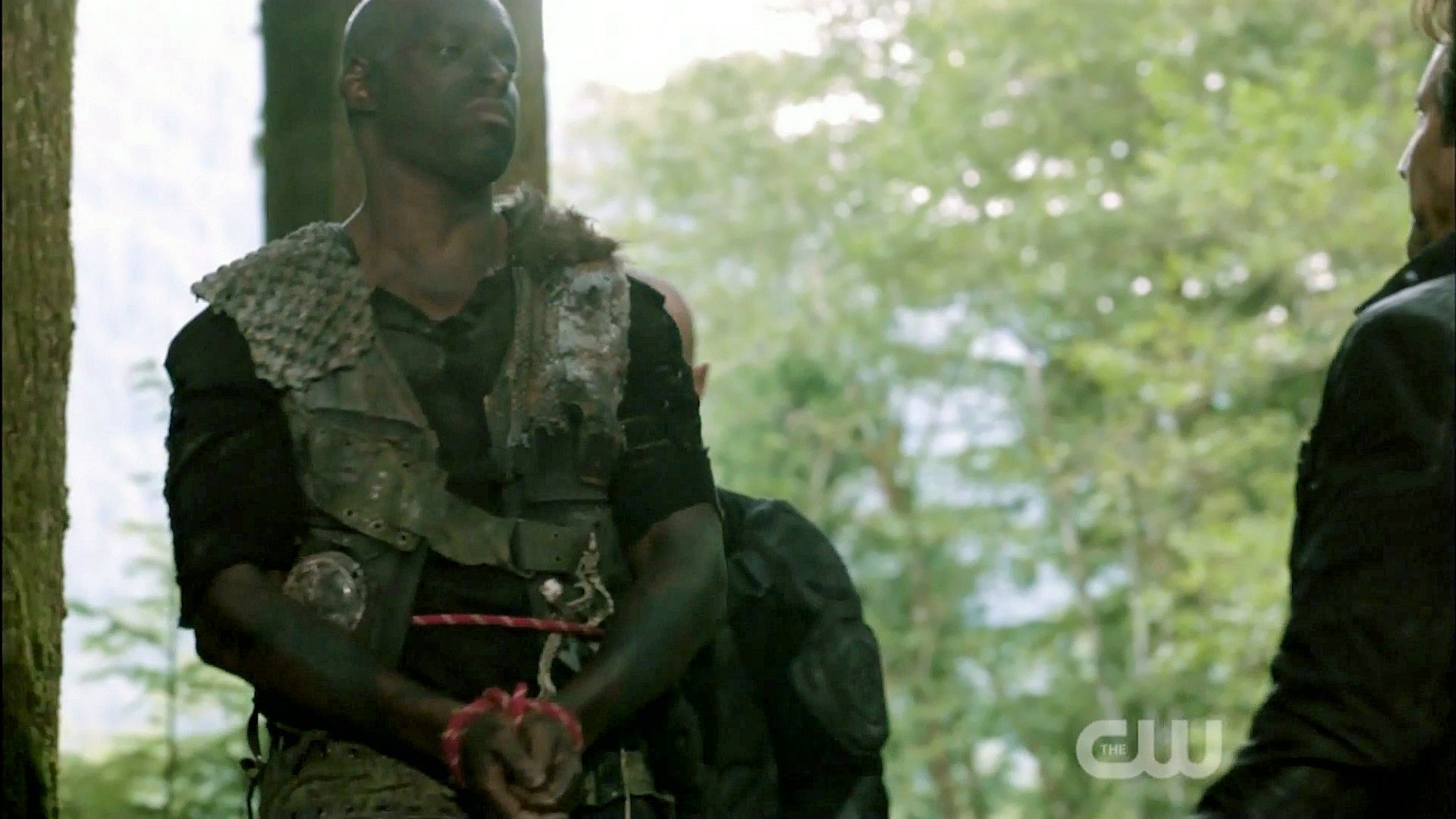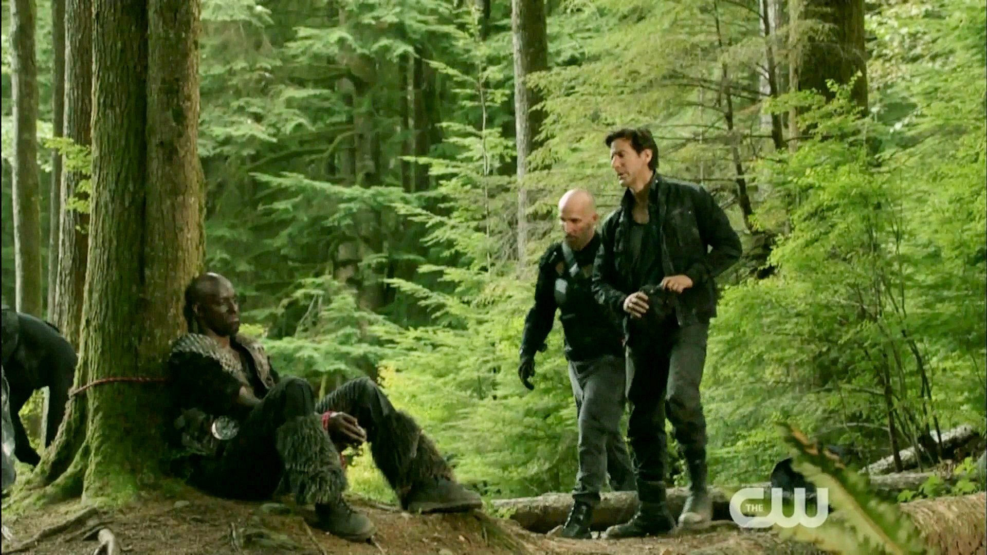 Rivo (Lawrence) leads Kane and two guards to the grounder village; Lincoln (Whittle) is drugged and tortured in Mount Weather.