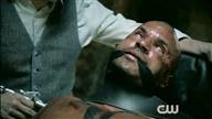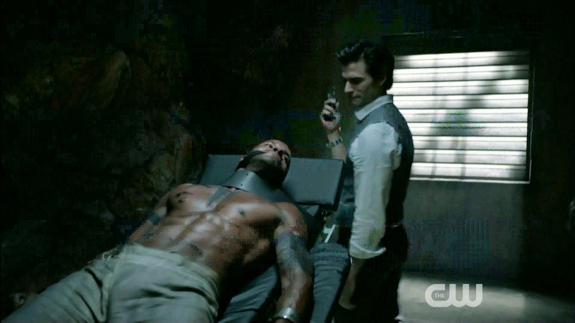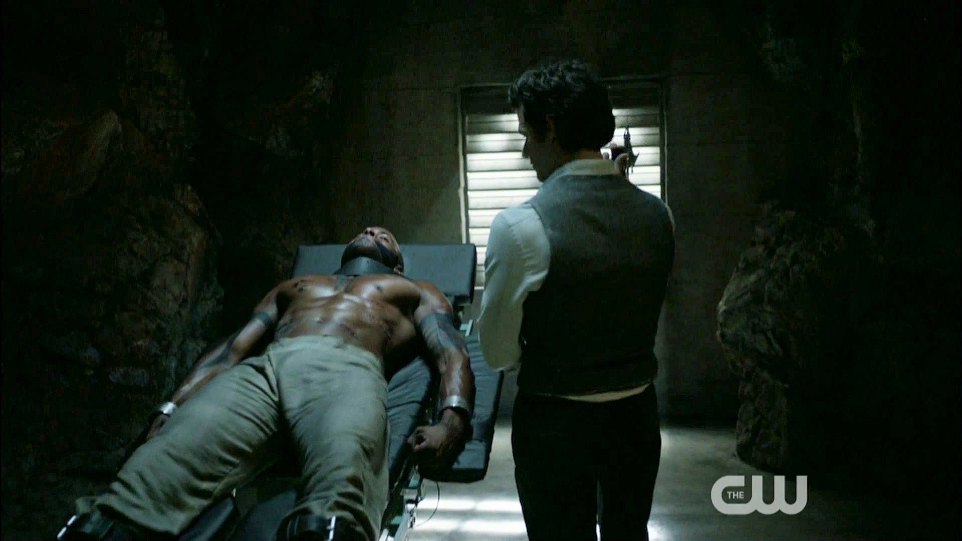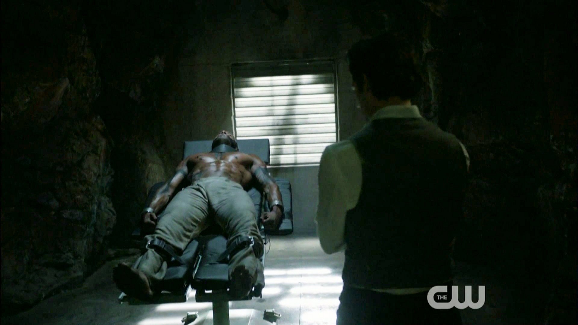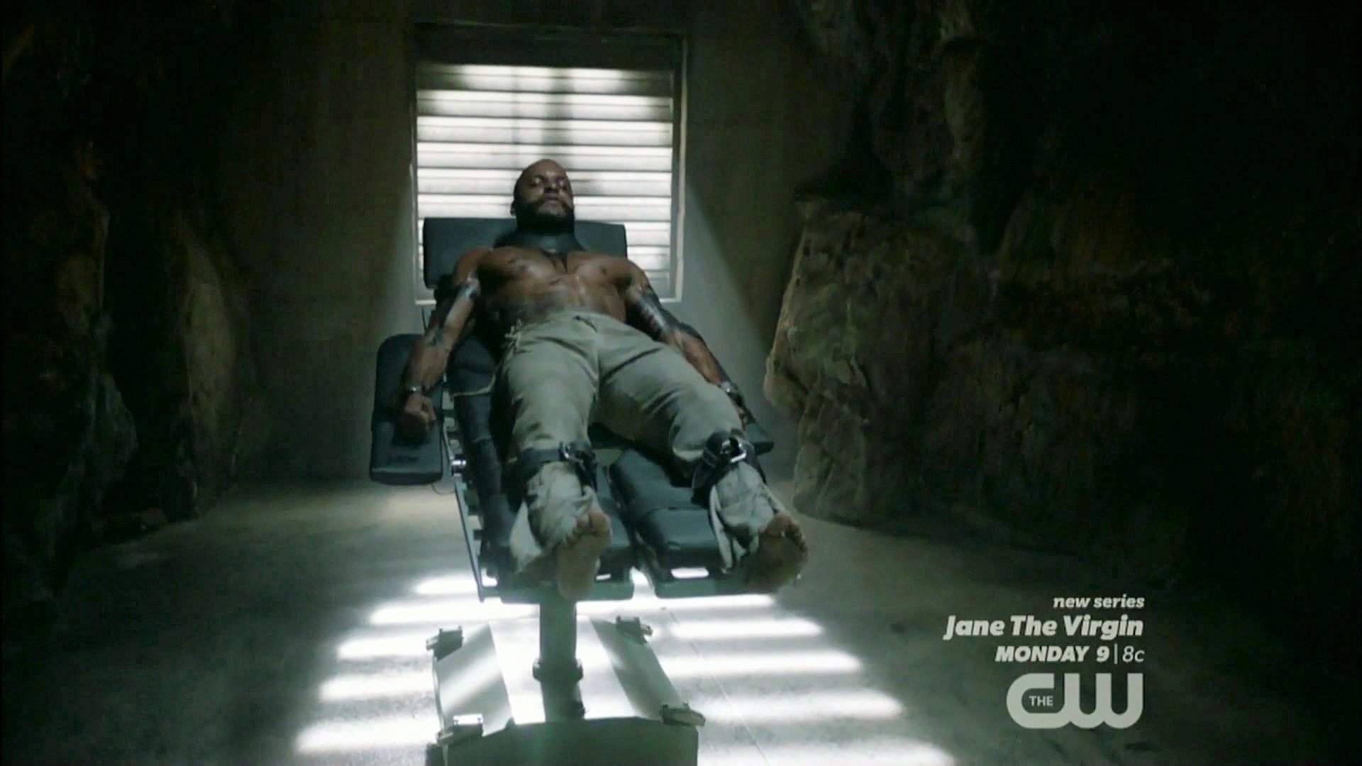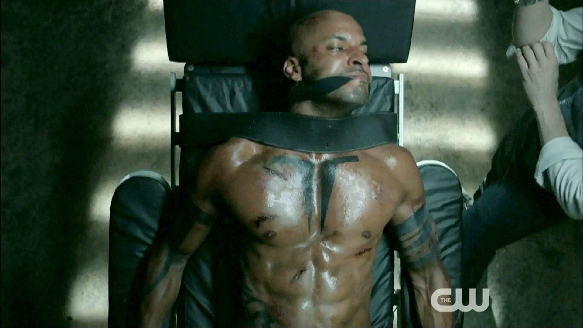 Rivo (Lawrence) leads Kane and two guards to the grounder village; Lincoln (Whittle) is drugged and tortured in Mount Weather.