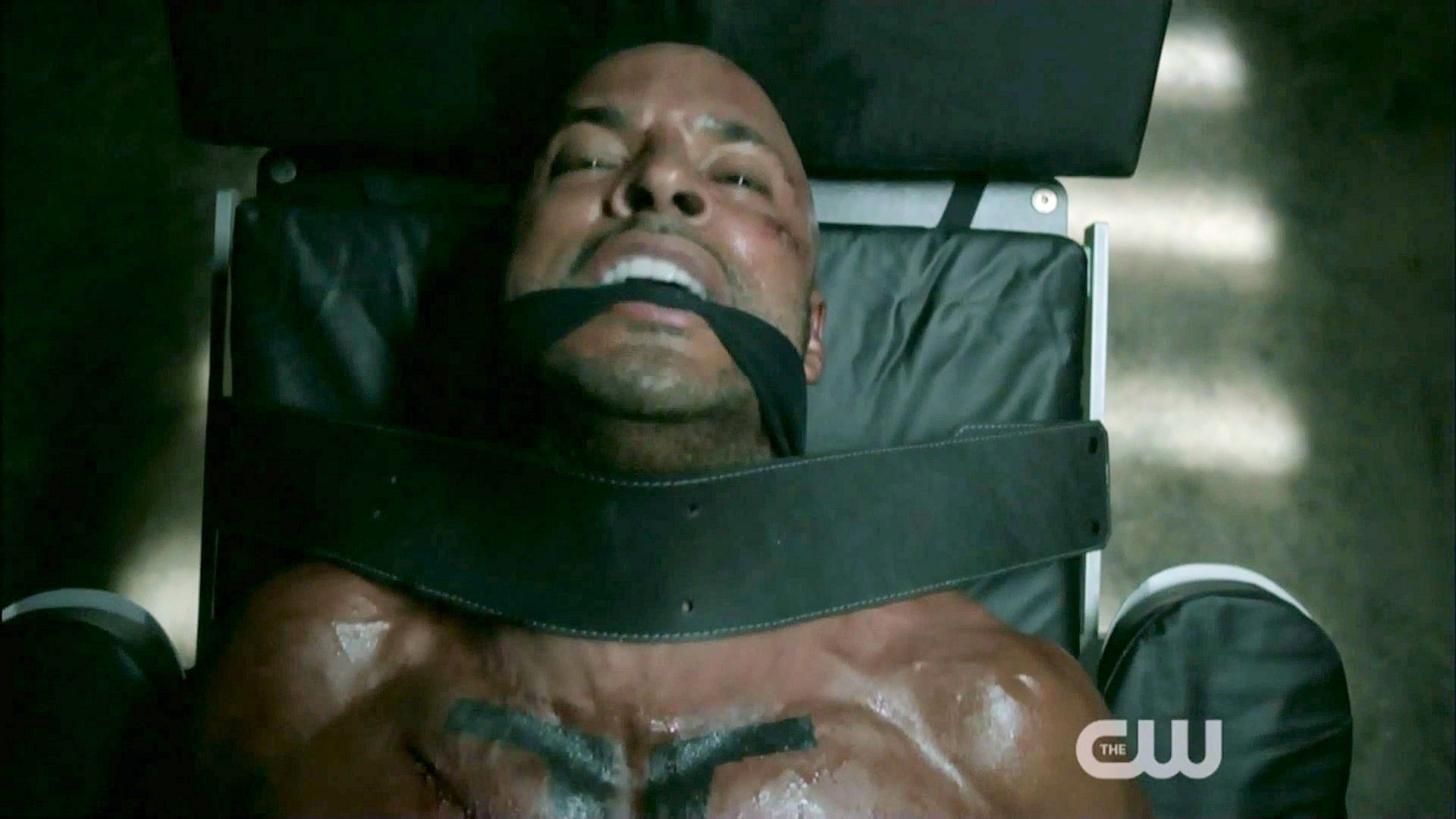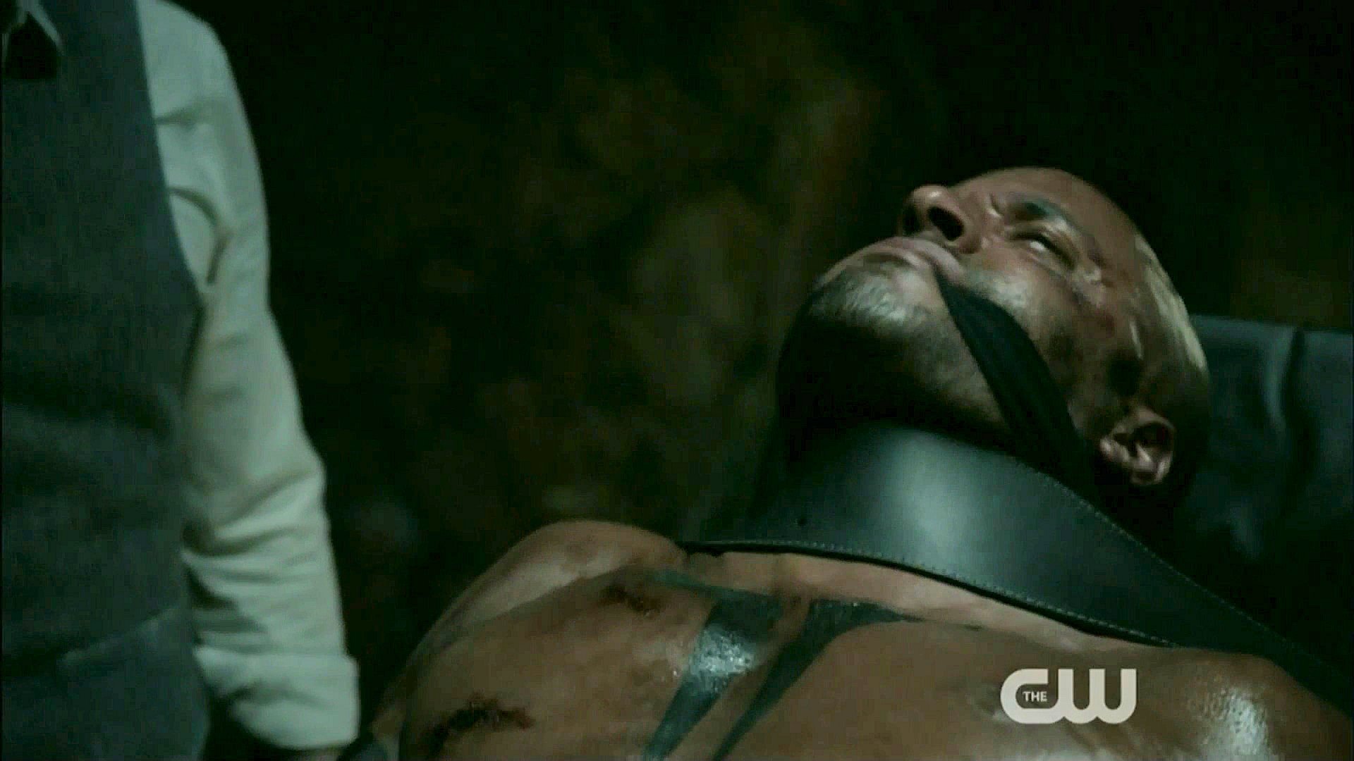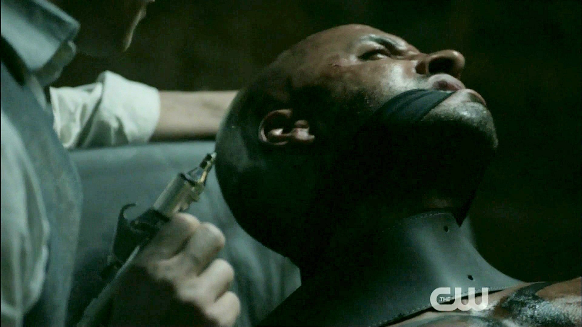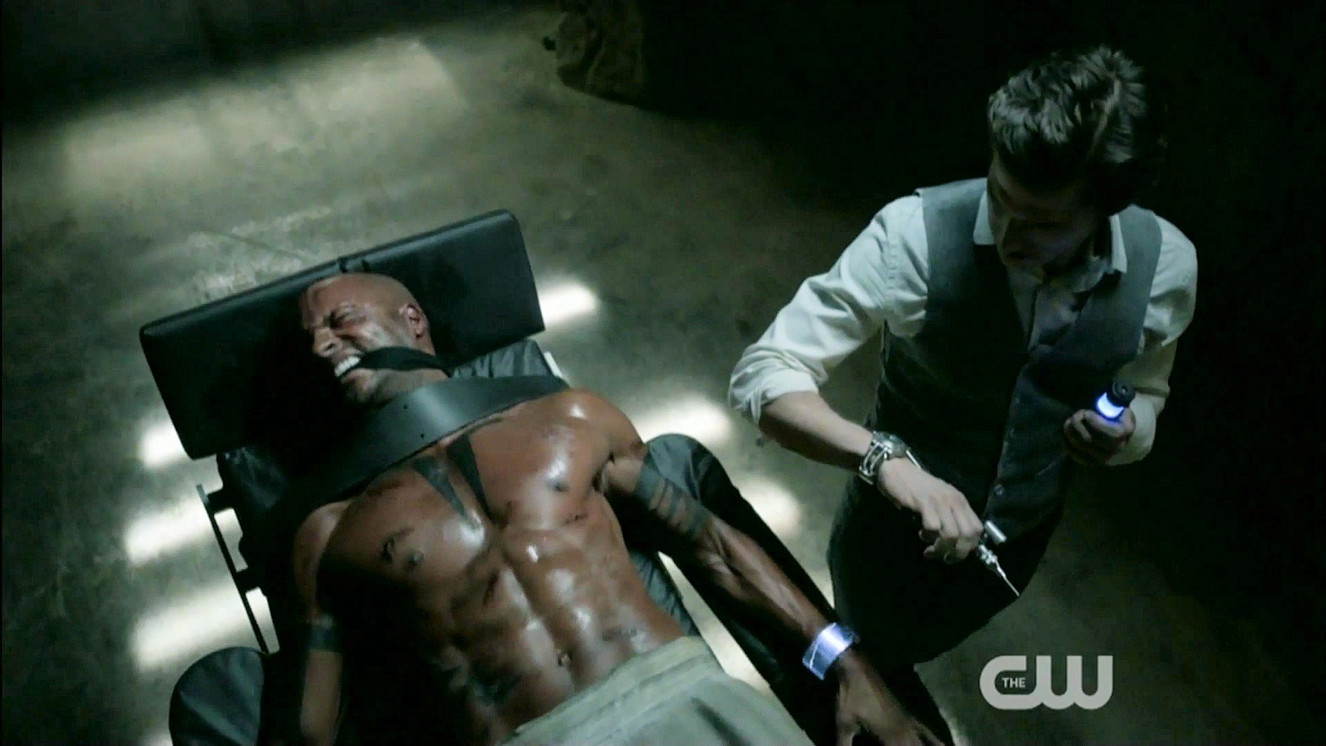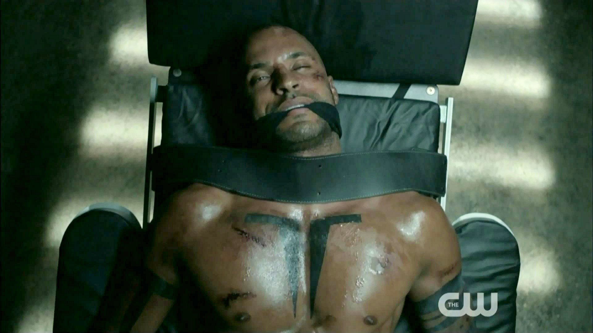 Rivo (Lawrence) leads Kane and two guards to the grounder village; Lincoln (Whittle) is drugged and tortured in Mount Weather.