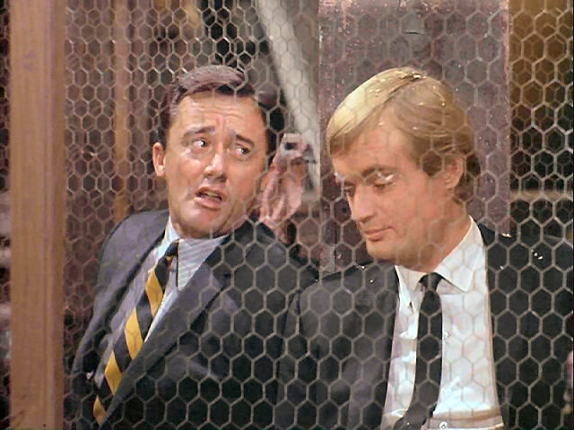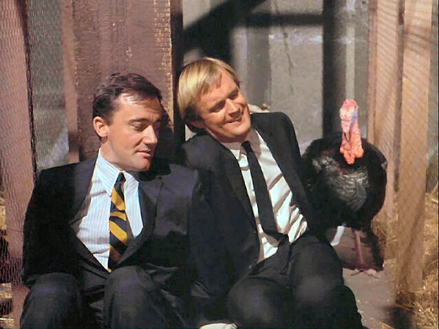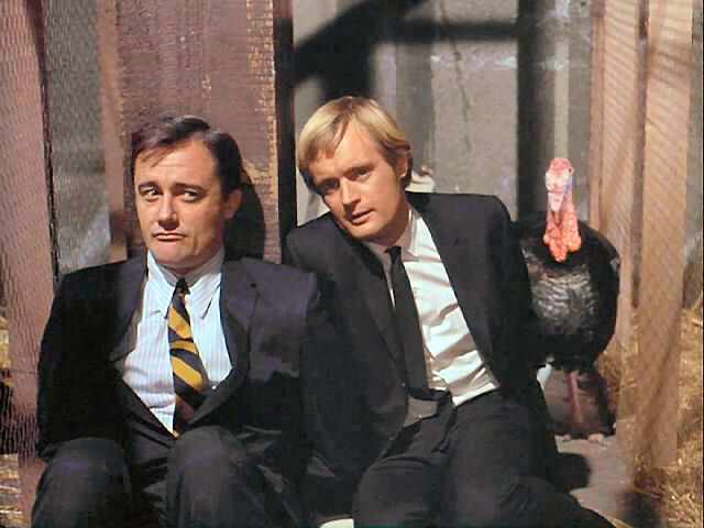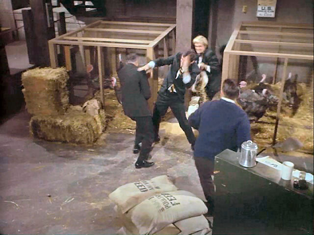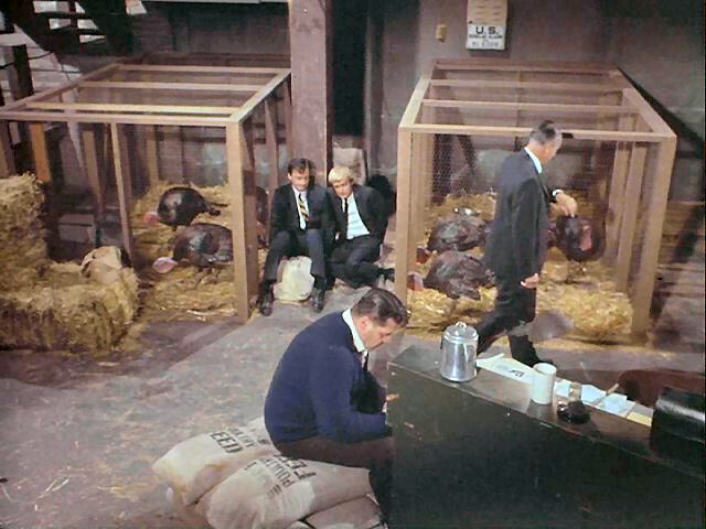 Illya and Solo are stashed away along with some Christmas turkeys. They escape when one of the turkeys