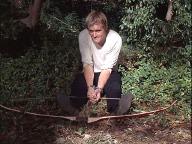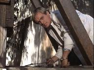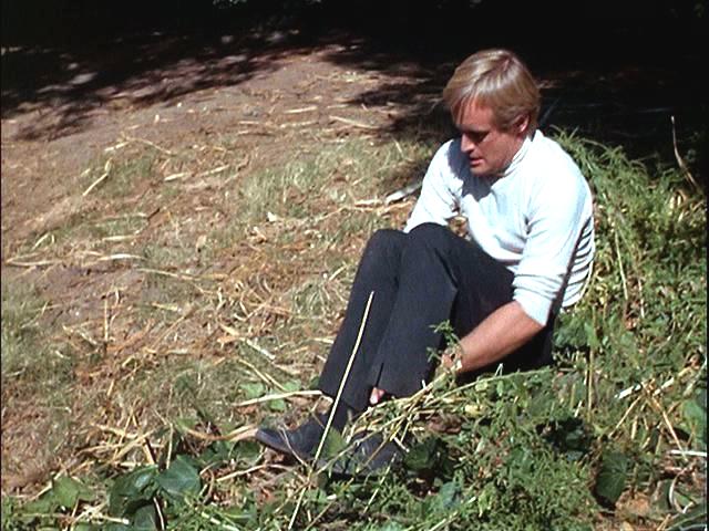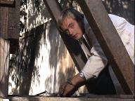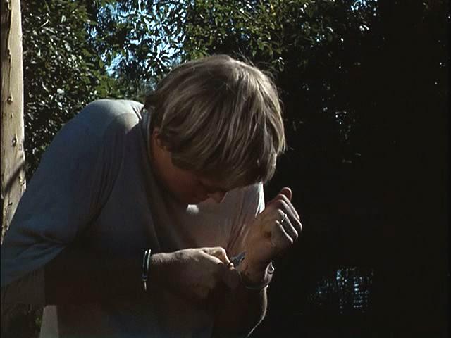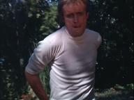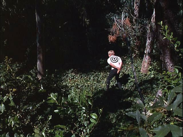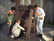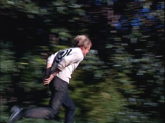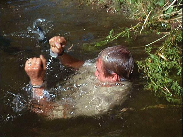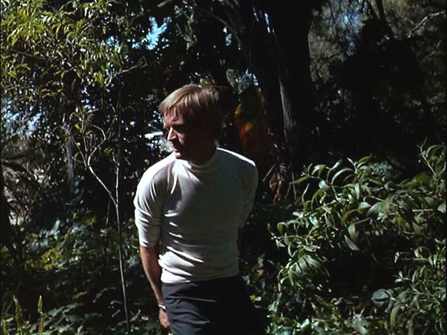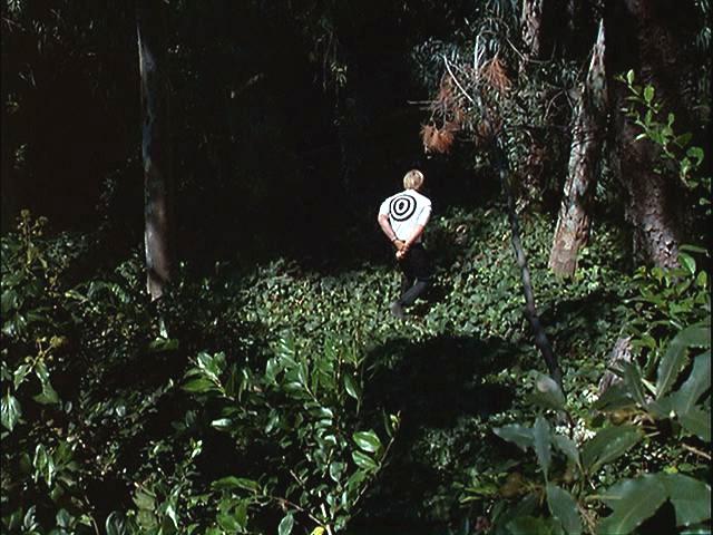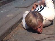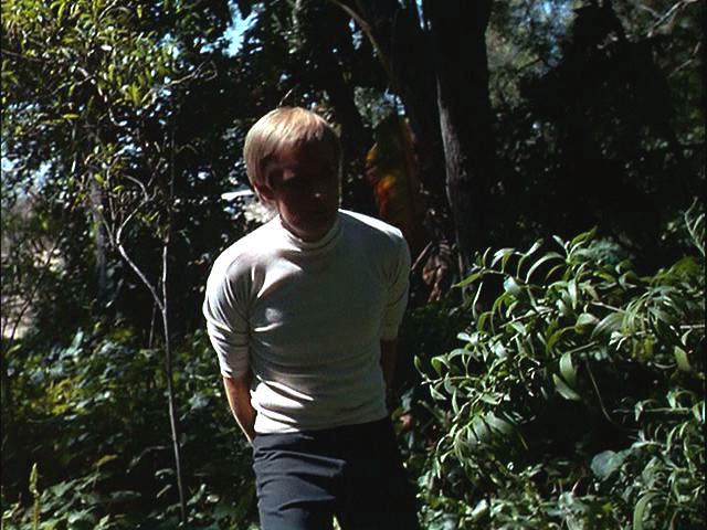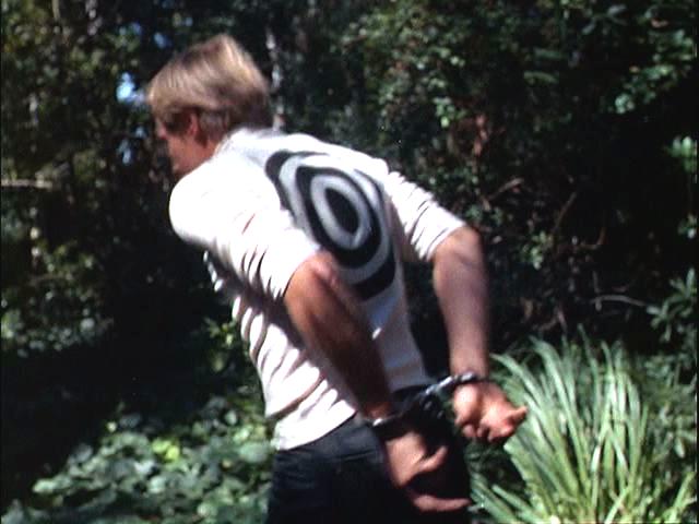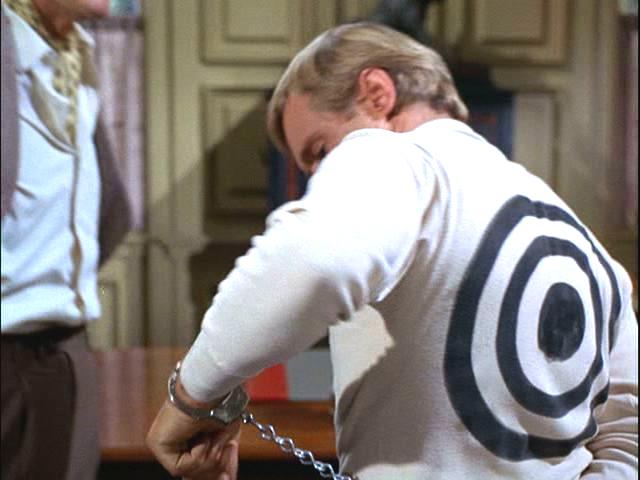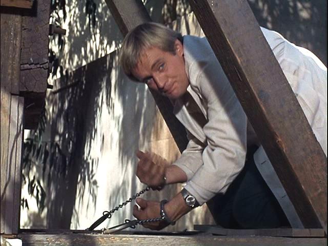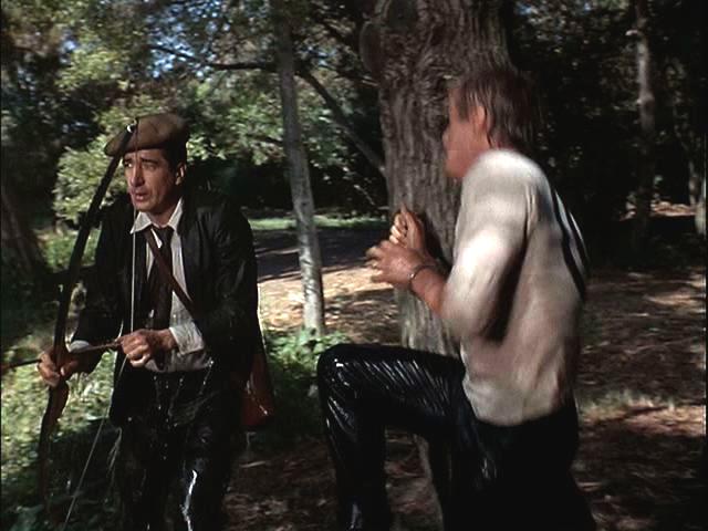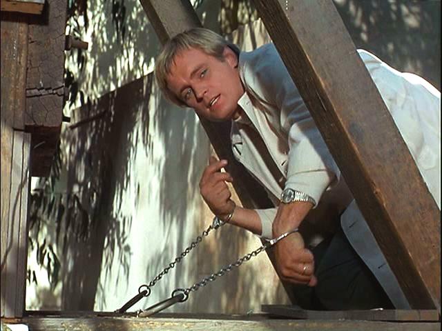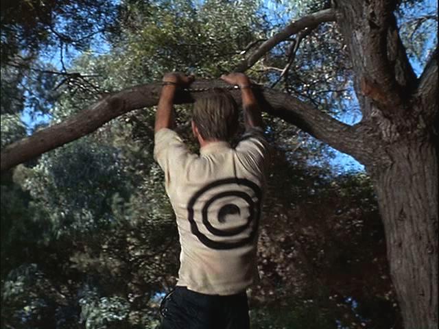 Illya is handcuffed and, with a target painted on his back, is hunted through the woods. Later, he's put under a guillotine.