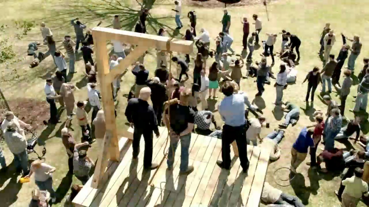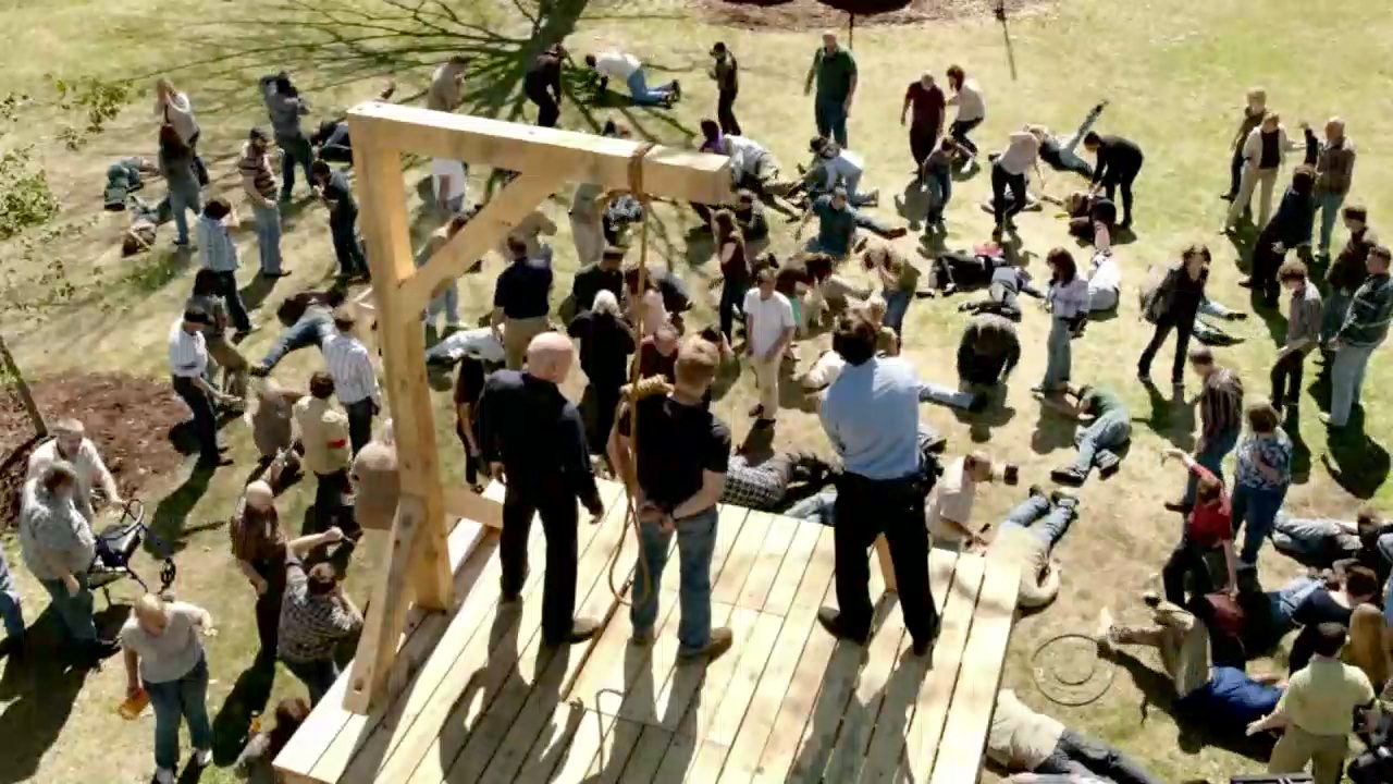 A huge electromagnetic pulse interrupts Barbie's execution. When it begins attracting Barbie's handcuffs along with other