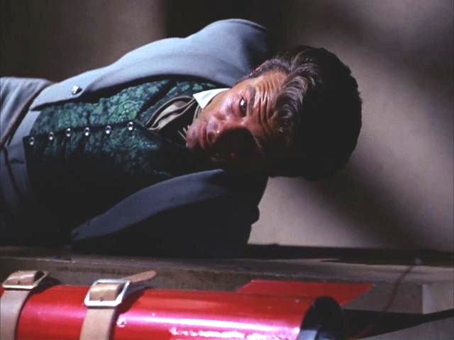 The villian's henchmen have tied Jim to a rocket-propelled rail cart.