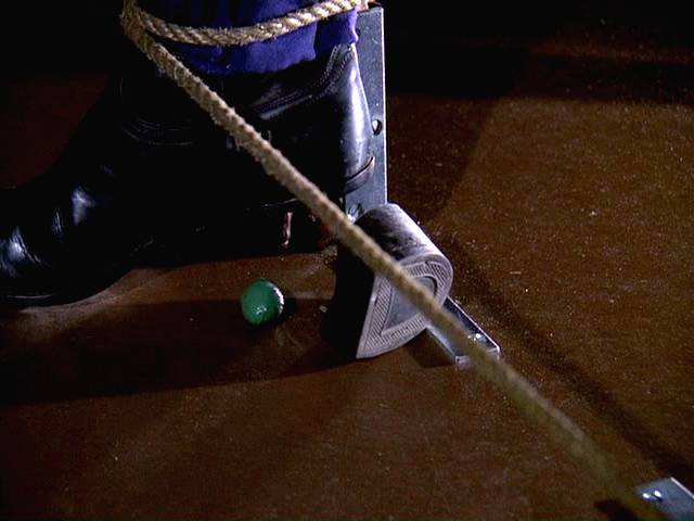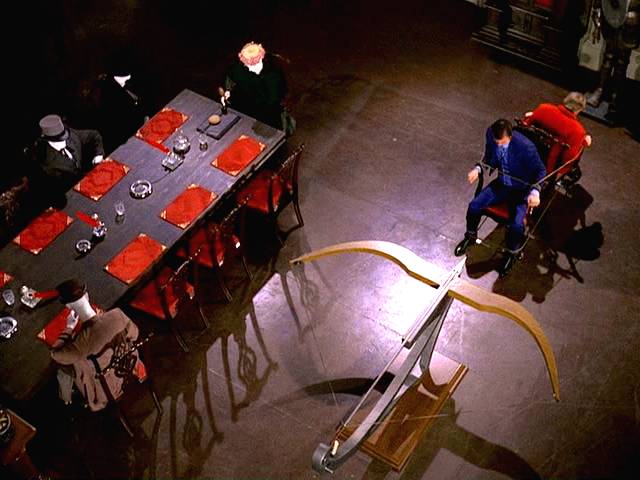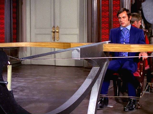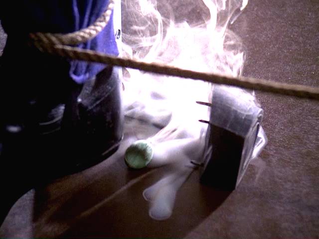 While Jim is trying to rescue the son of the founder of a defense company, the two are targeted by a huge crossbow with a candle burning through the rope holding it.