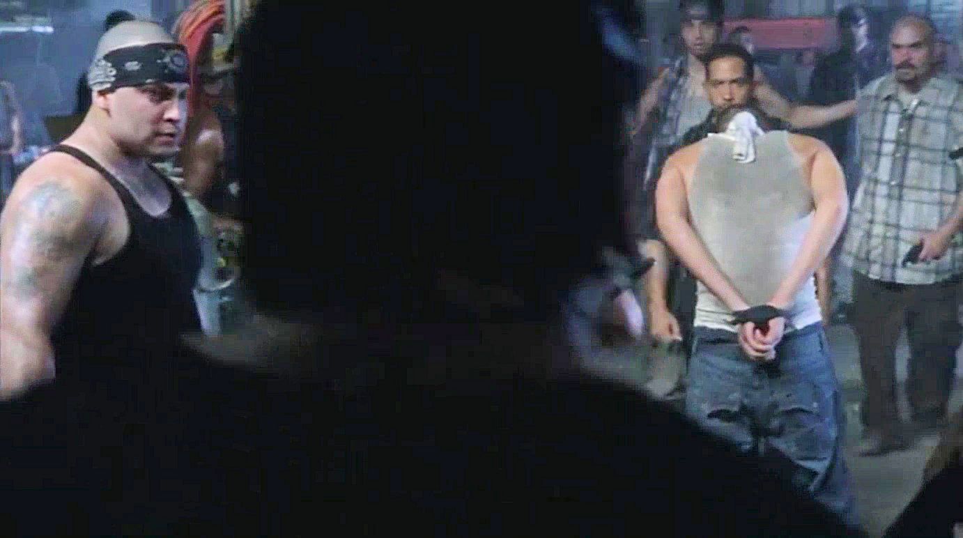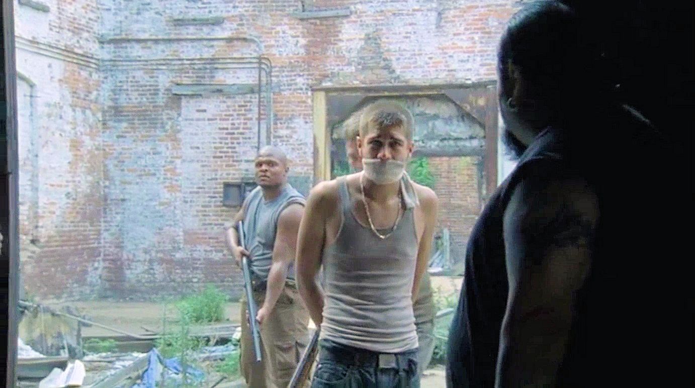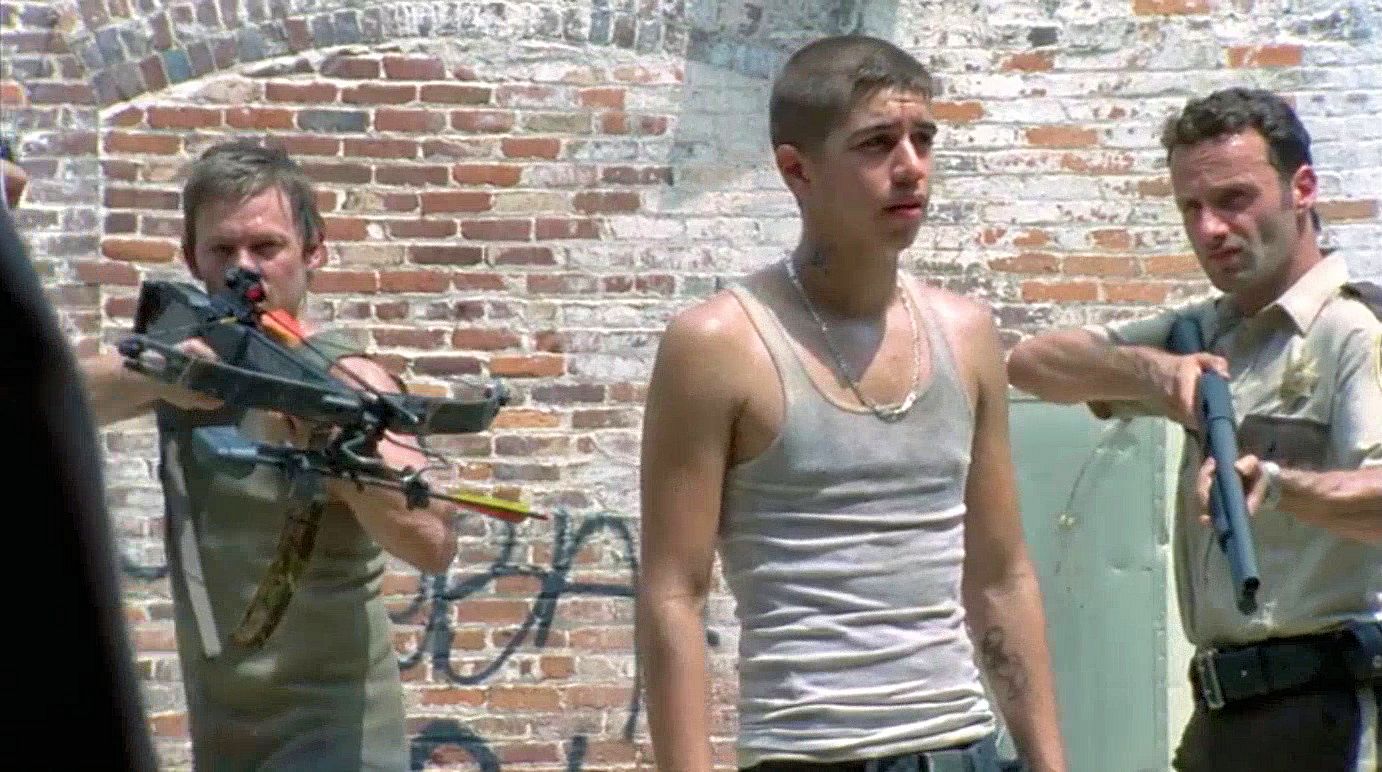 Jim (Rothenberg) is tied up at the survivors' camp; when Glenn (Yeun) is kidnapped by the Vatos gang, Rick and Daryl take Miguel (Guajardo) hostage.
