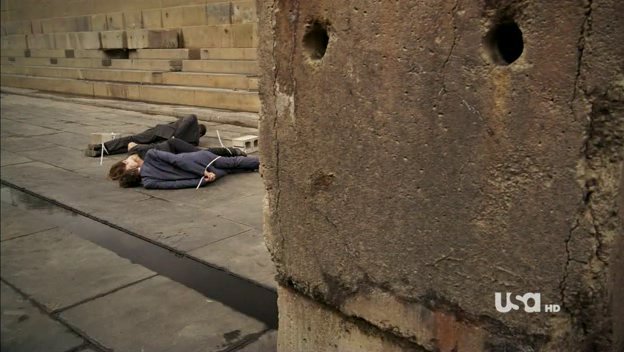 Neal and Peter are drugged by Adler, and find themselves in a drydock tied to cinder blocks, with the valves being opened. They manage to break the zip ties and escape, of course.